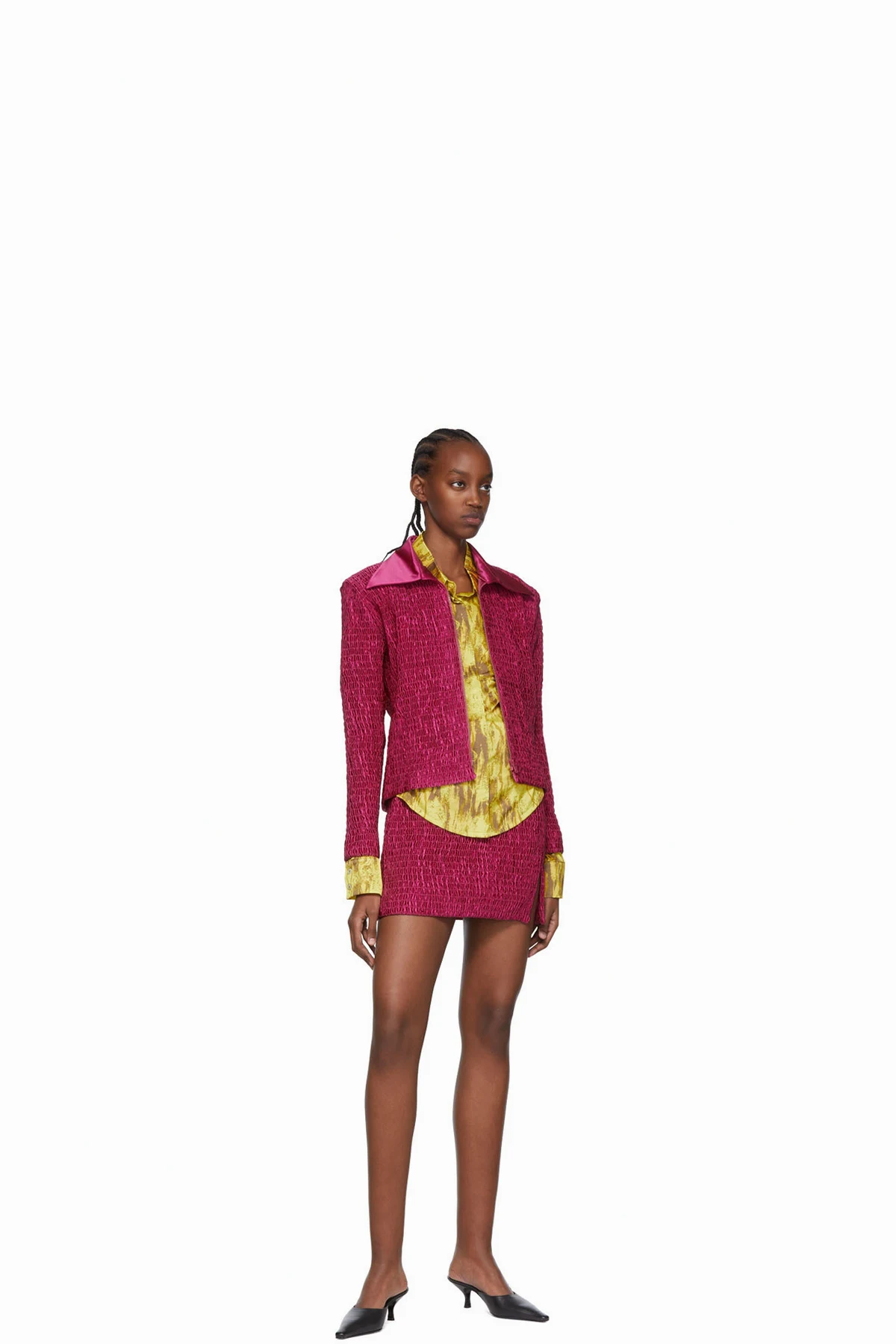 Shirred polyester satin skirt.