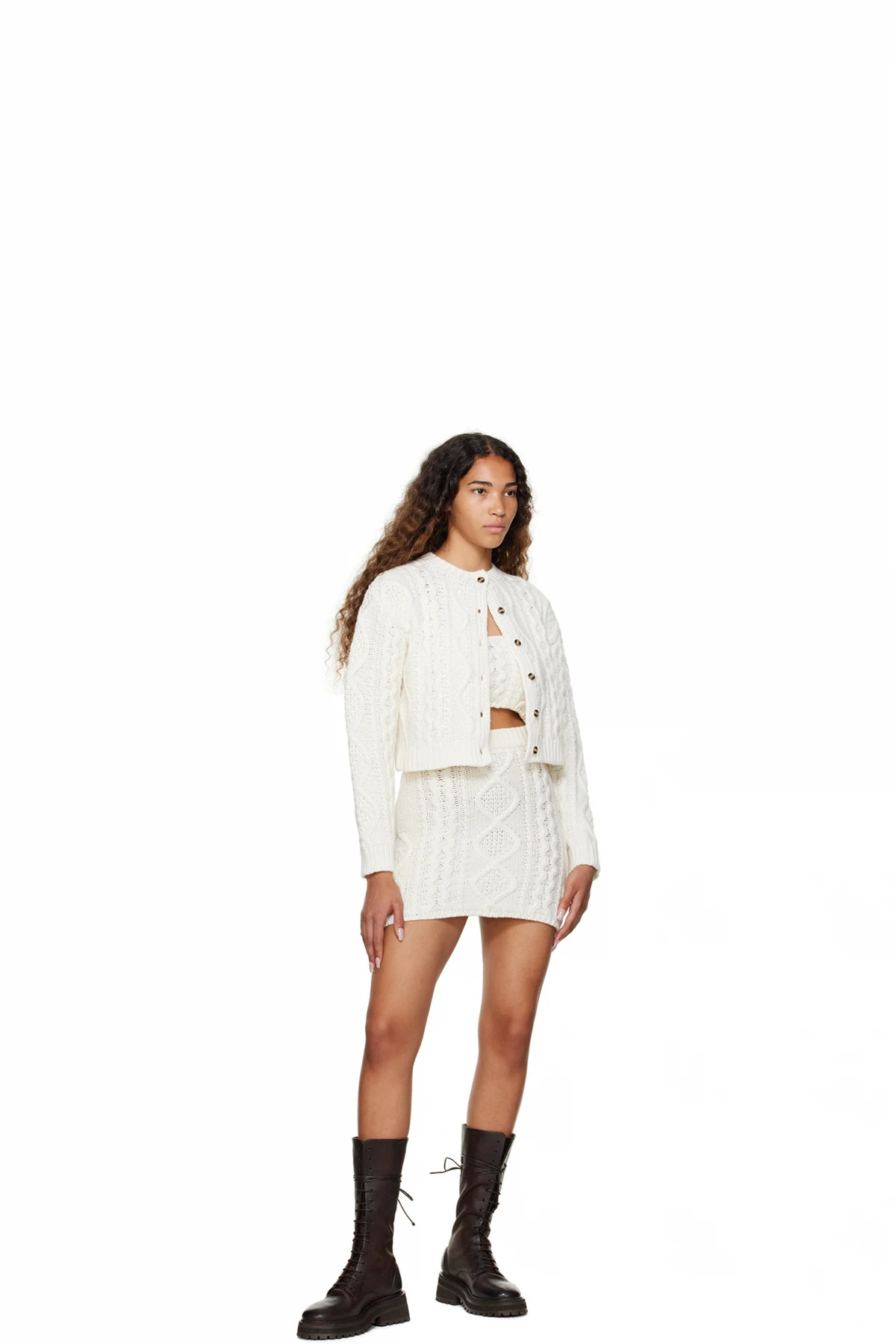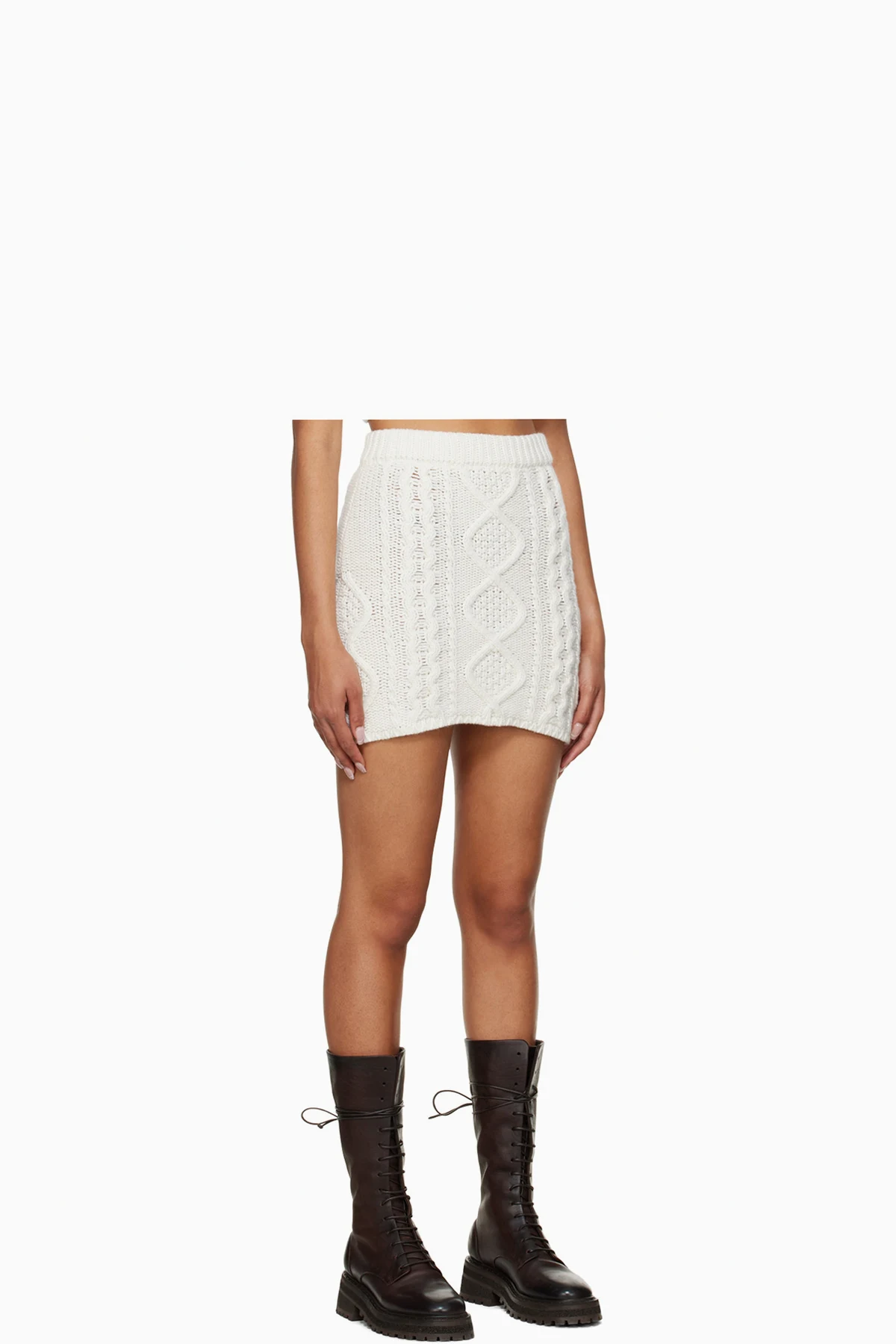 Cable knit nylon and wool-blend skirt. Elasticized waistband.