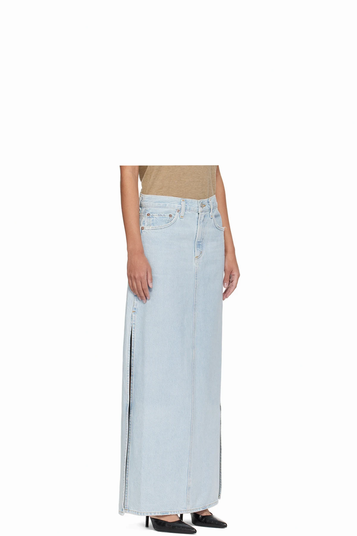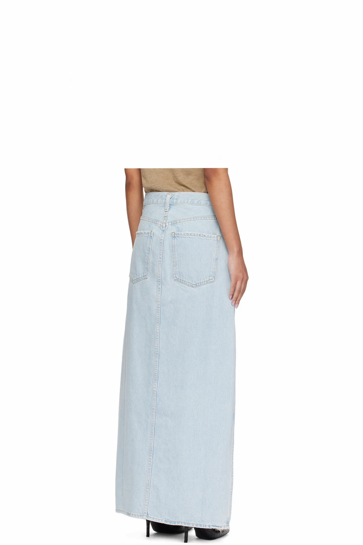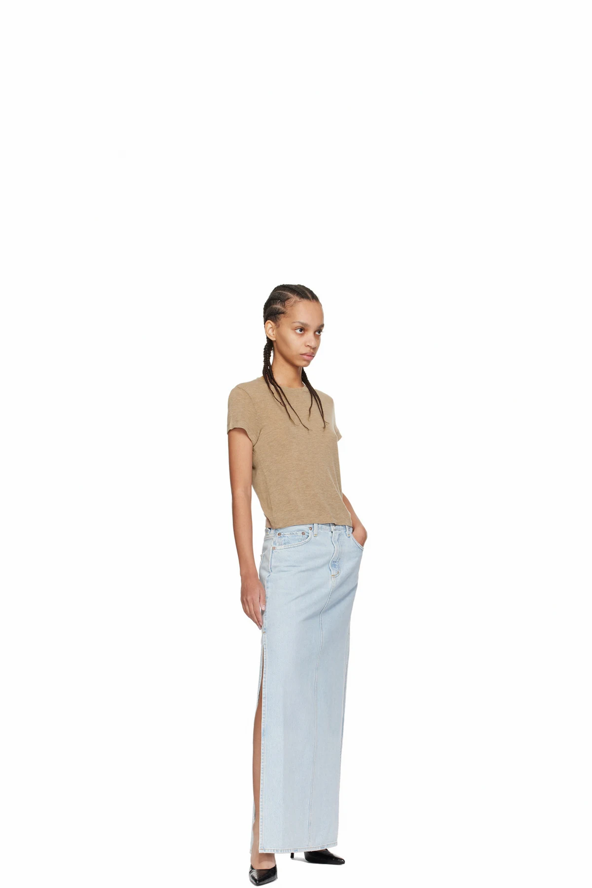 Non-stretch regenerative cotton denim skirt. Fading, whiskering, and subtle distressing throughout.