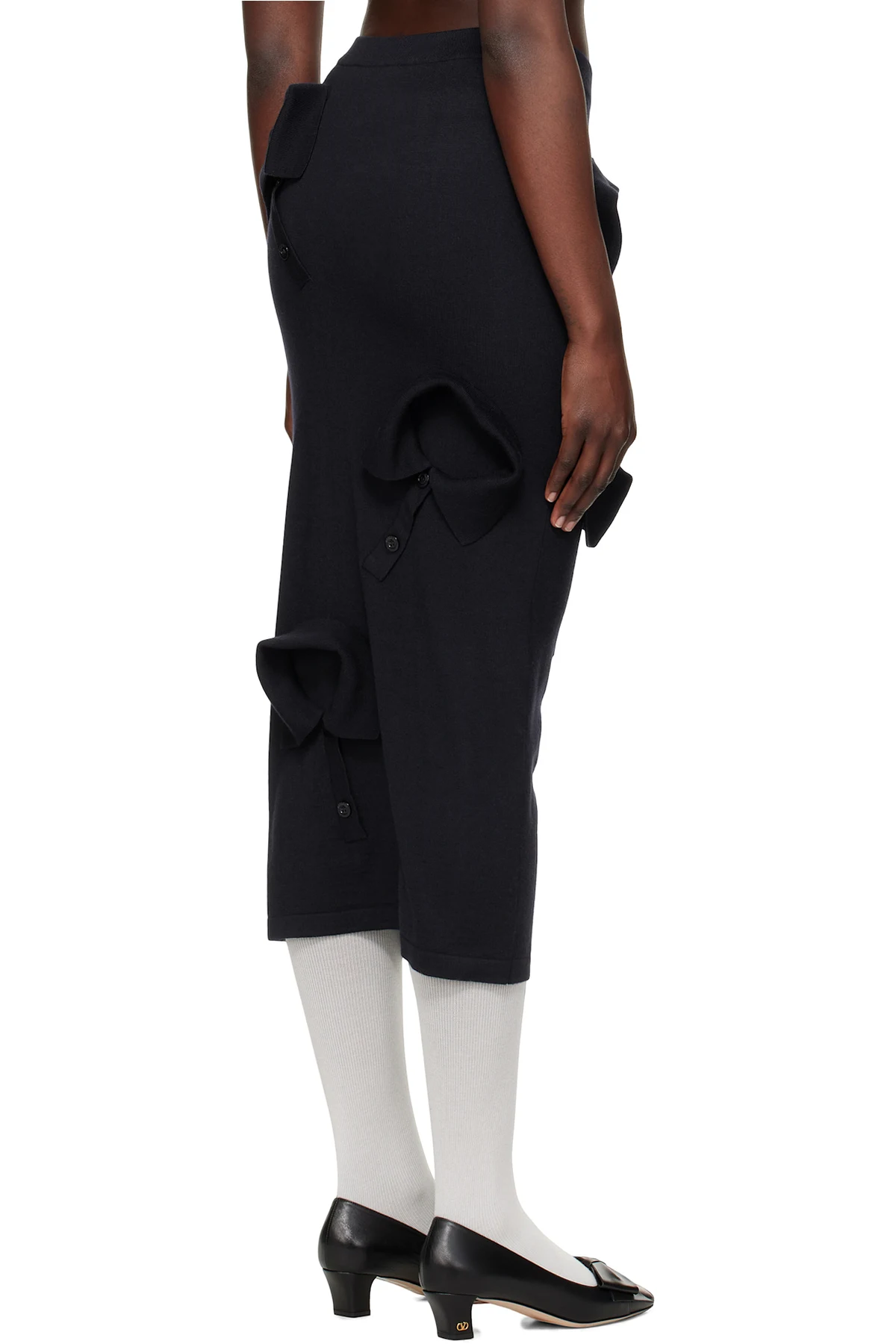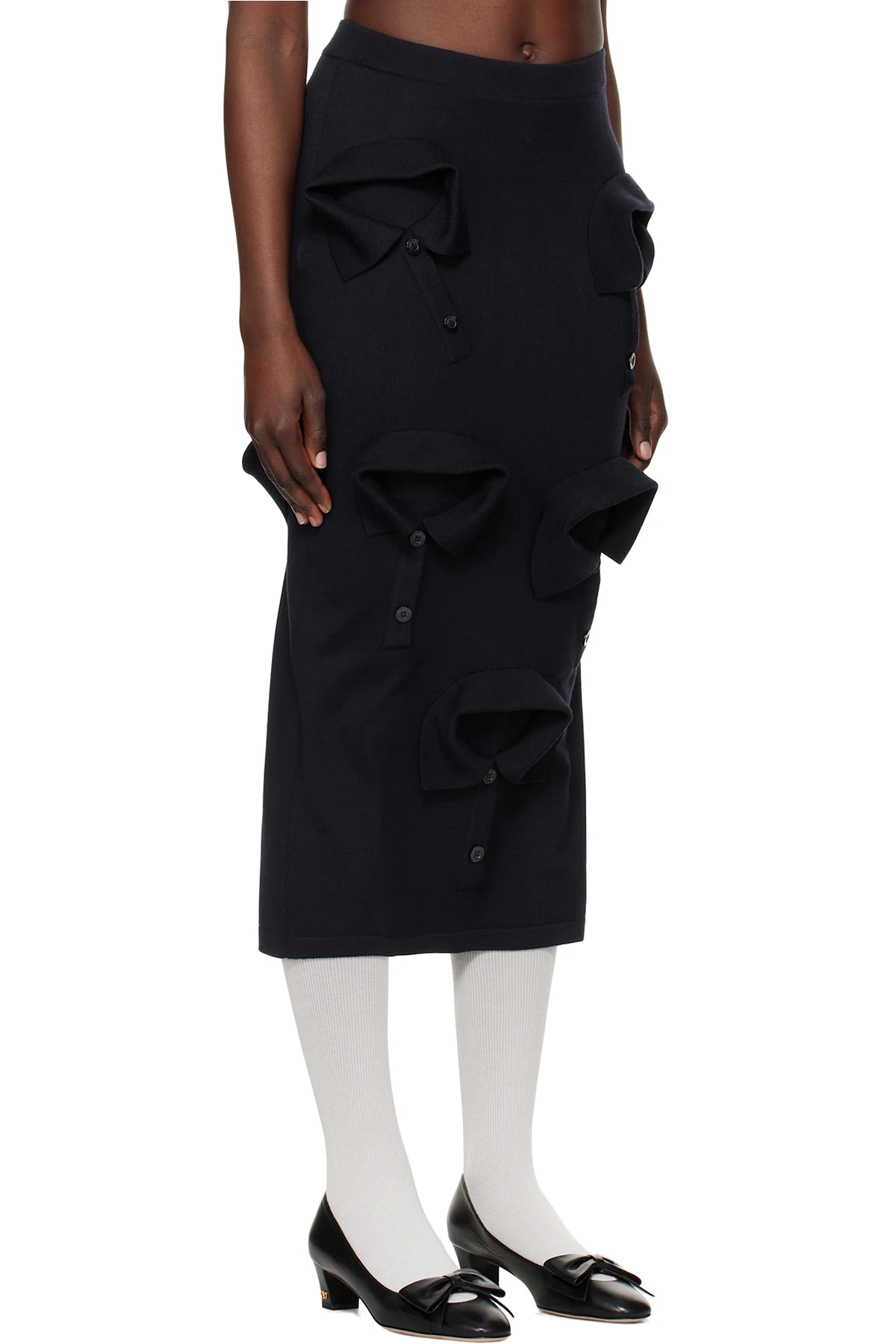 Knit merino wool midi skirt. Spread collar-style appliqués throughout. Rib-knit waistband and hem.