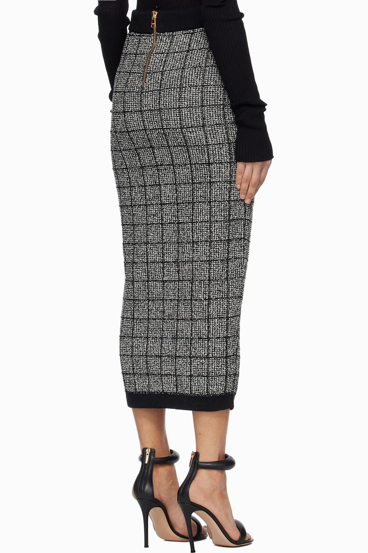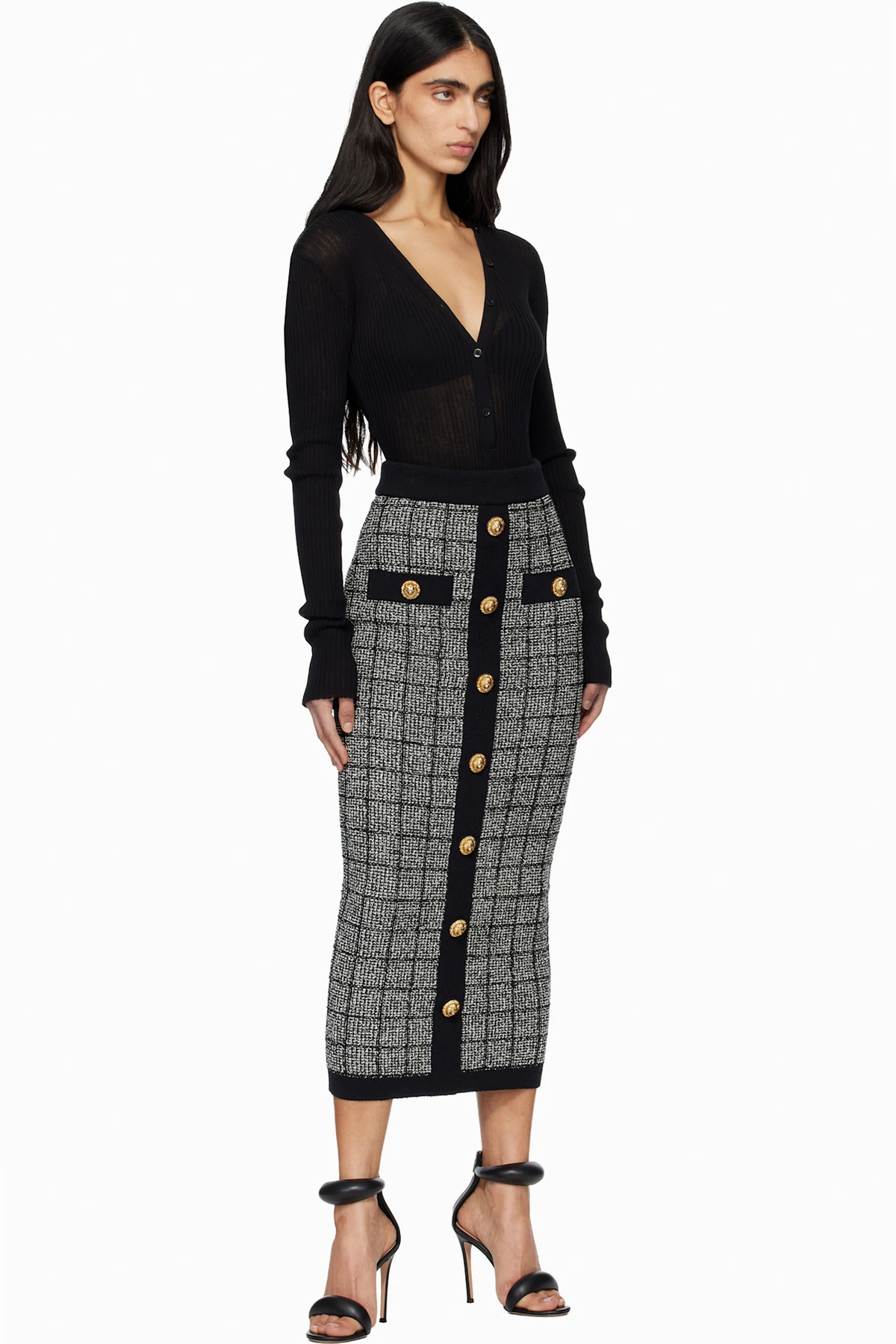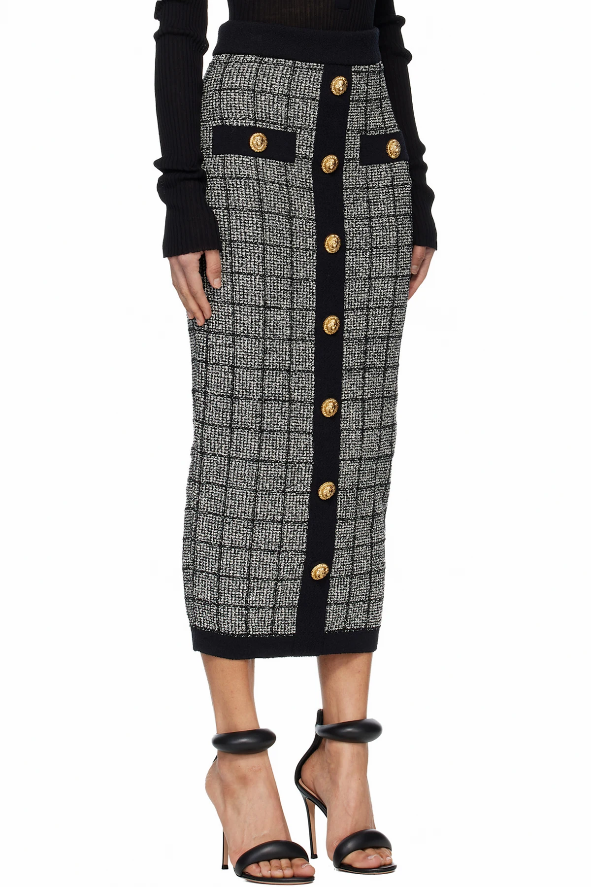 Black & White Buttoned Knit Light Tweed Maxi Skirt
