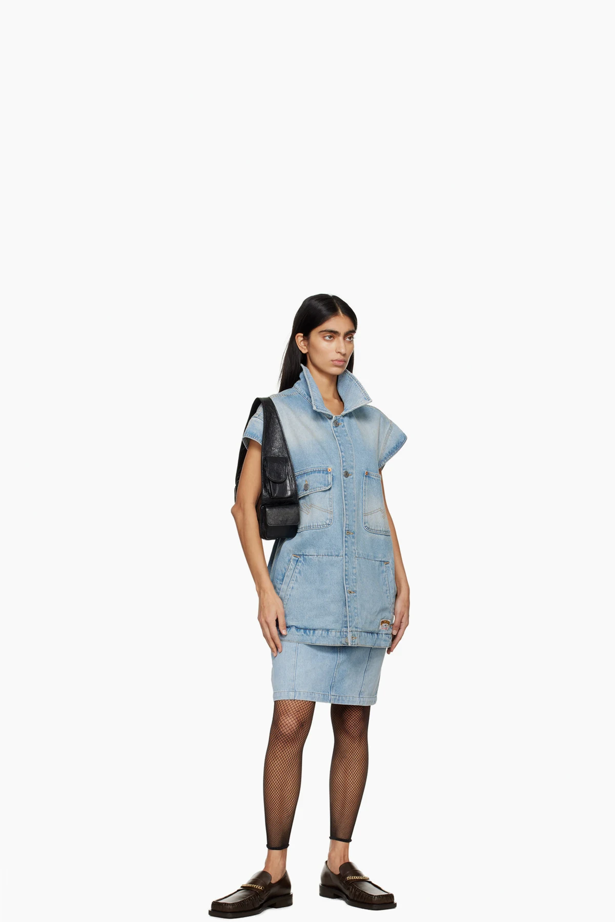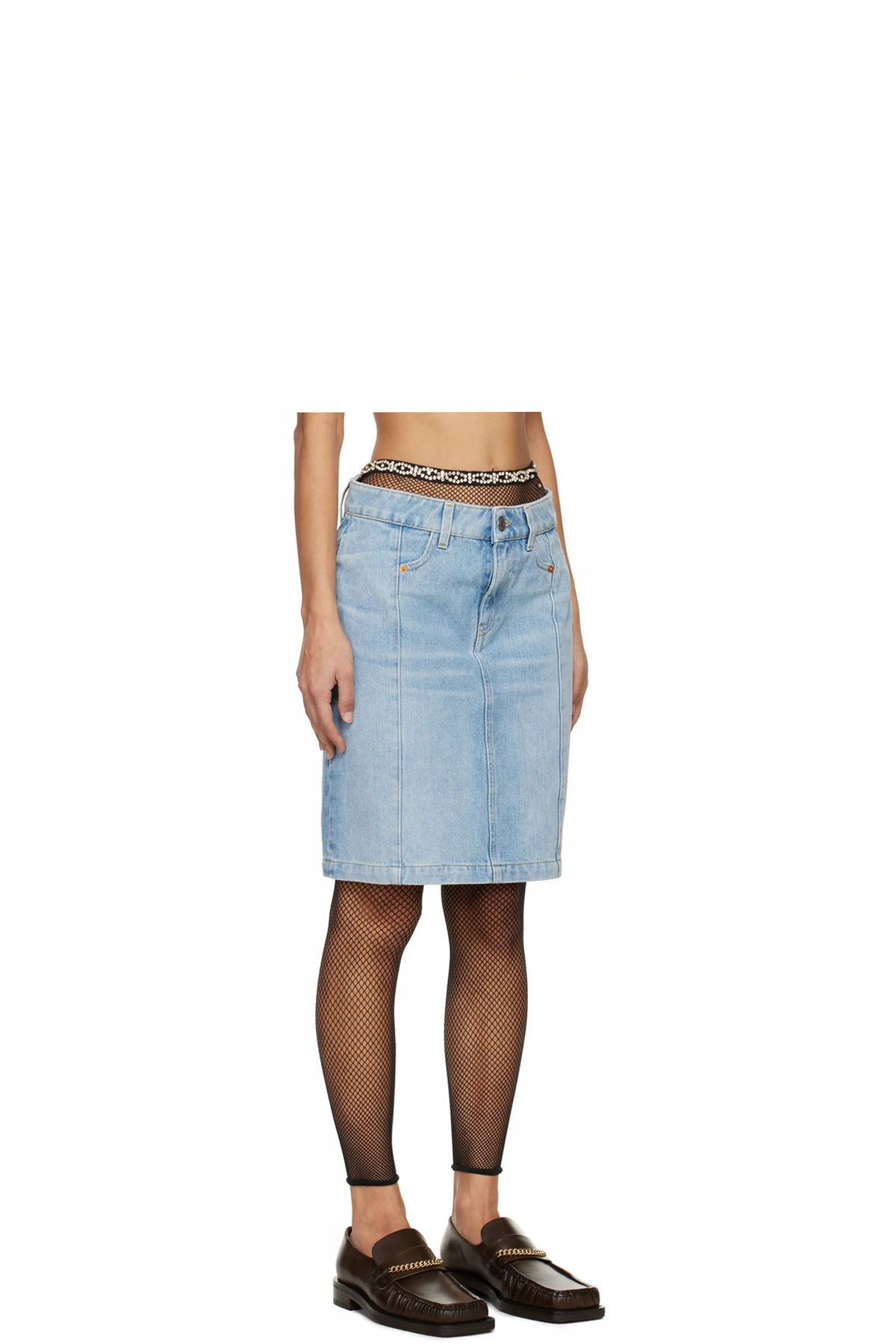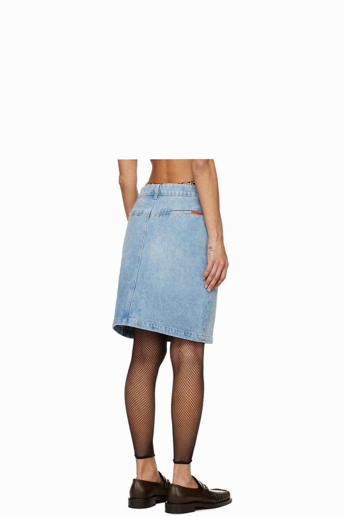 Non-stretch denim skirt. Fading and whiskering throughout.