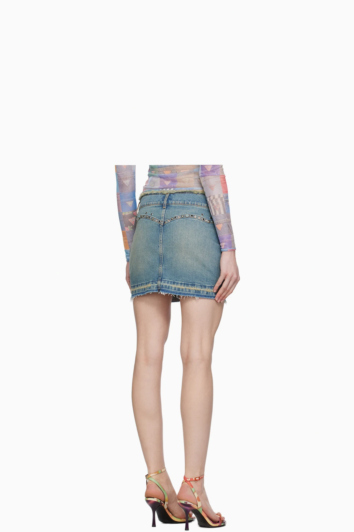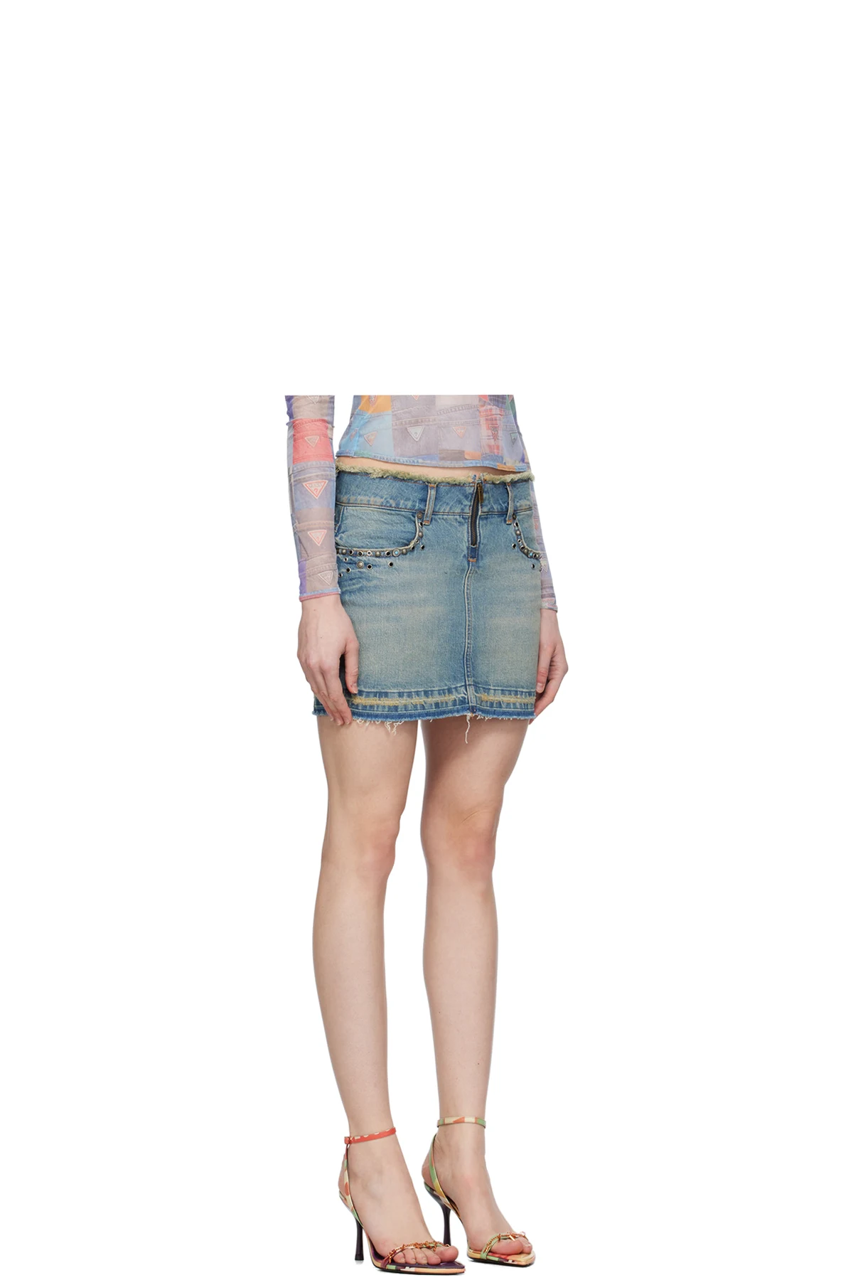 Stretch denim skirt. Hand-fading, whiskering, and handcrafted embellishments throughout.