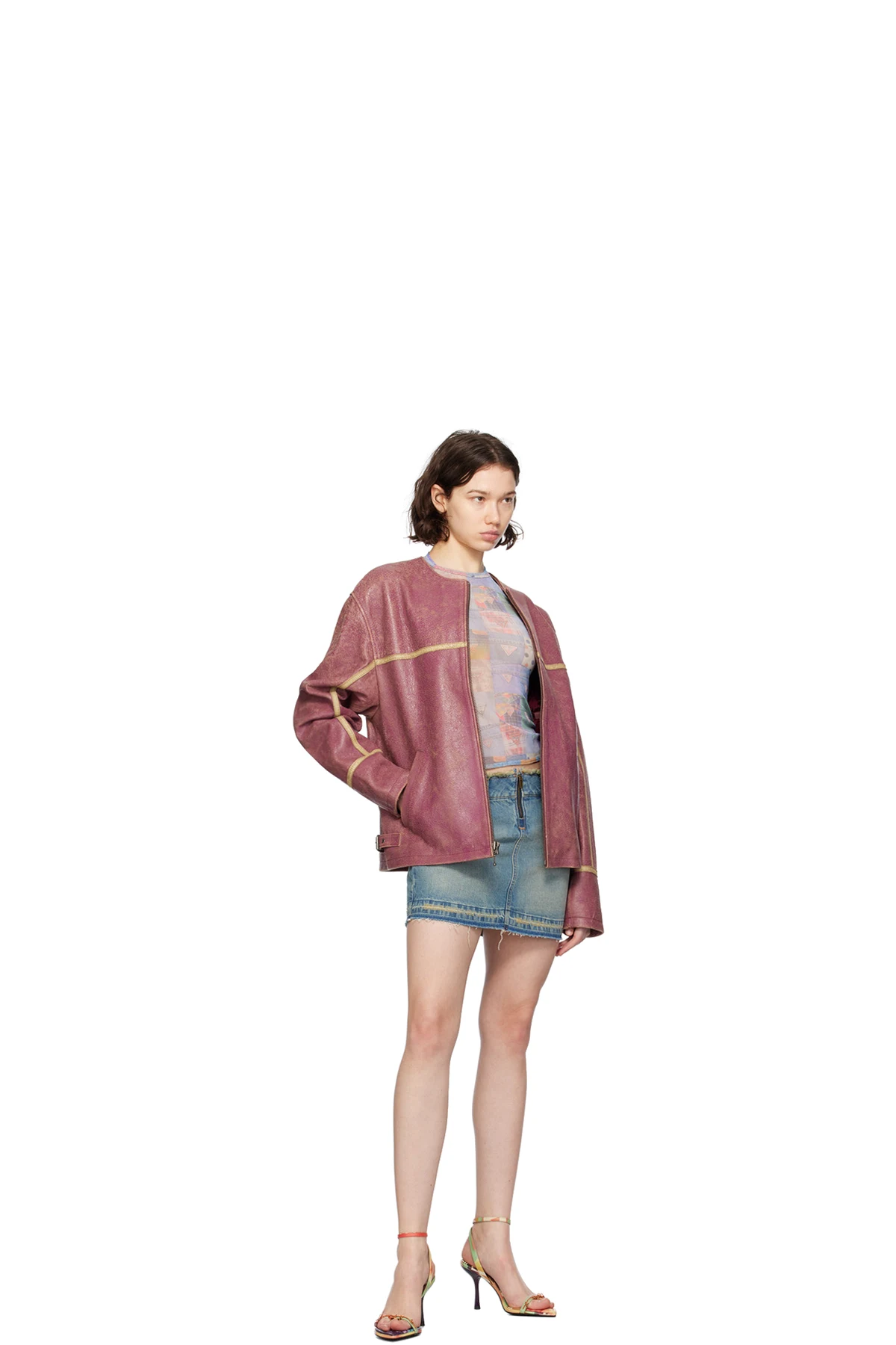 · Hand-distressing and raw edge at hem