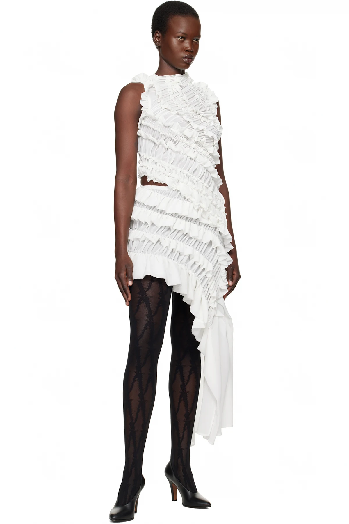 Polyester crepe miniskirt. Shirring and ruffles throughout
