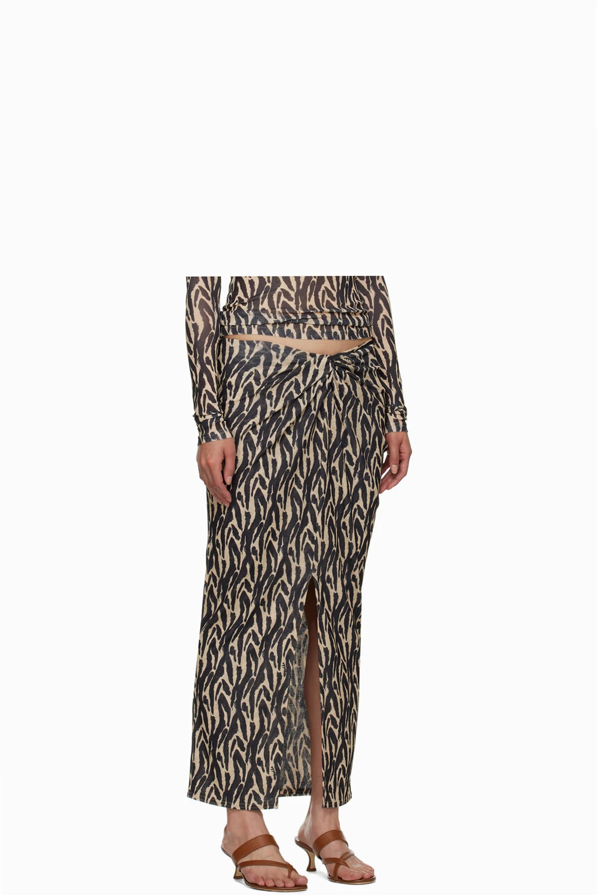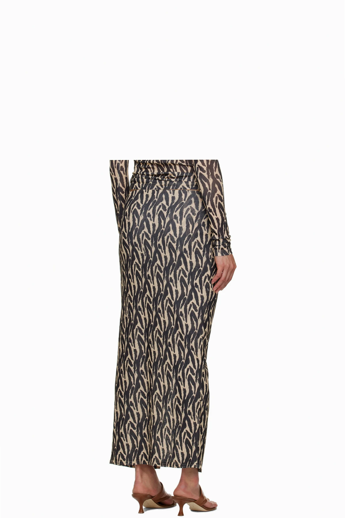 Semi-sheer recycled polyester skirt. Graphic pattern printed throughout.
