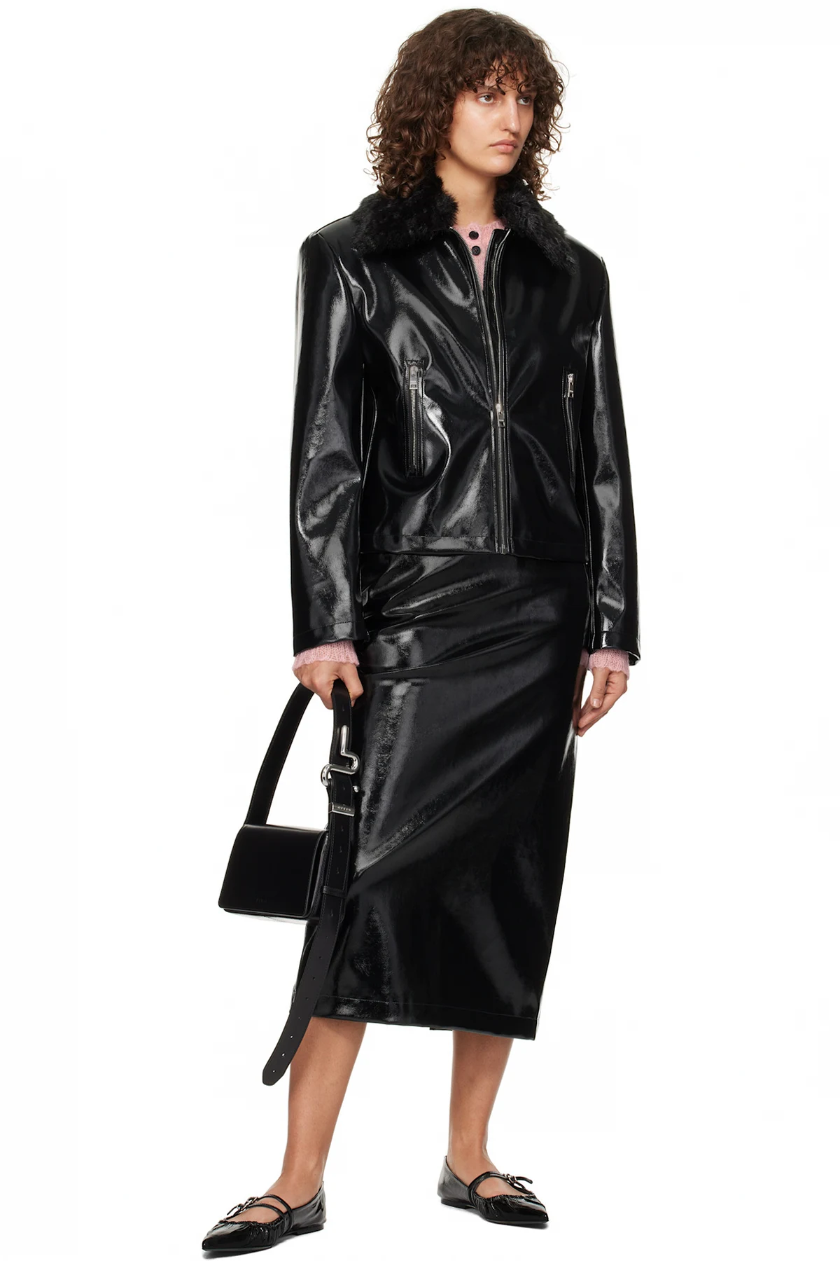 Patent faux-leather midi skirt.