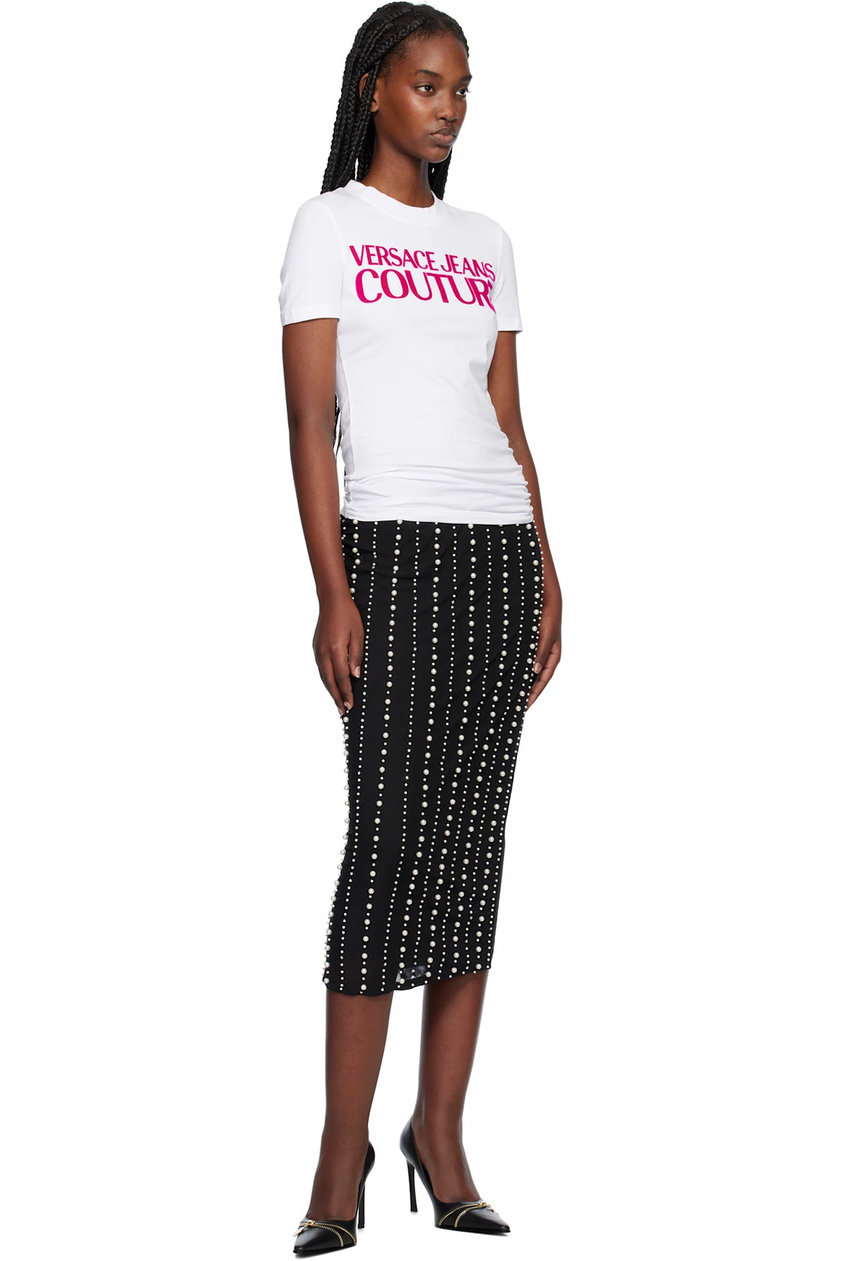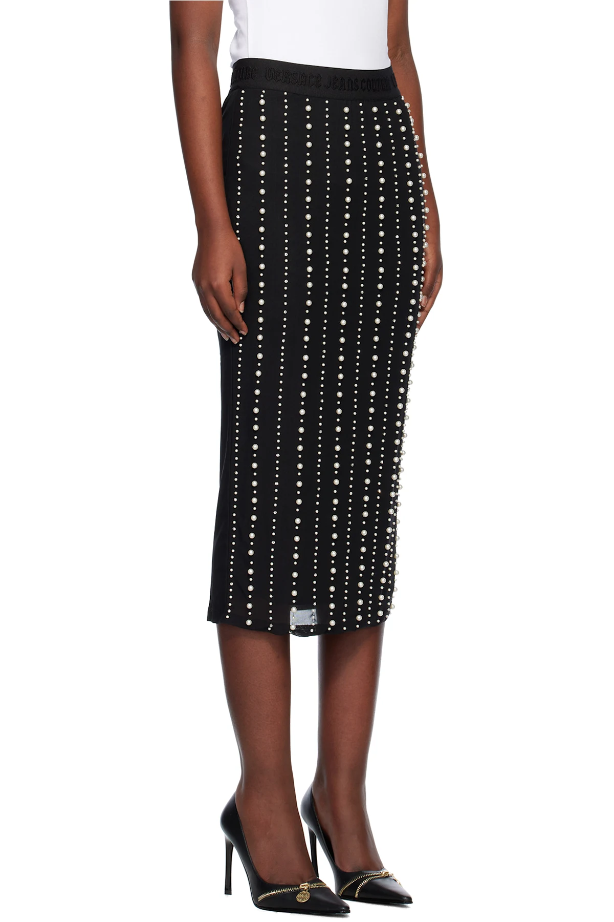 Polyester mesh midi skirt. Faux-pearls and prong-set crystals throughout.