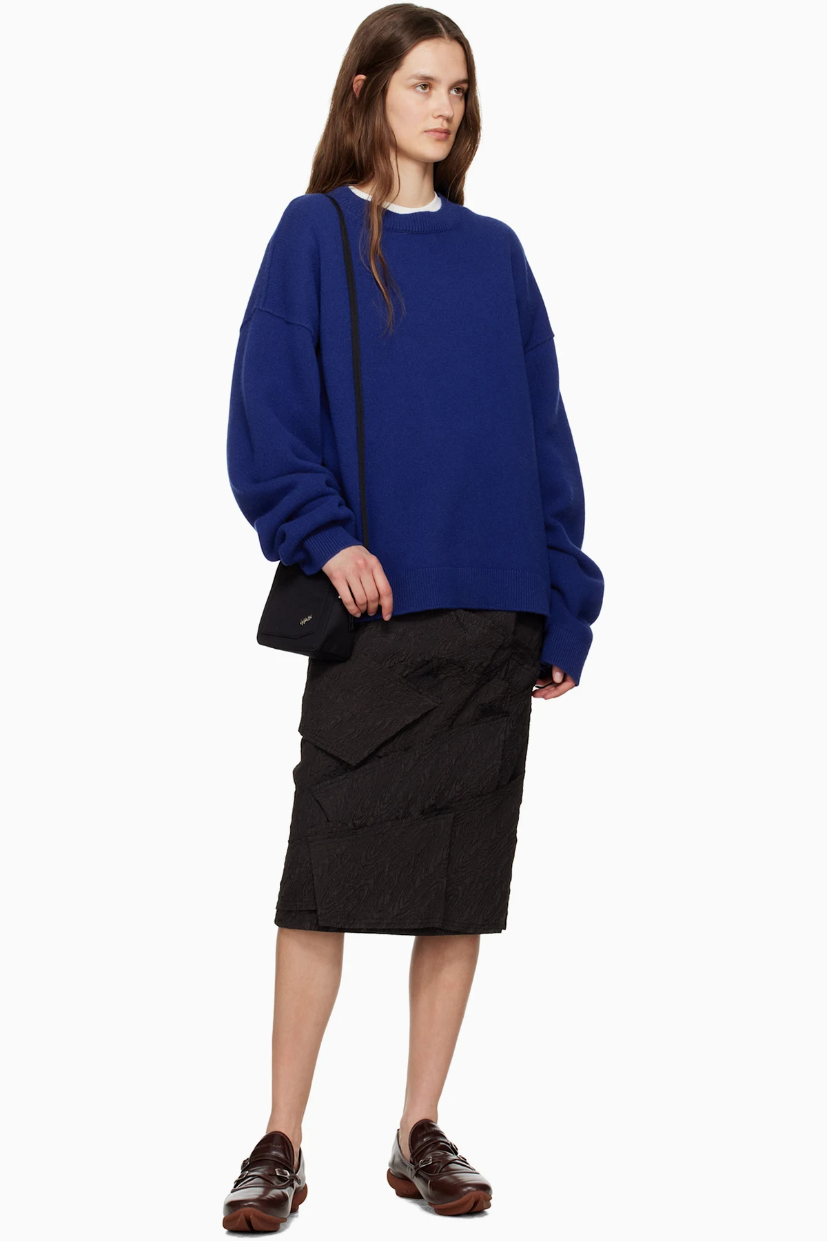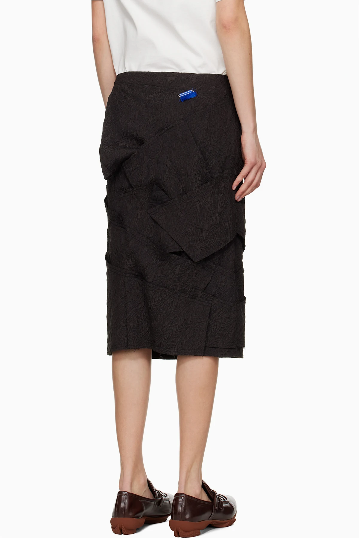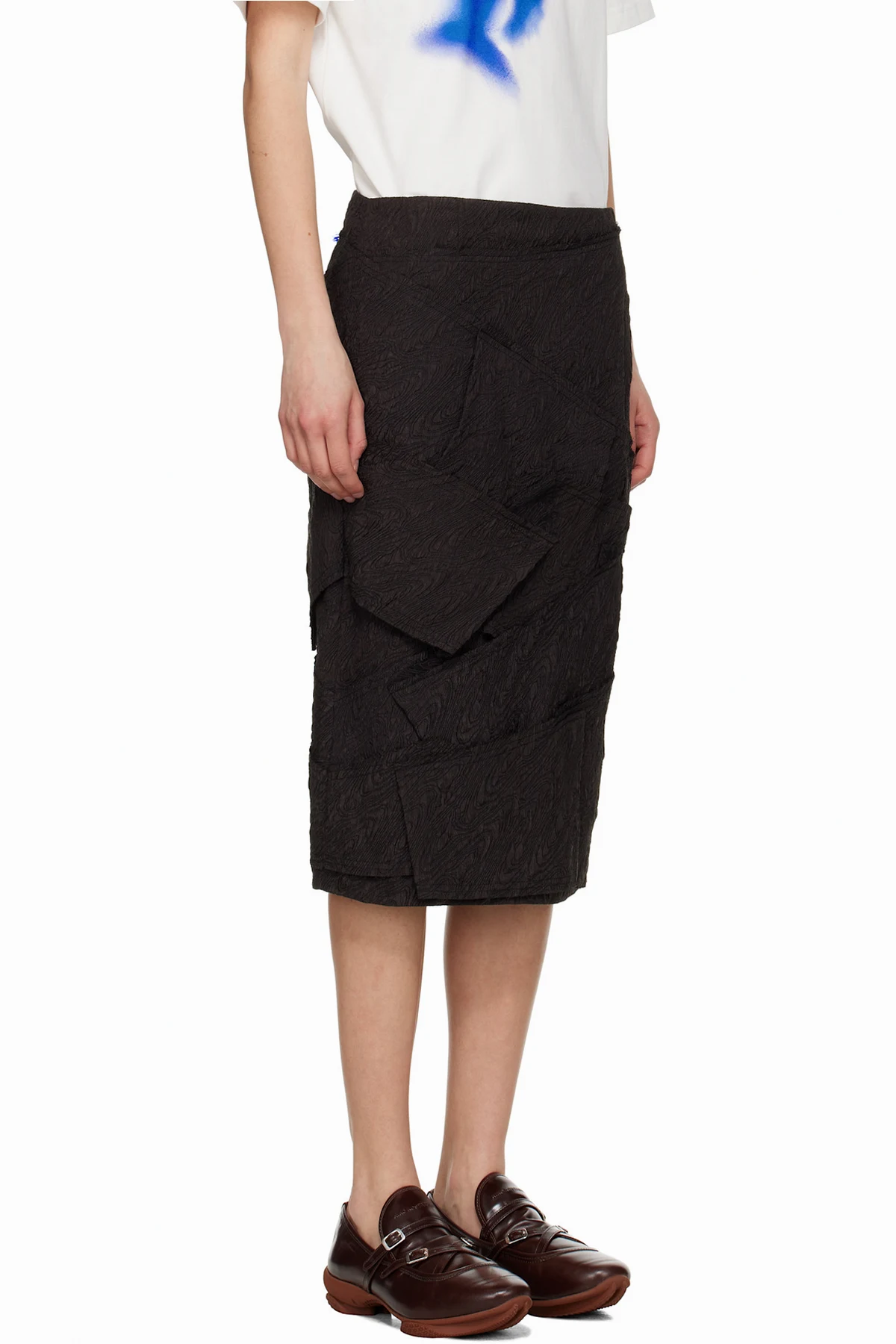 Polyester cloqué midi skirt. Raw edges throughout.