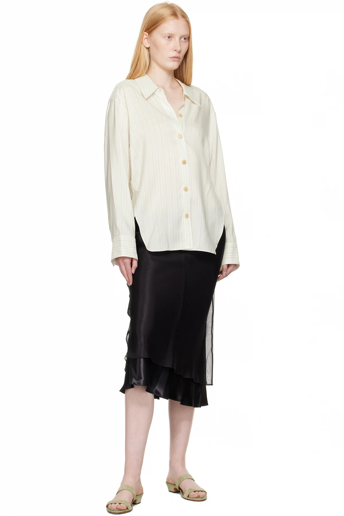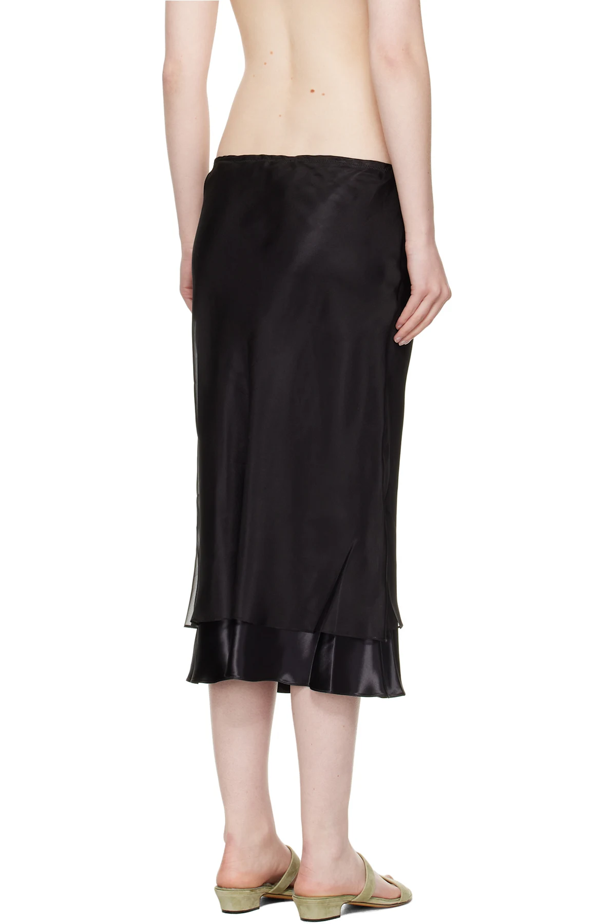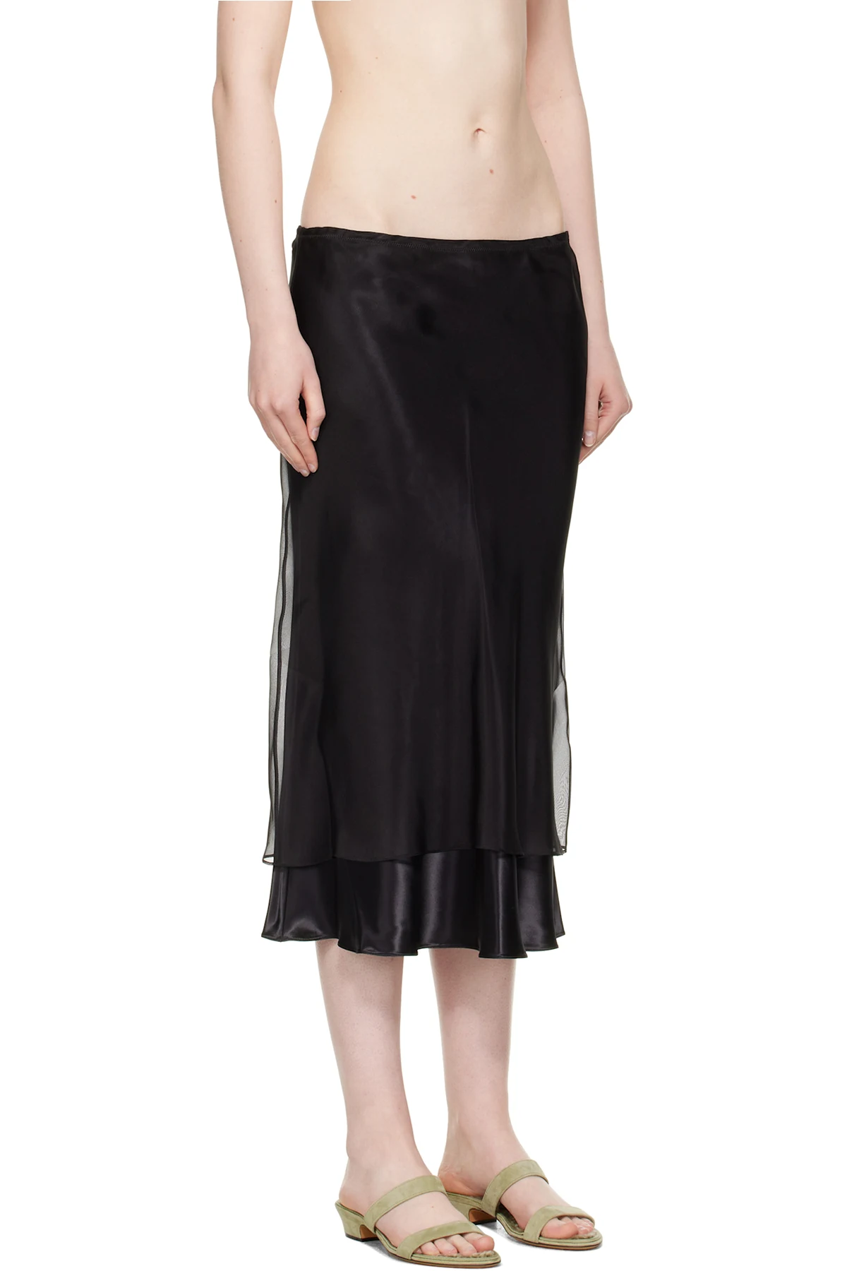 Bias-cut viscose satin midi skirt. Silk organza overlay.