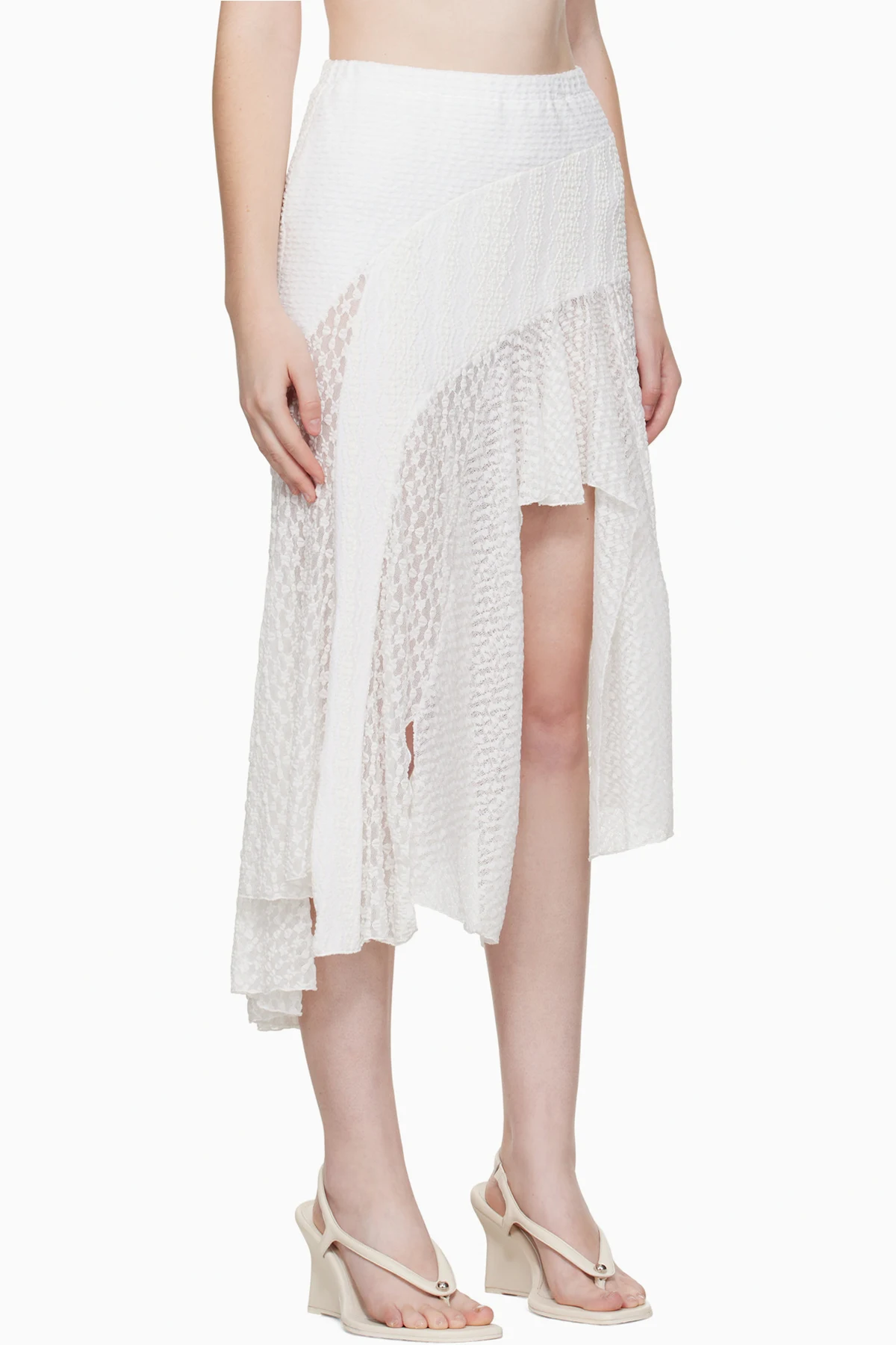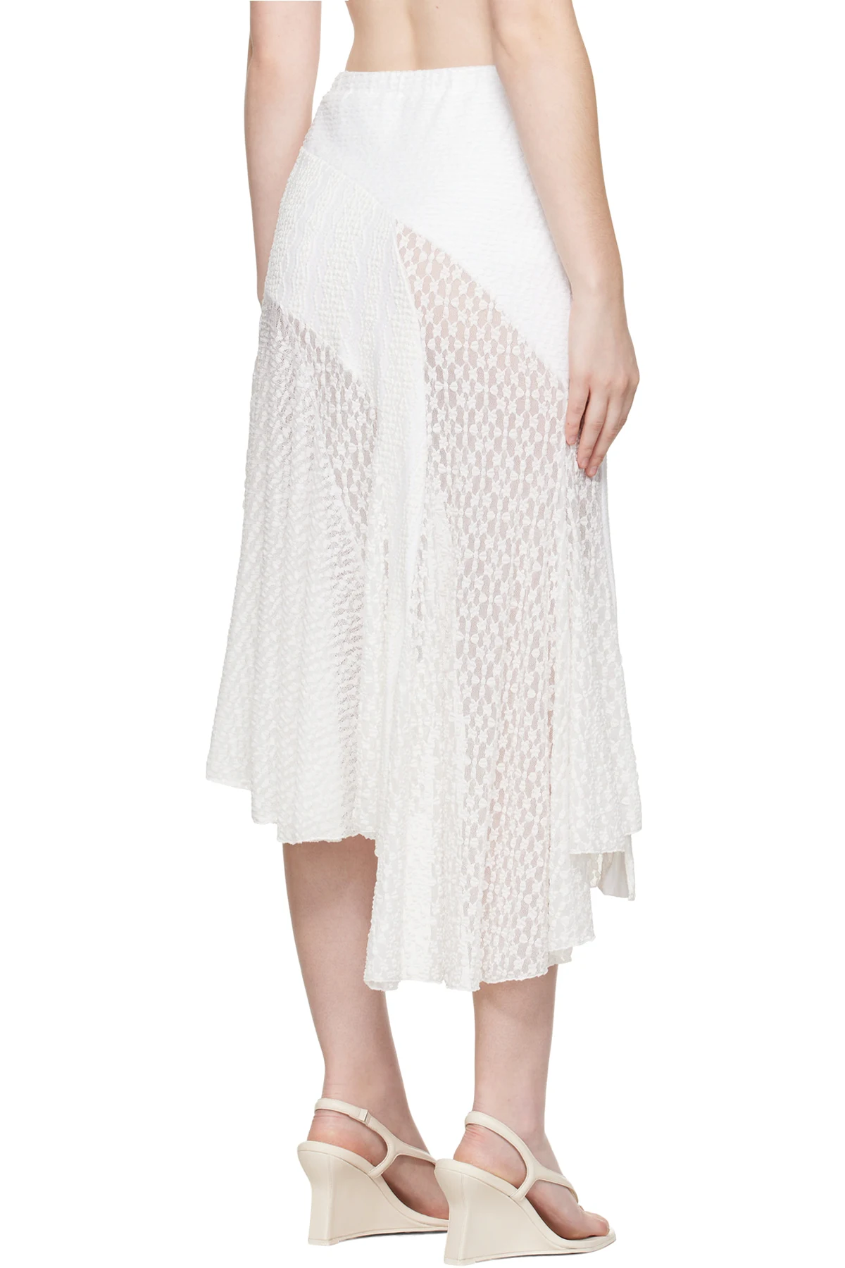 Semi-sheer stretch nylon cloqué and lace midi skirt.