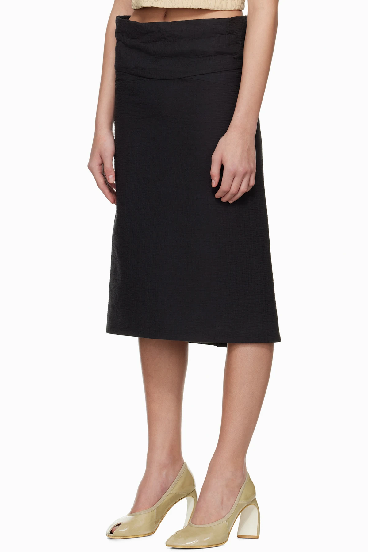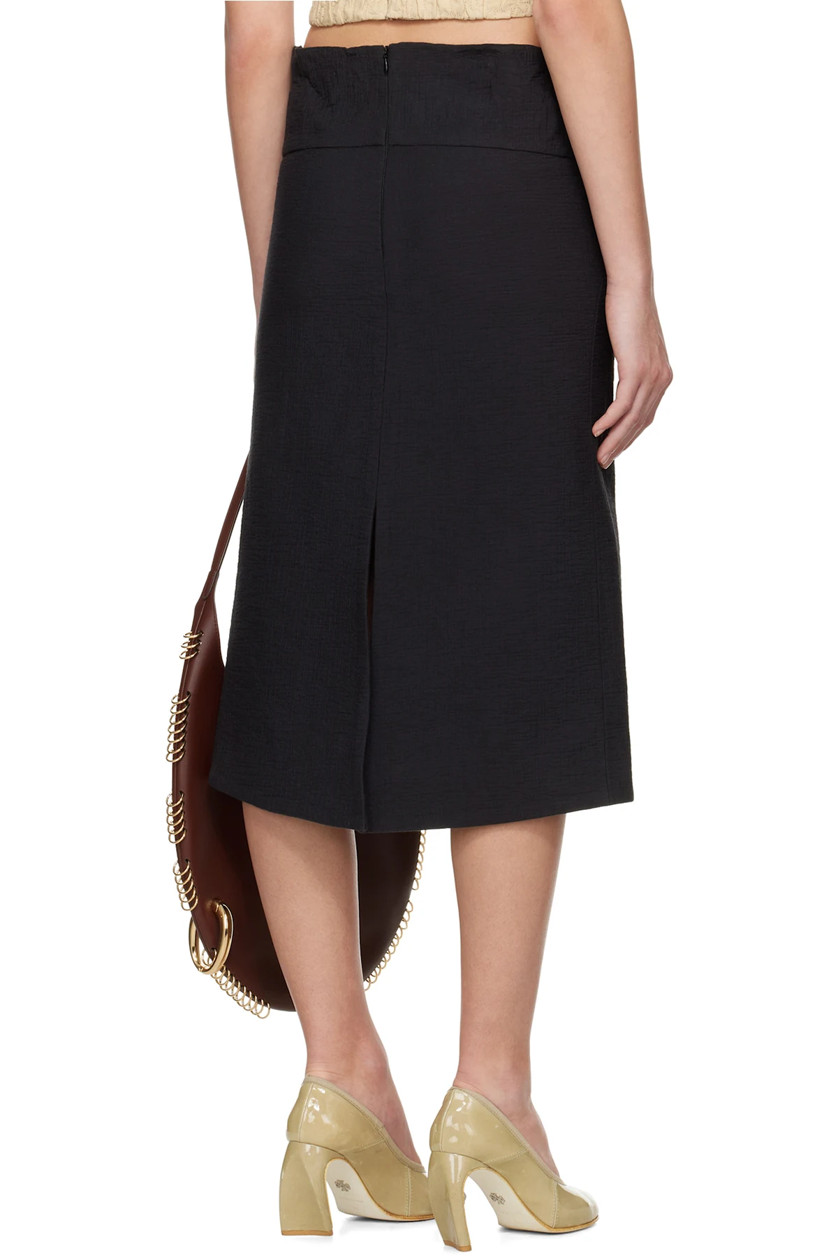 Black Molded Waistband Cotton Midi Skirt