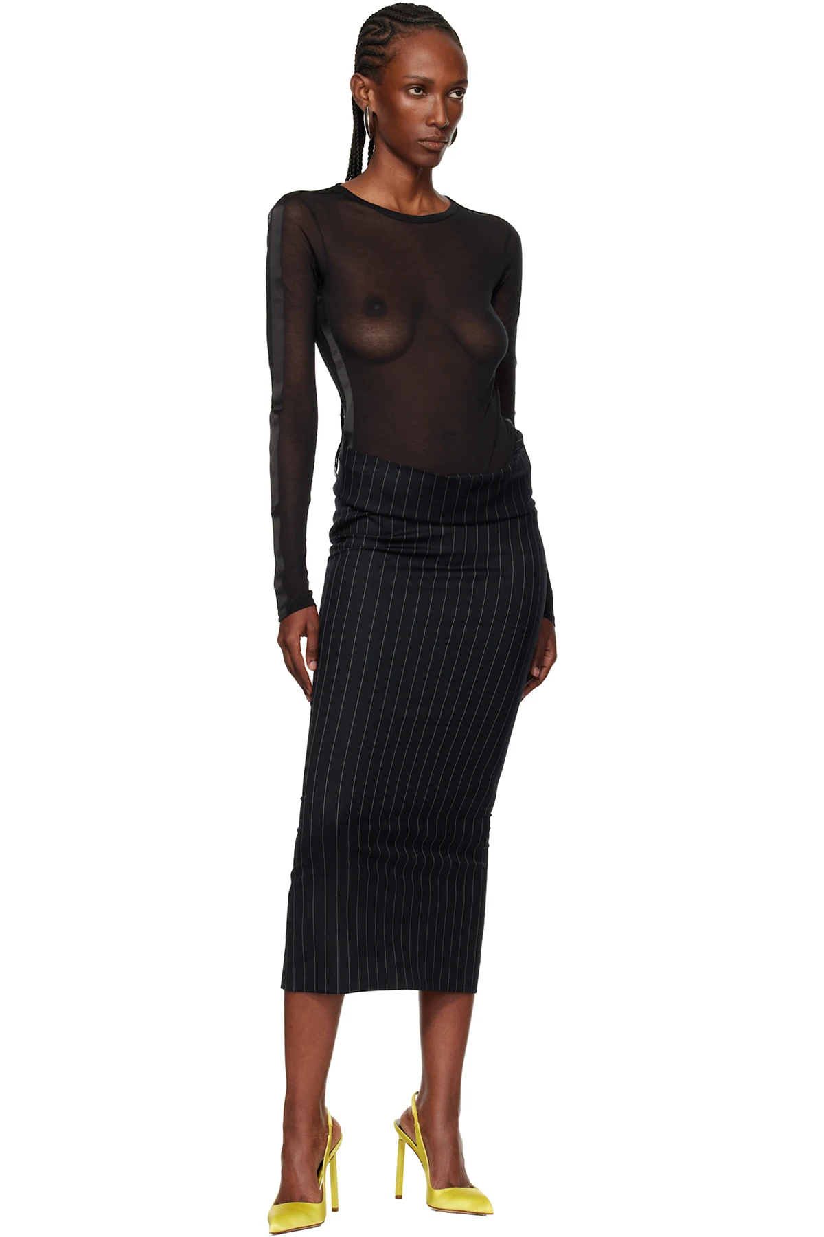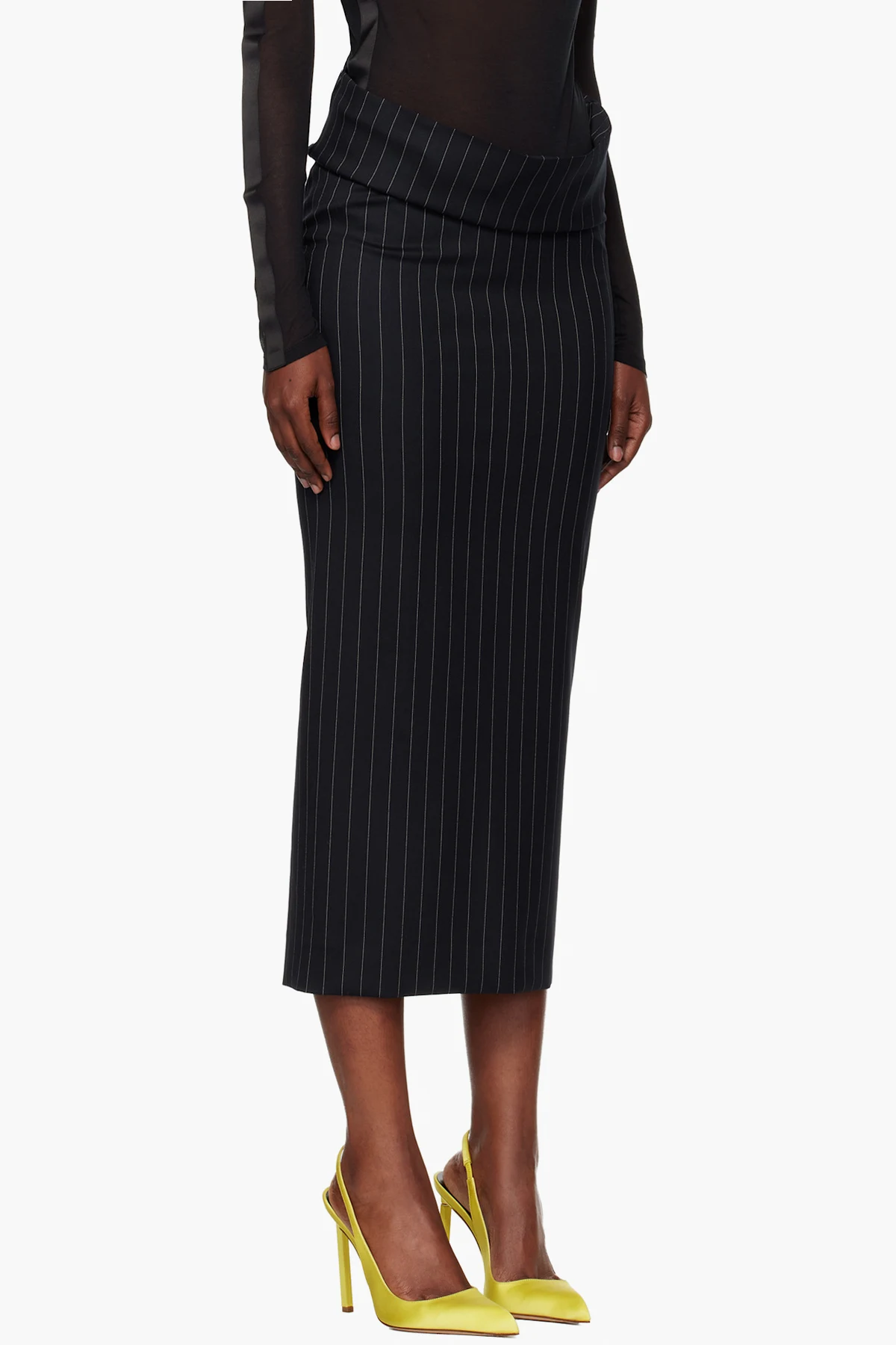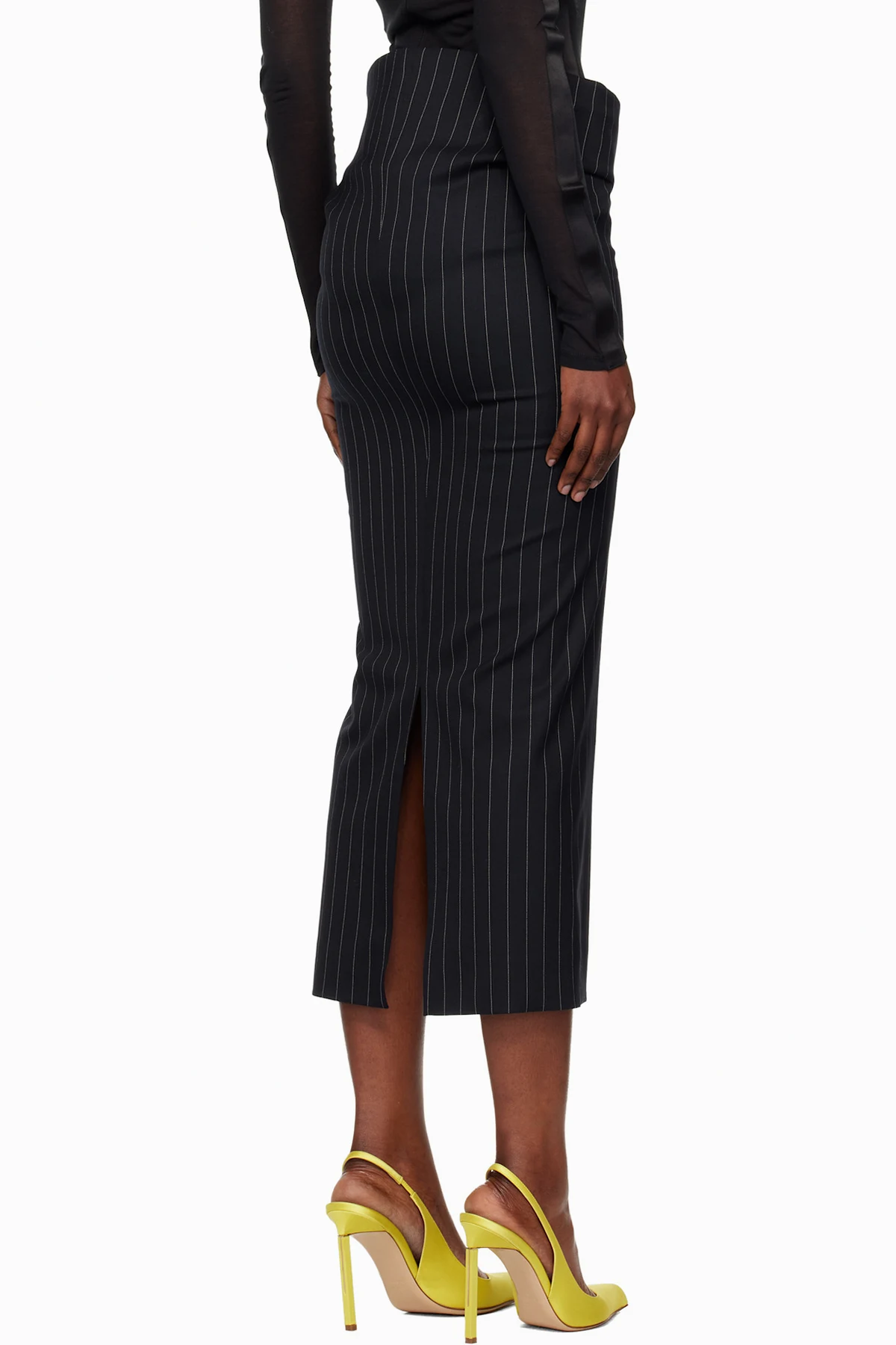 Navy Pinstripe Stretch Tube Midi Skirt