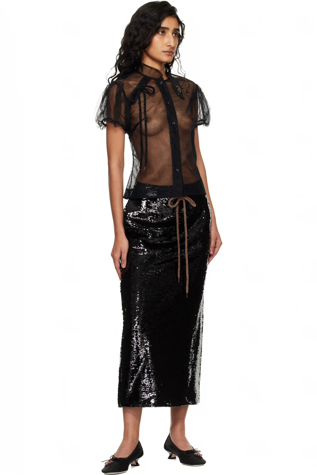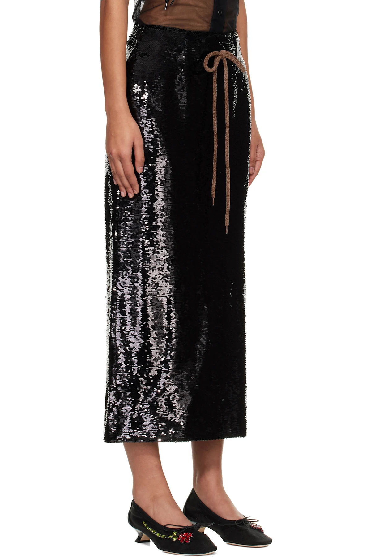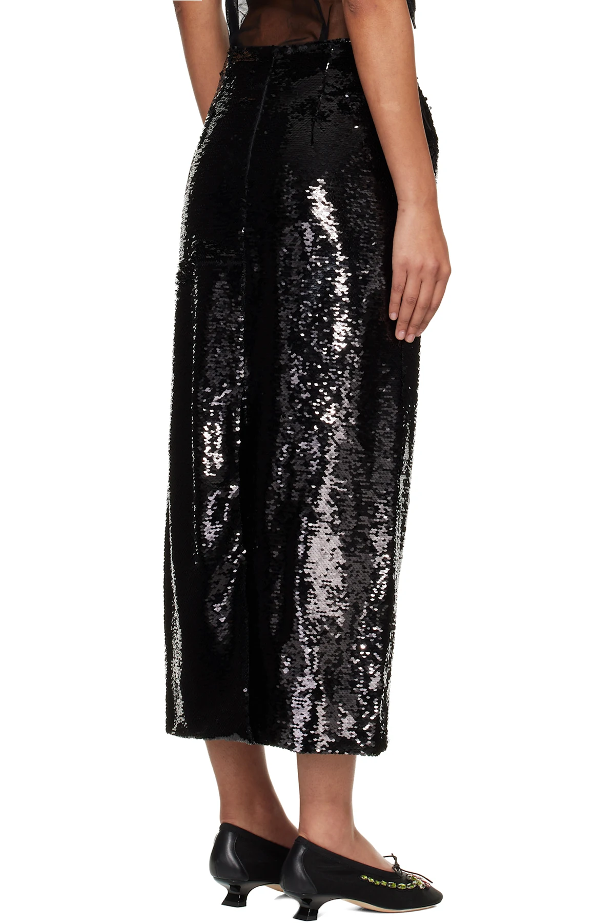 Sequinned mesh midi skirt.