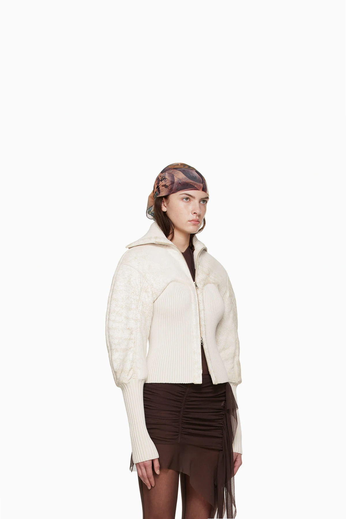 Insulated paneled lambskin and rib knit stretch viscose jacket. Distressing throughout.