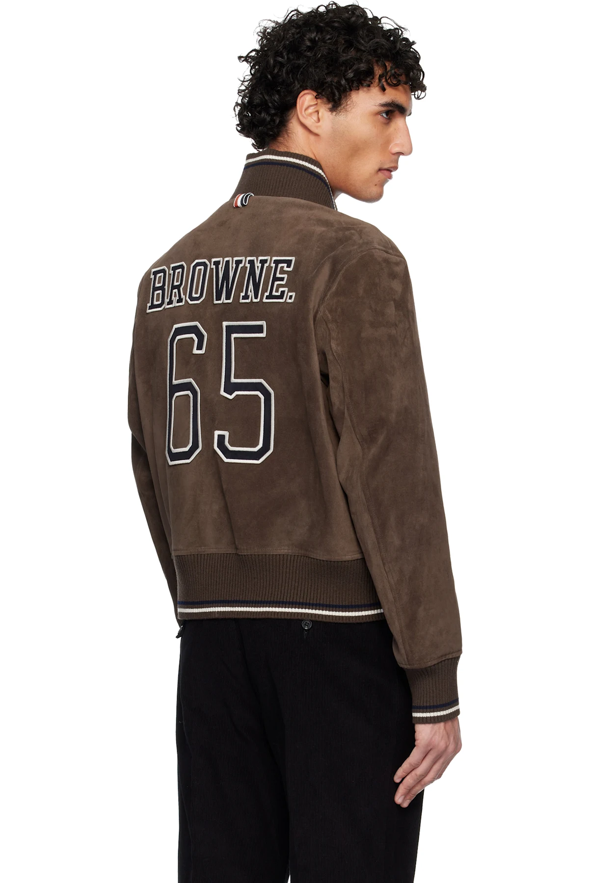 · Striped rib-knit stand collar, hem, and cuffs
