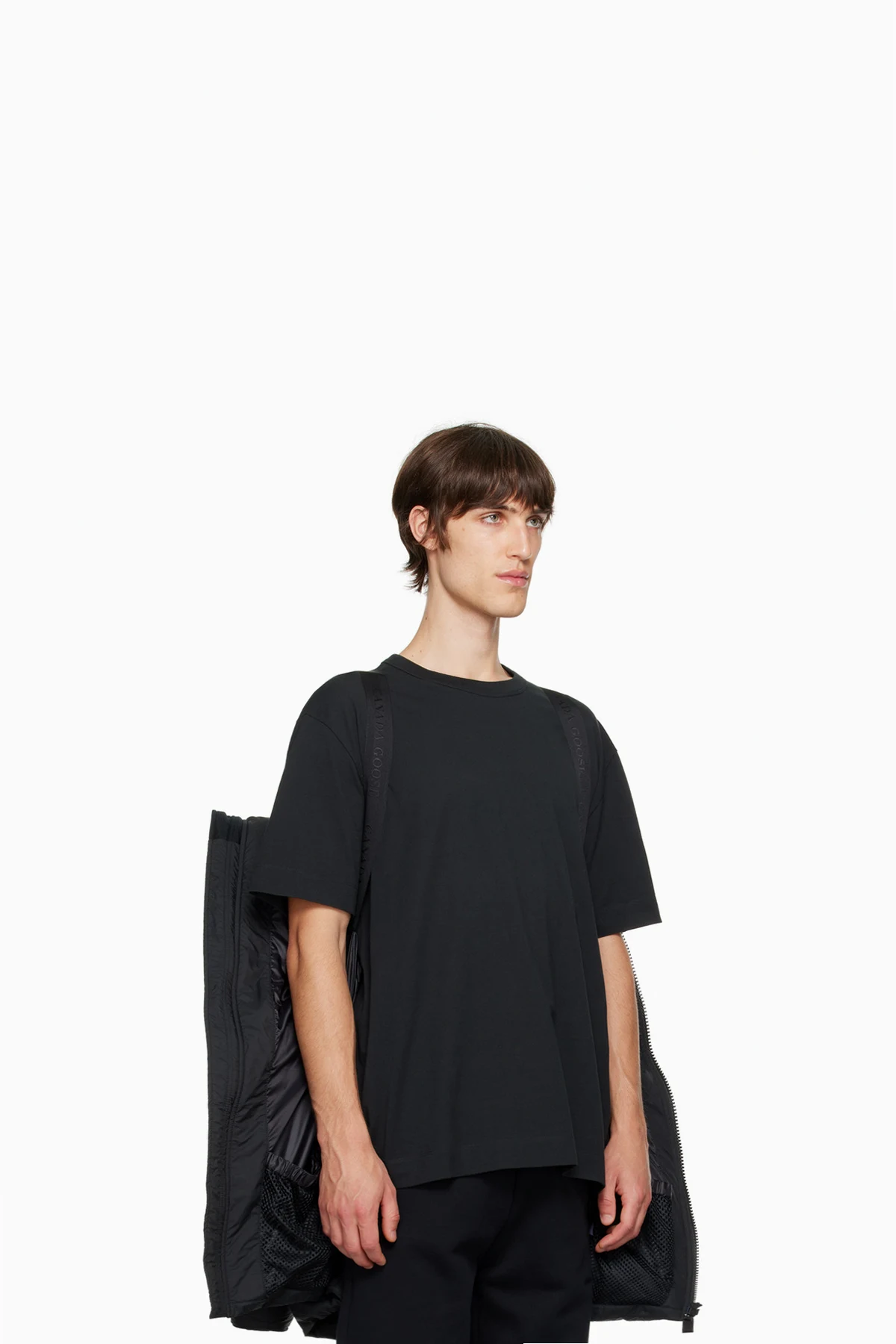 · Logo-woven webbing shoulder straps at interior