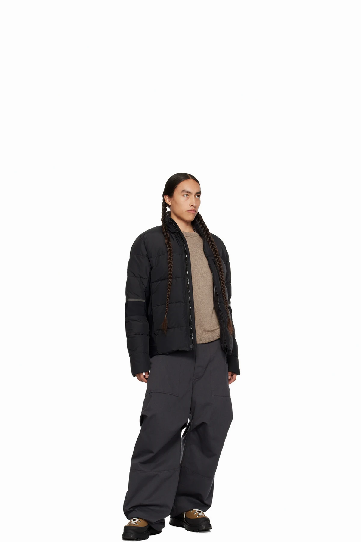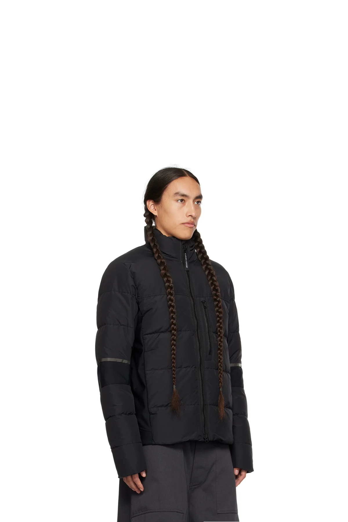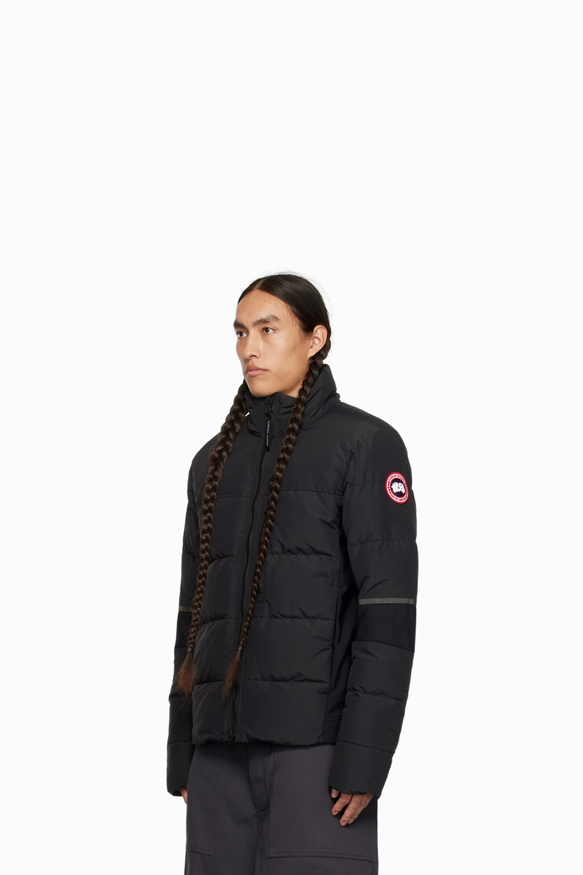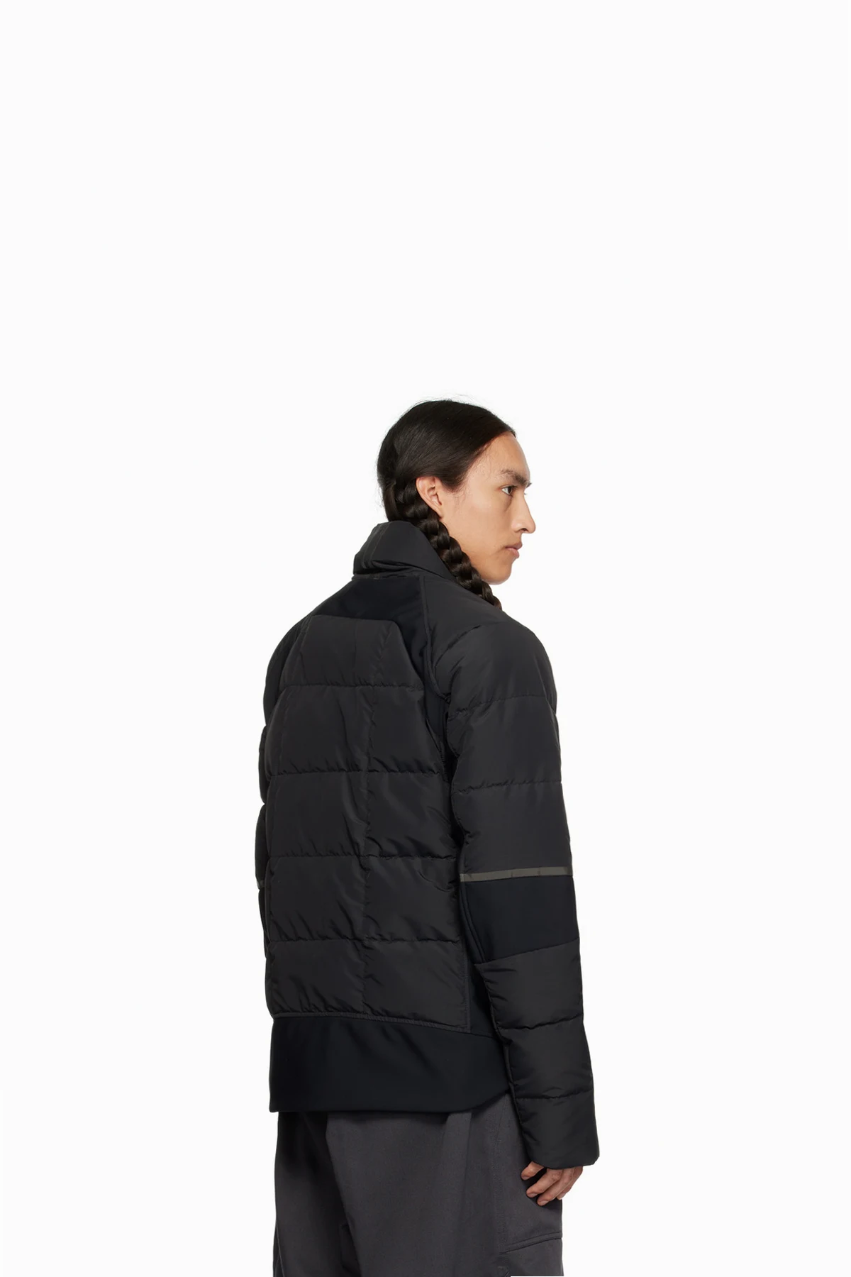 Down-filled quilted water-repellent CORDURA® nylon faille and stretch nylon jersey jacket. Reflective trim throughout.