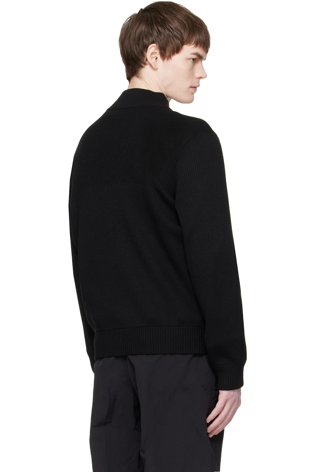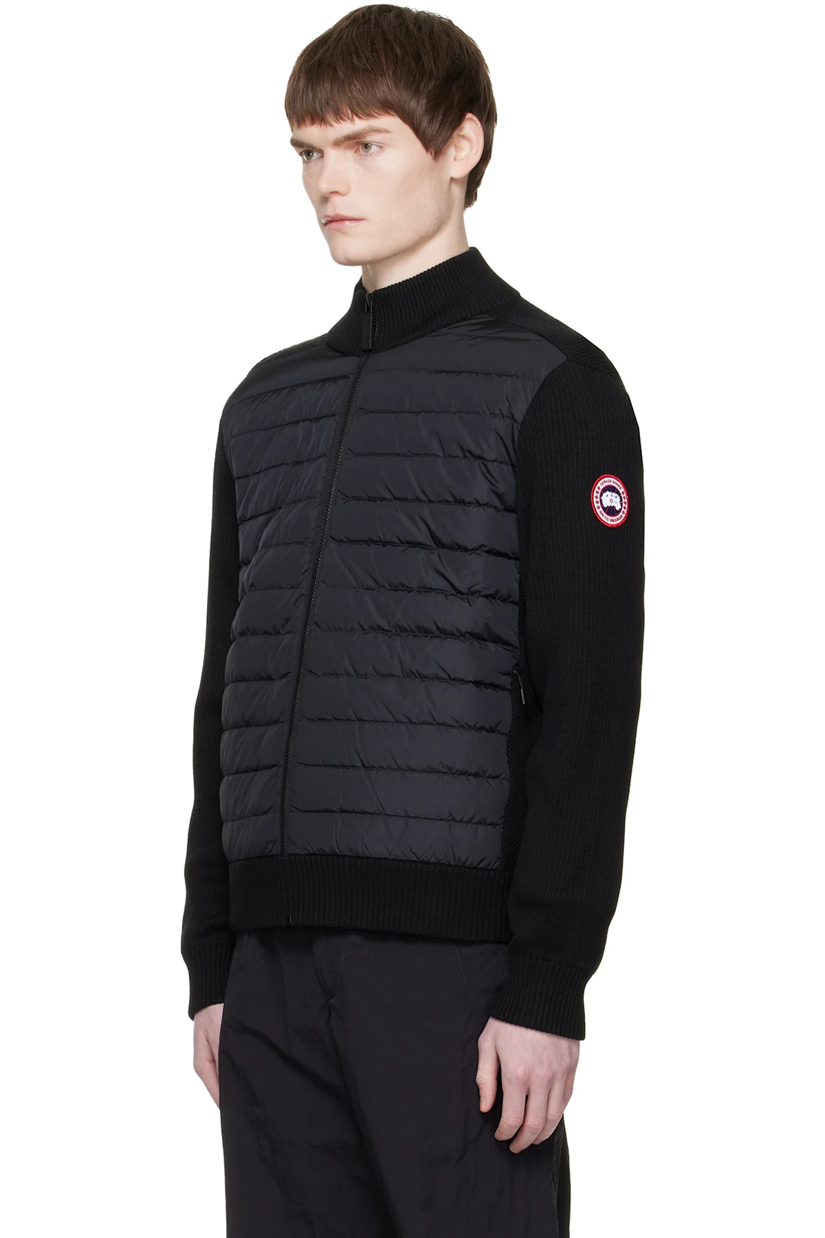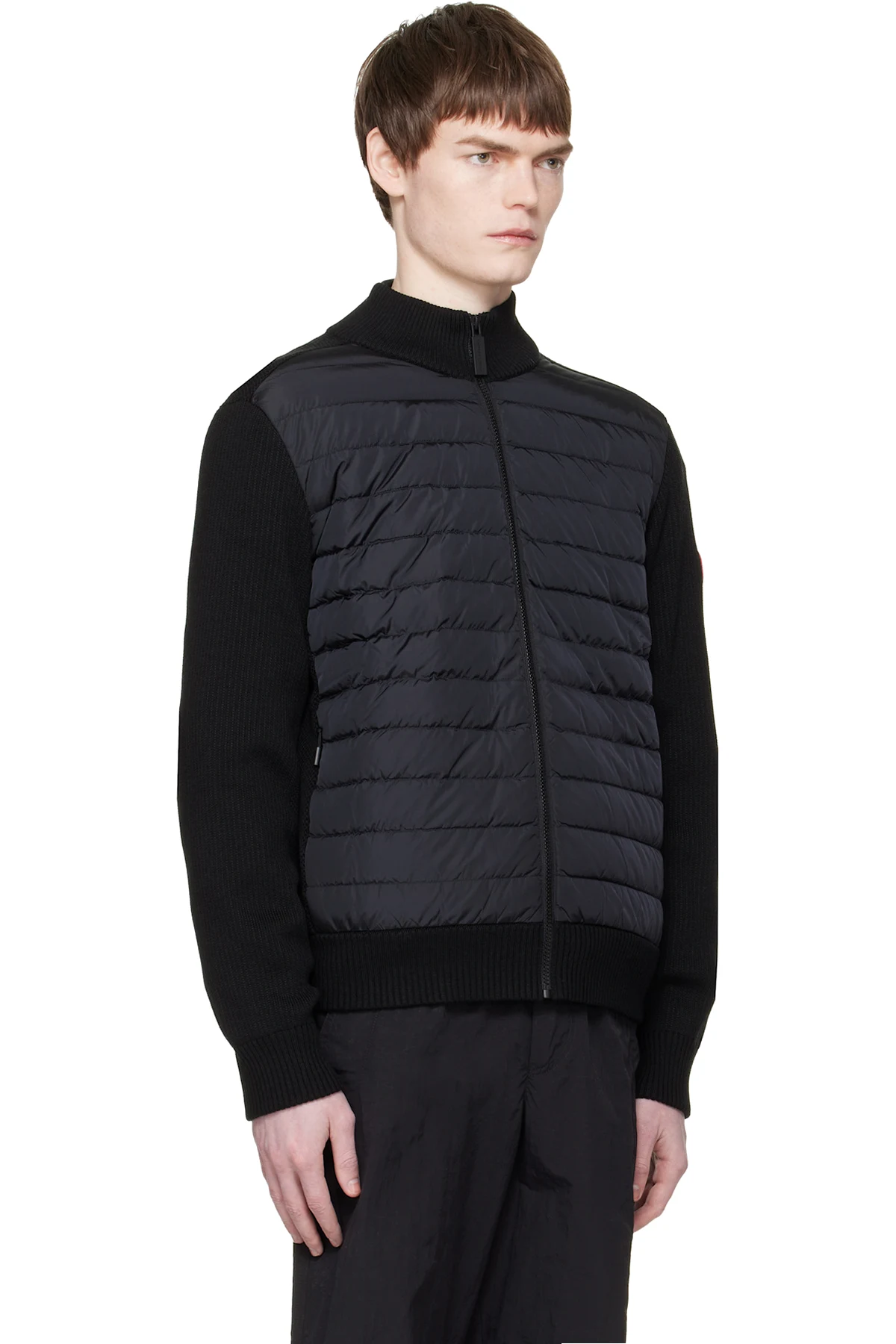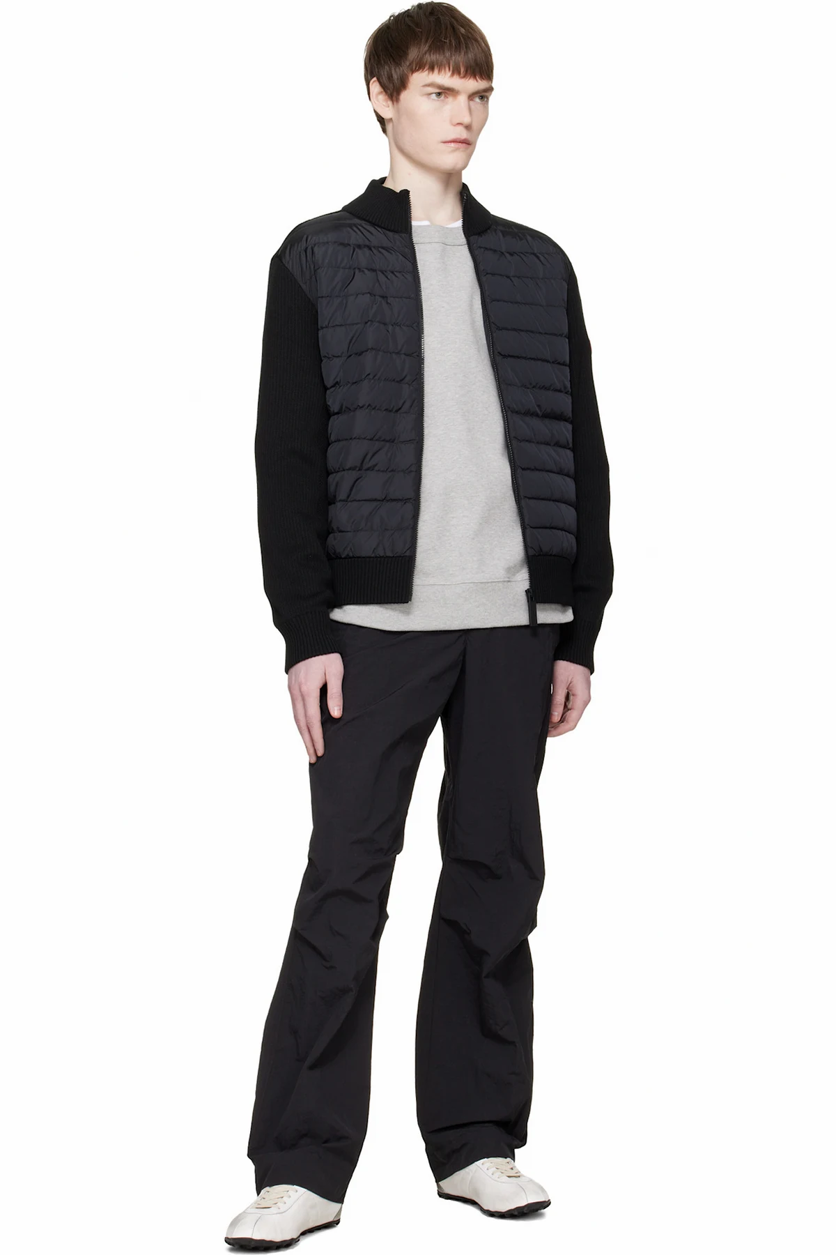 Down-filled quilted nylon satin and rib-knit wool jacket.
