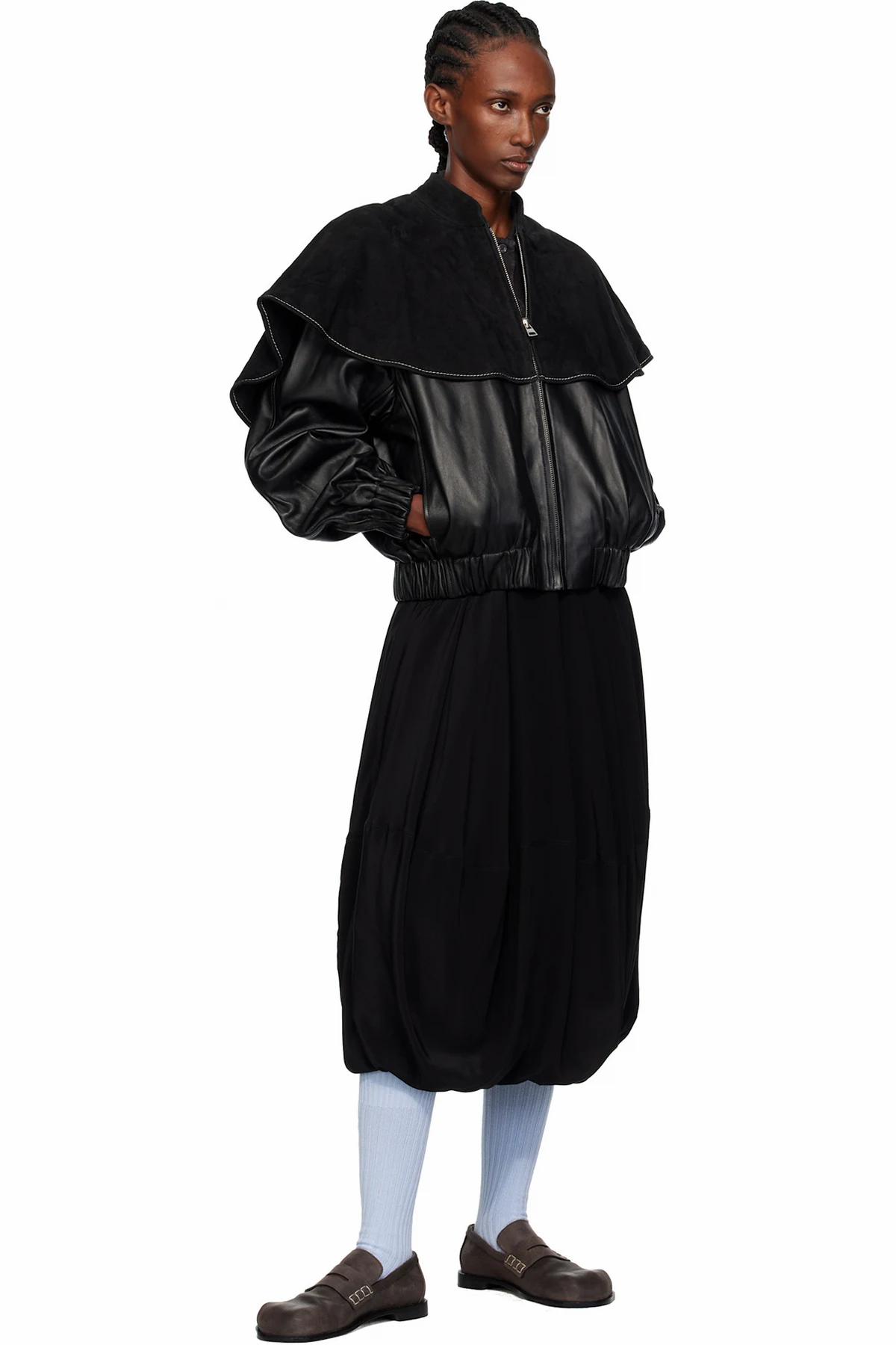 Black Oversized Collar Leather Bomber Jacket