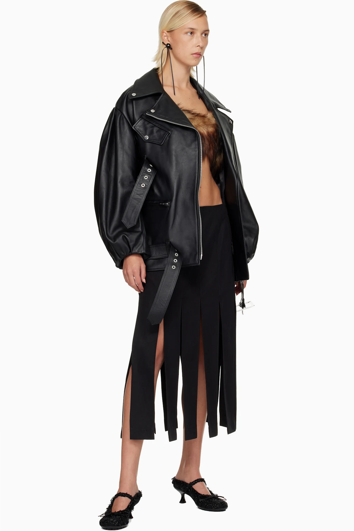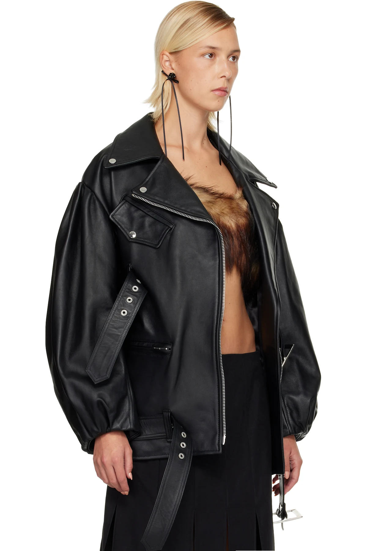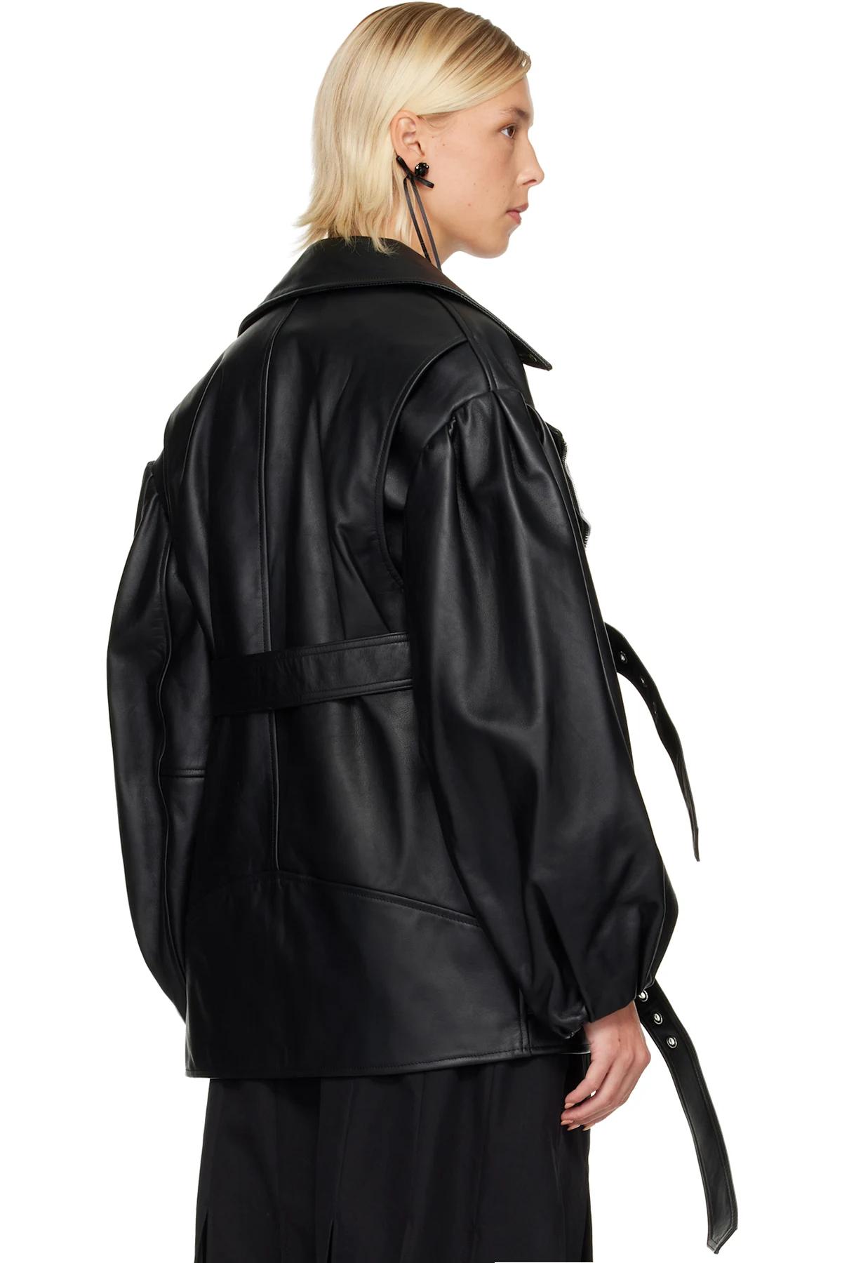 Black Puff Sleeve Multi Belt Leather Biker Jacket