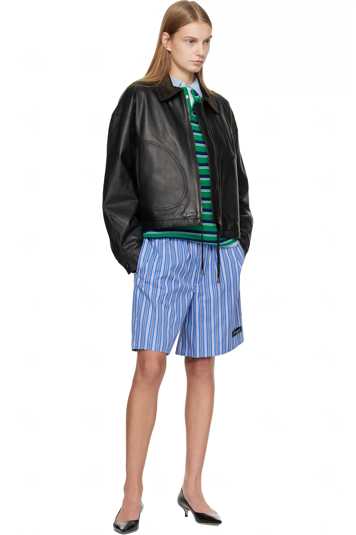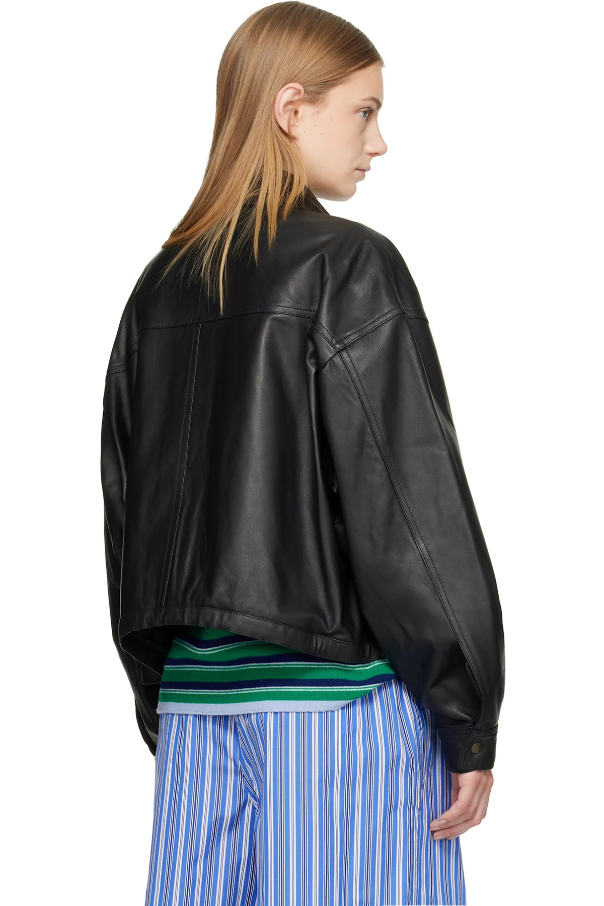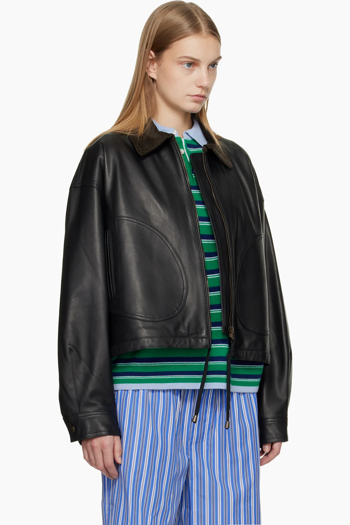 Body: 100% lambskin. Trim: 100% cotton. Lining: 50% viscose, 50% acetate.