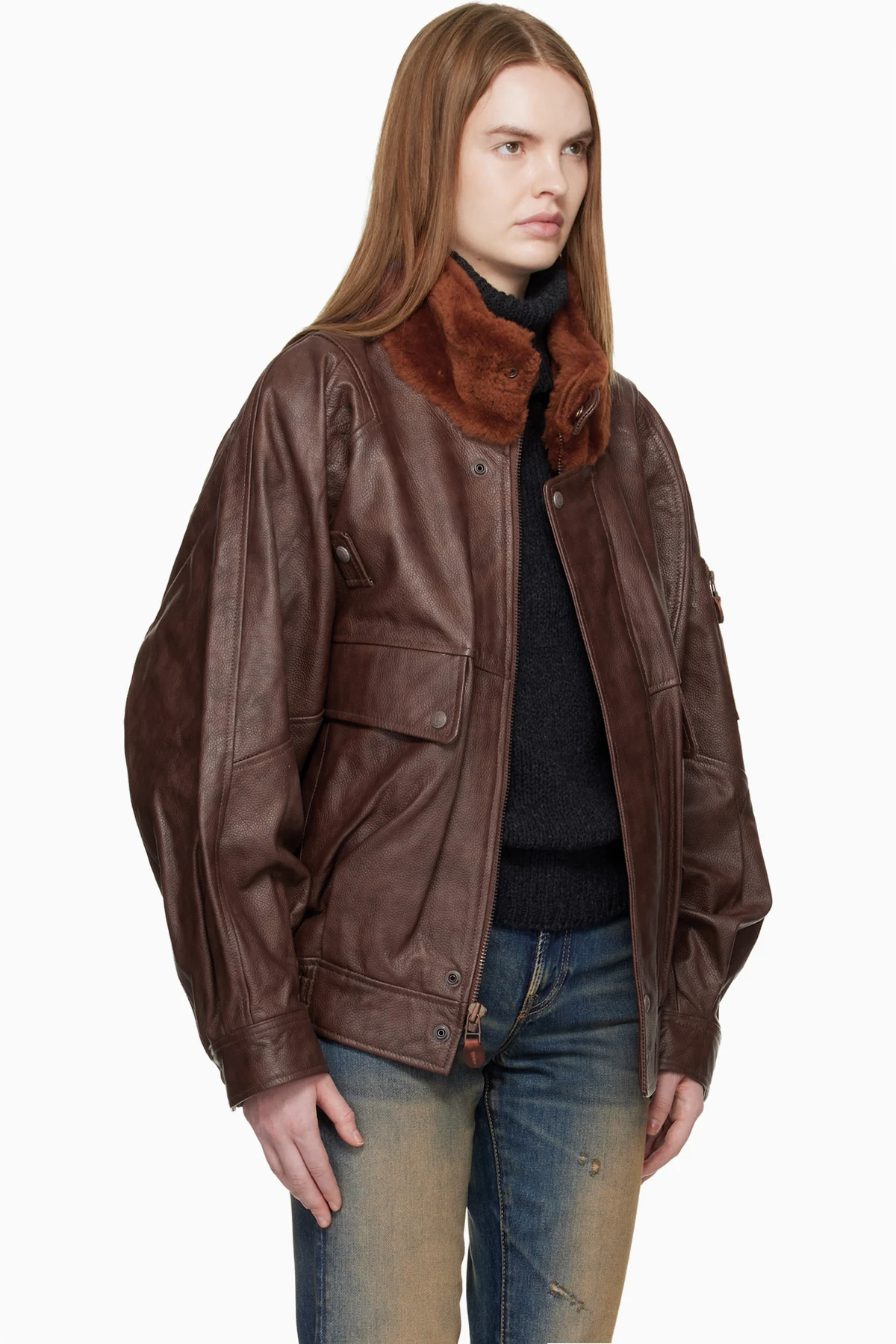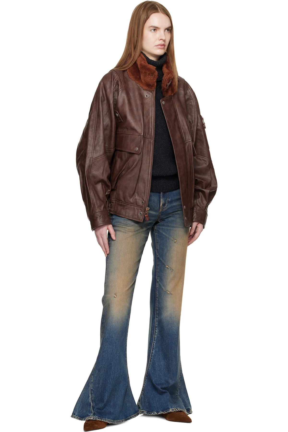 Brown Shearling Collar Flight Leather Jacket