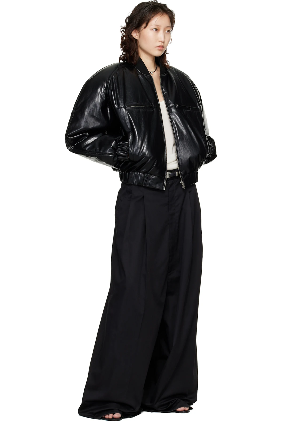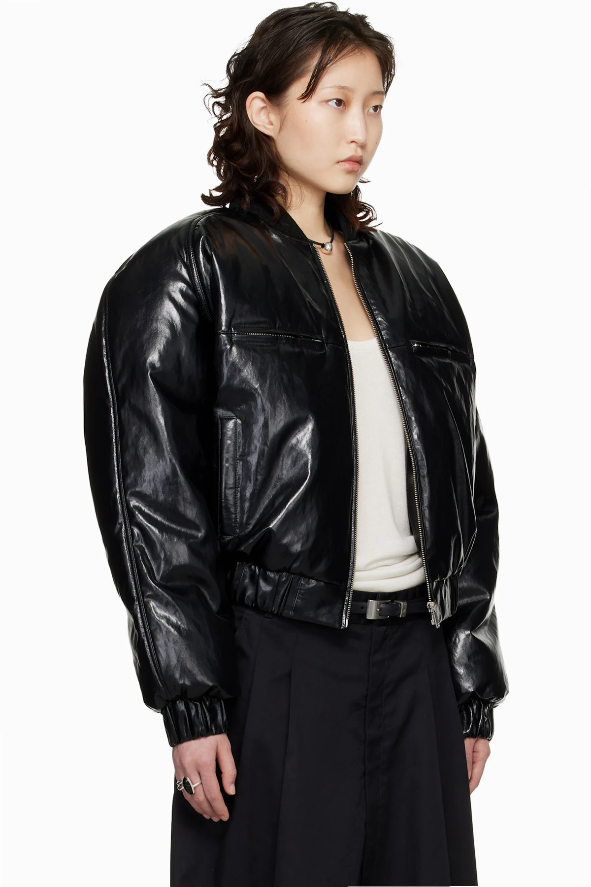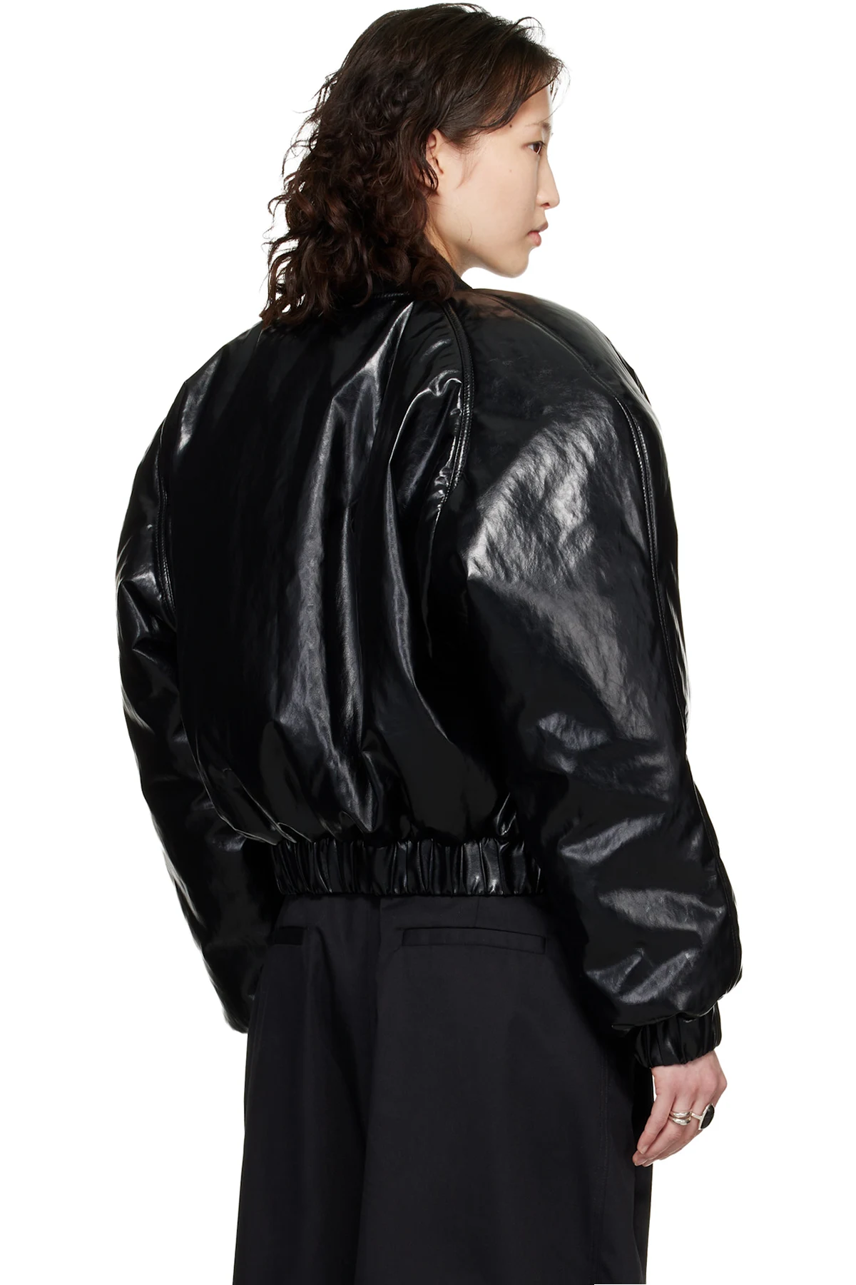 Padded creased faux-leather bomber jacket.