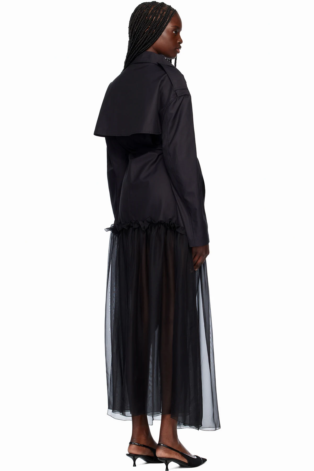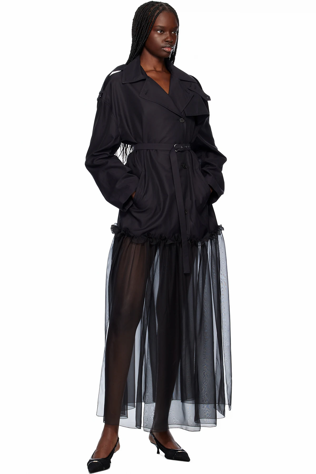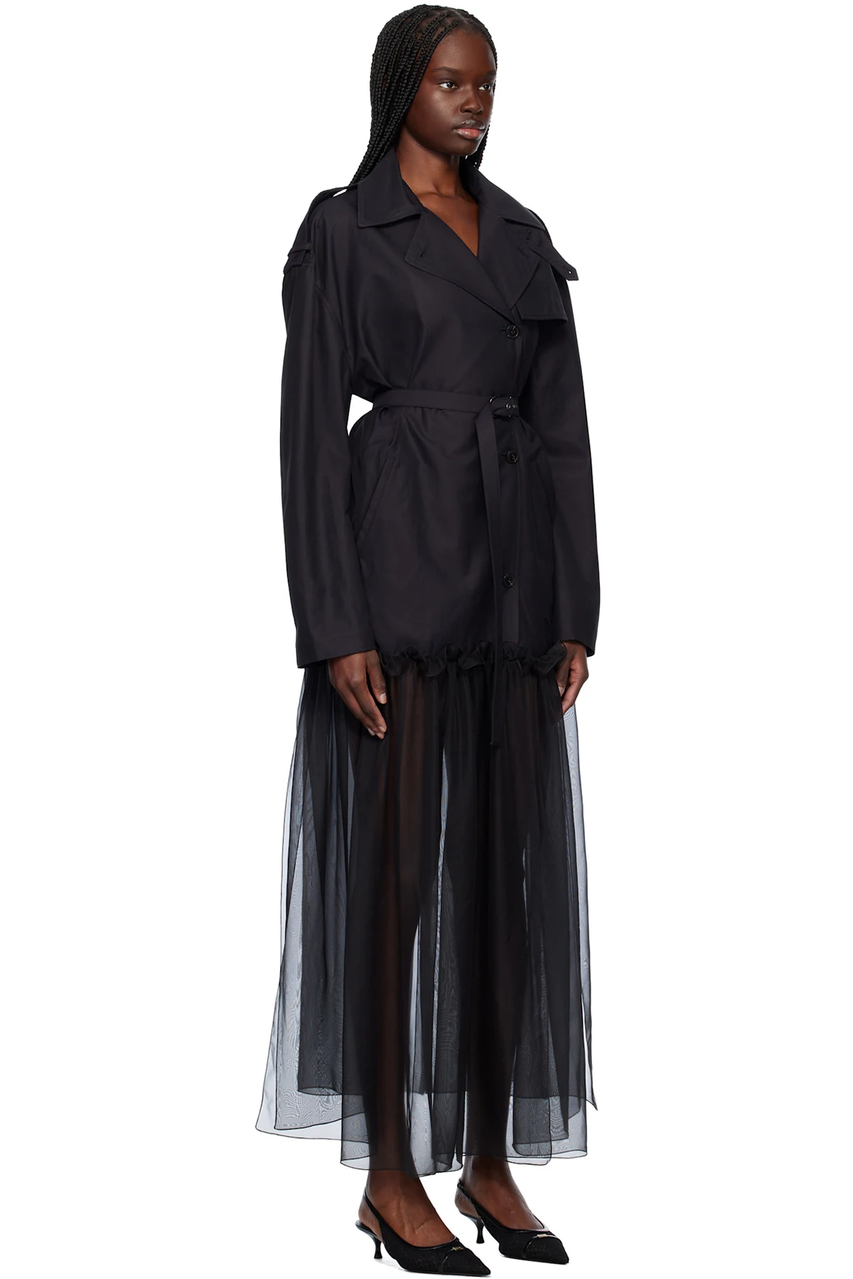 Cotton-blend twill and polyester chiffon trench coat.