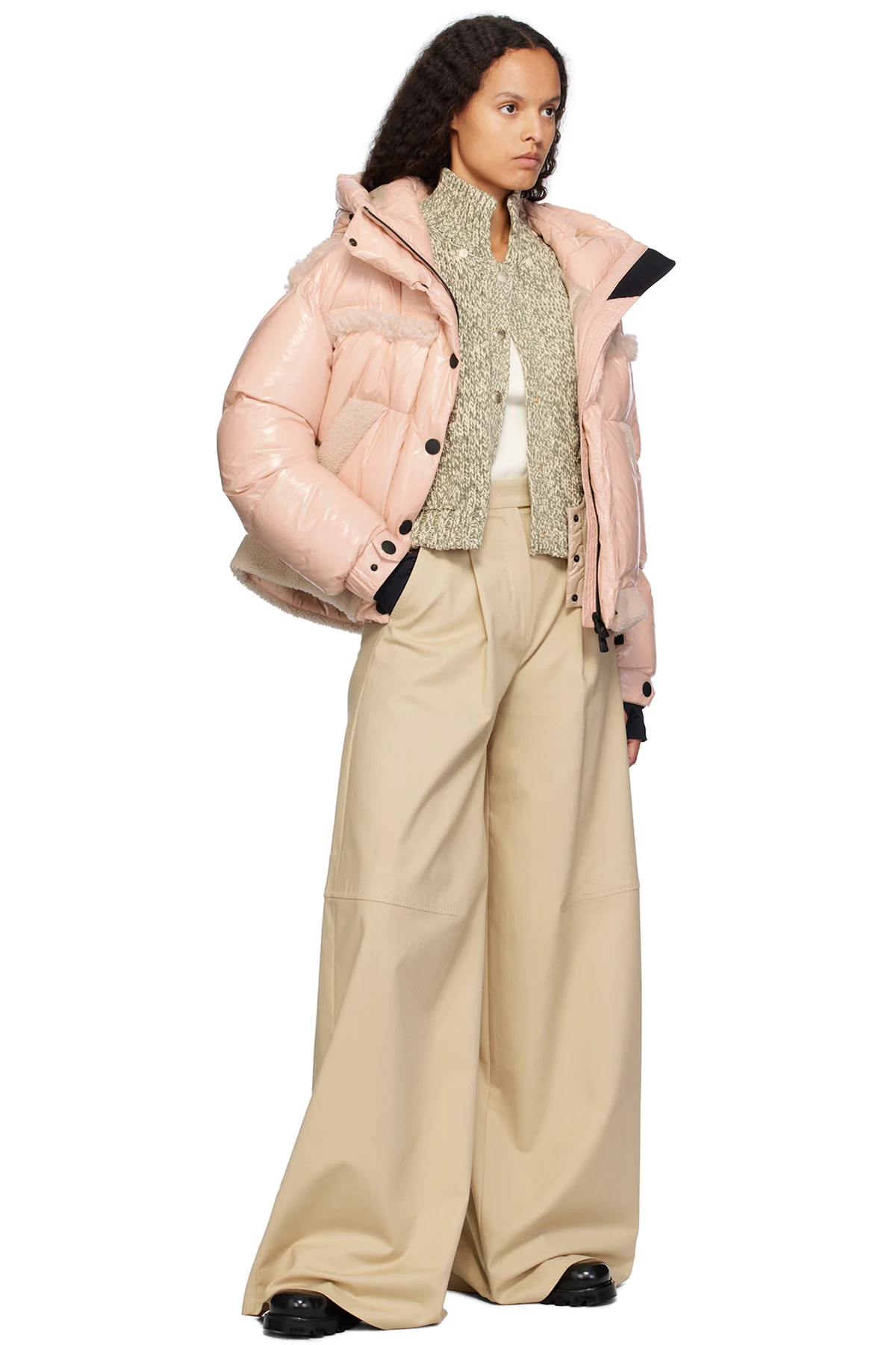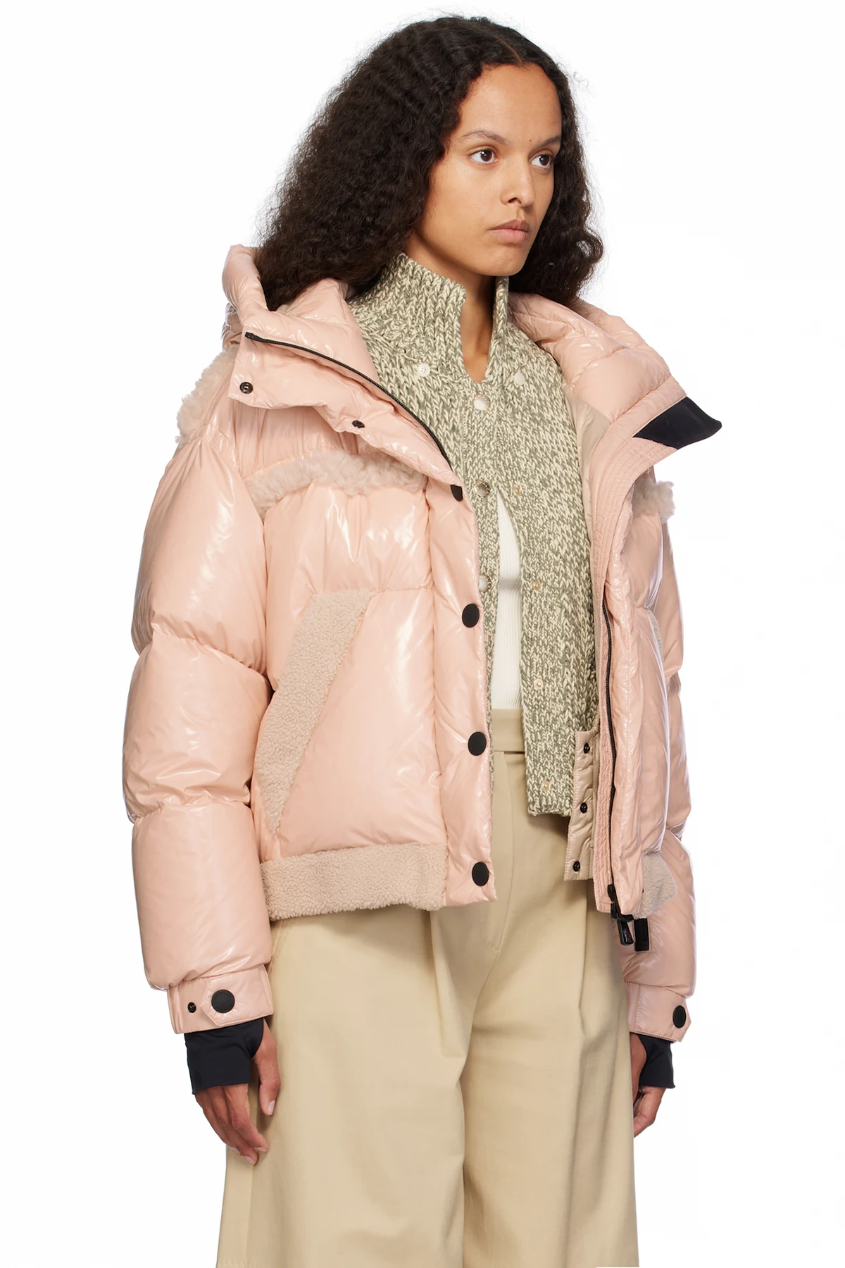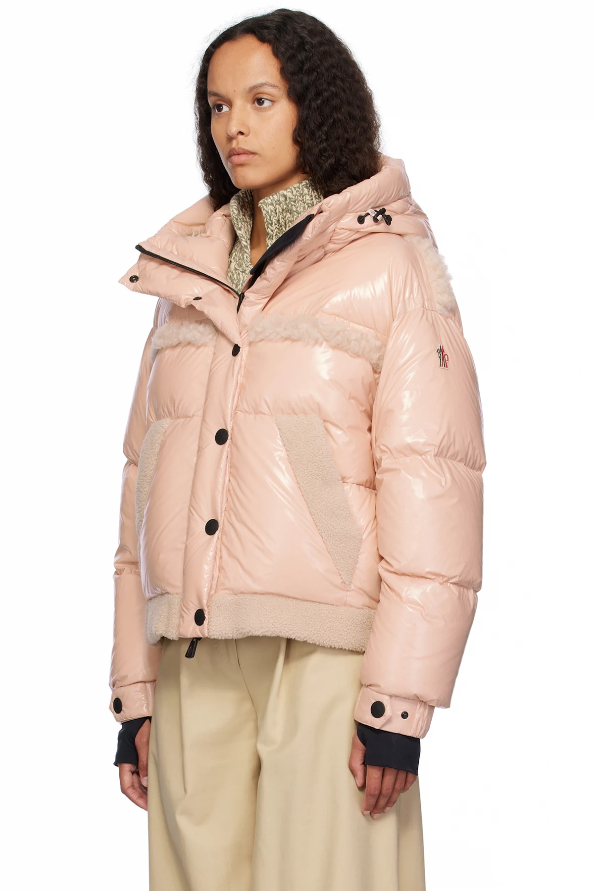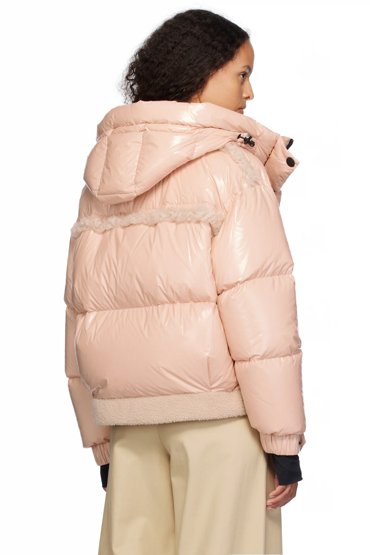 DIST-certified down-filled lightweight nylon satin jacket. Shearling trim throughout.