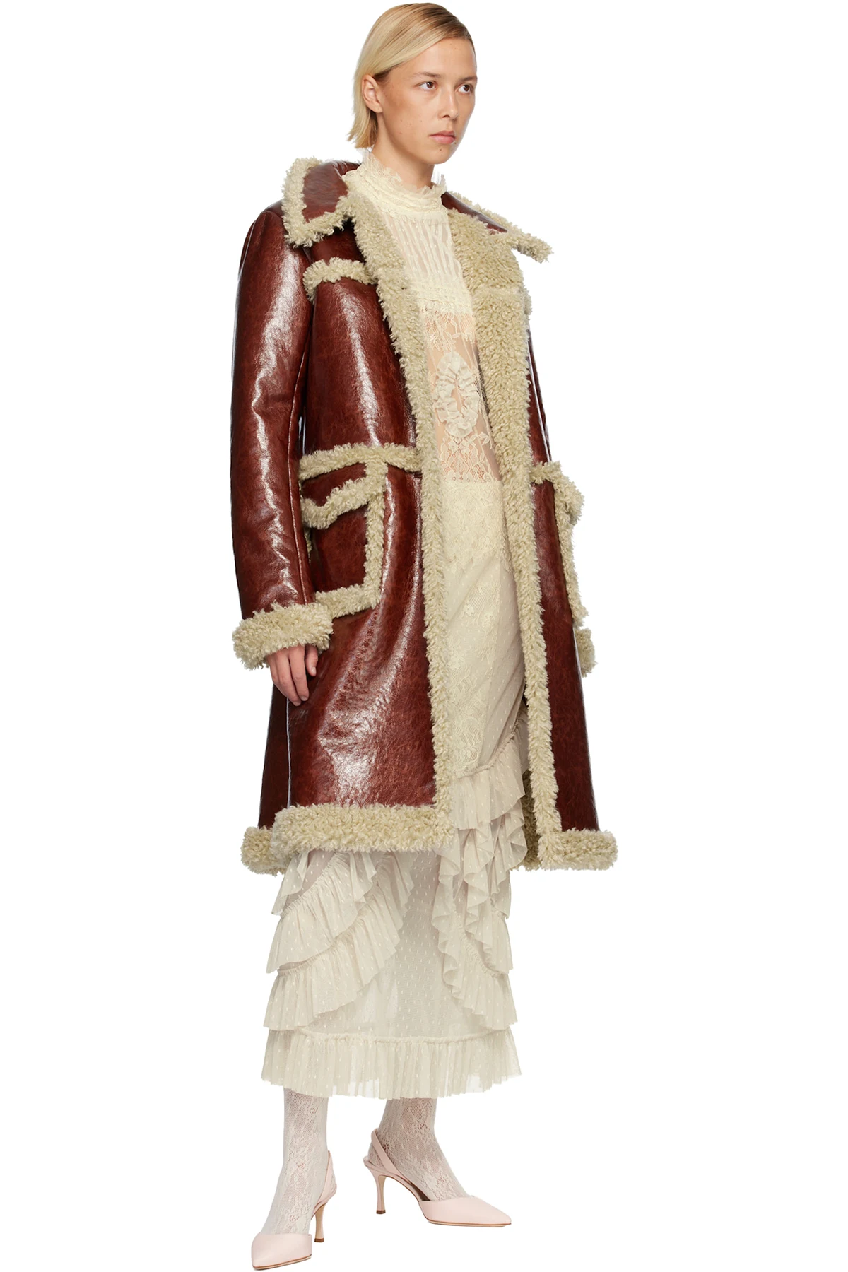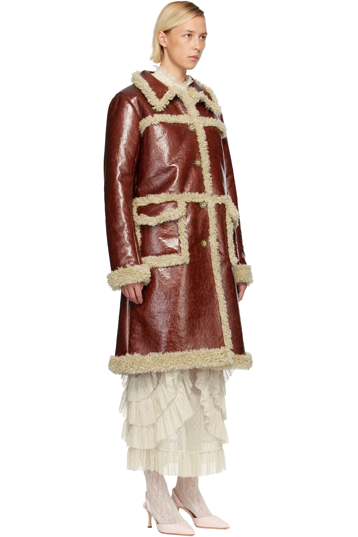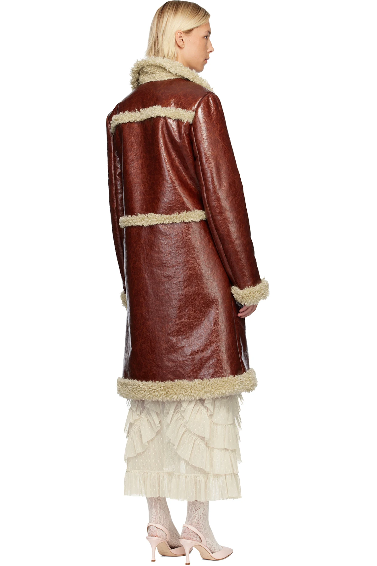 Brown Curly Lamb Trim Faux-Leather Coat