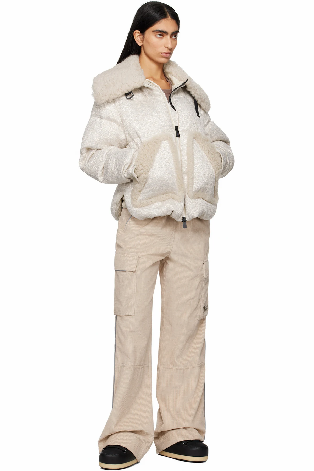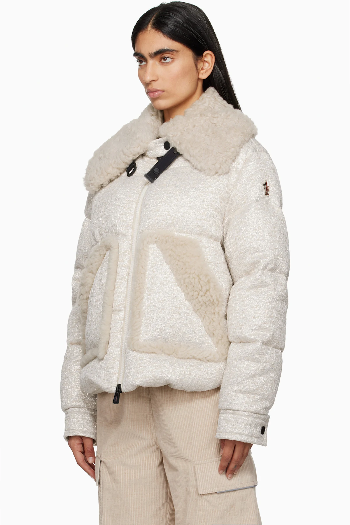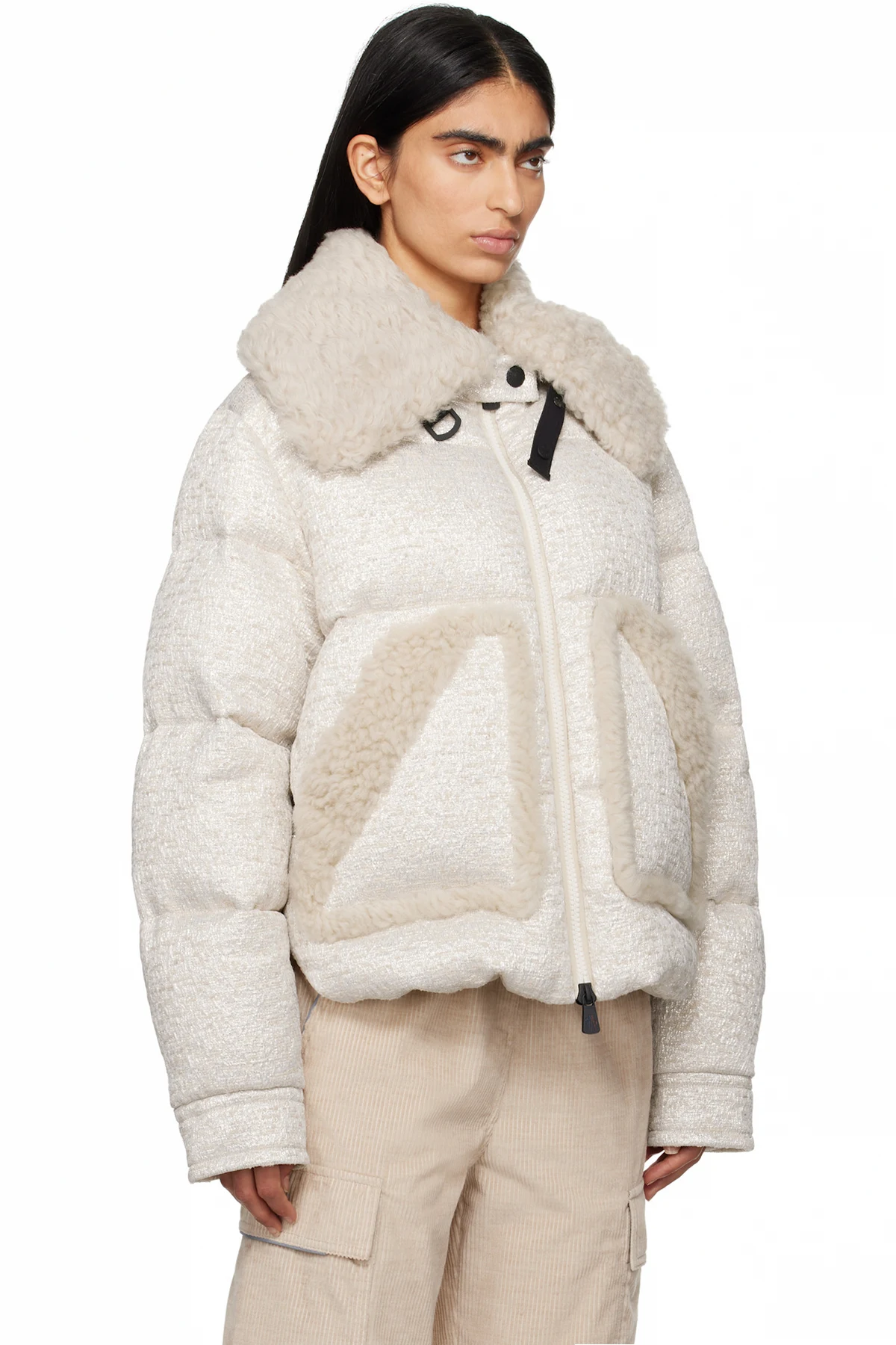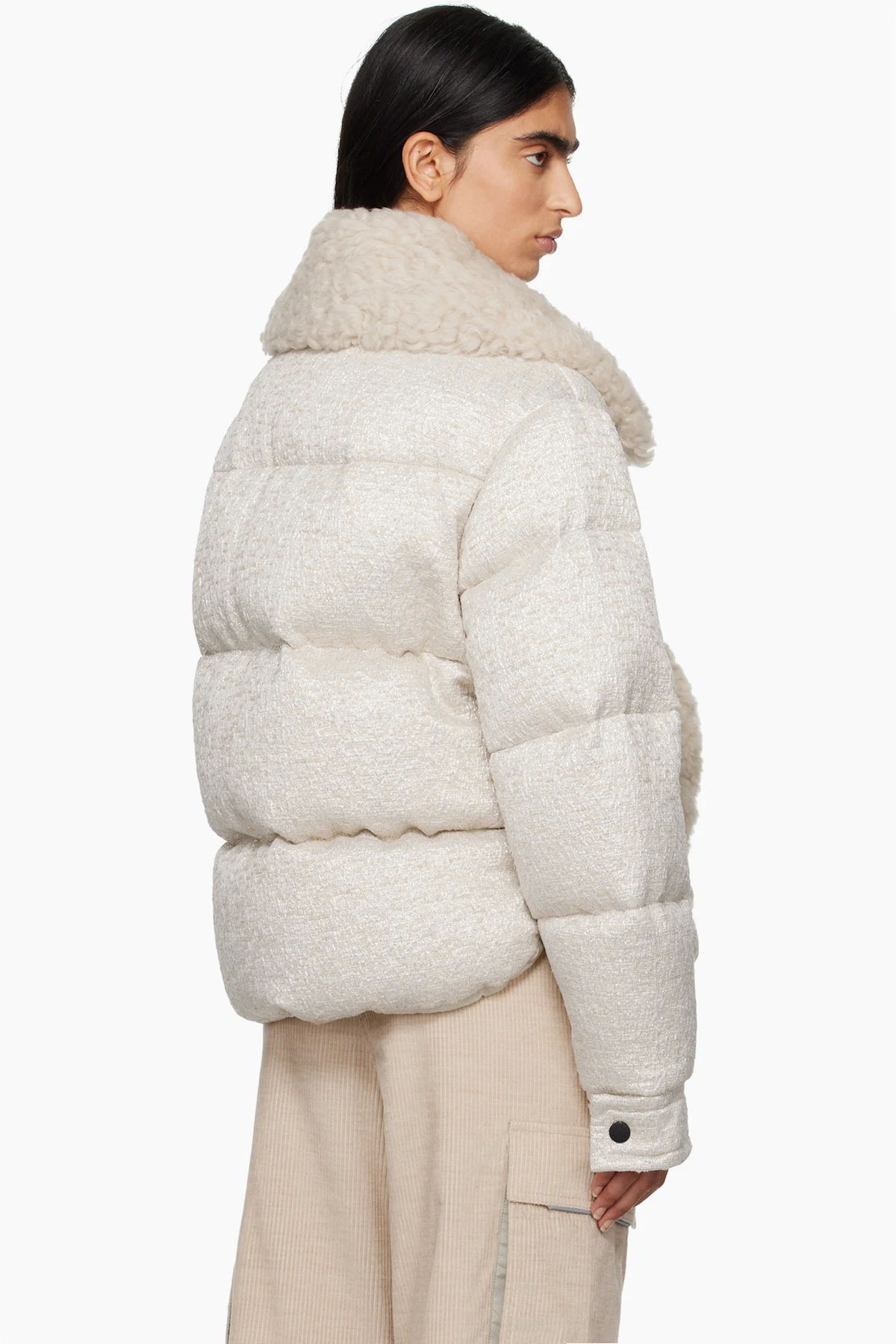 DIST-certified down-filled and quilted polyester-blend tweed jacket. Metallic thread detailing and sheepskin shearling trim throughout.