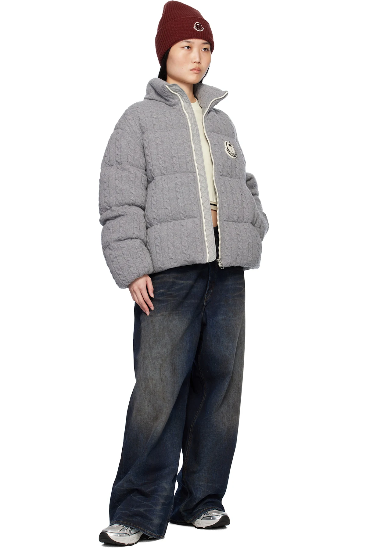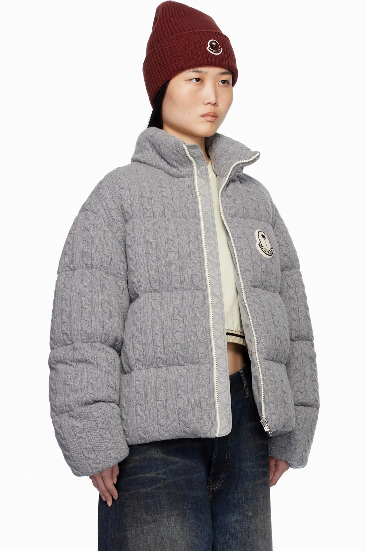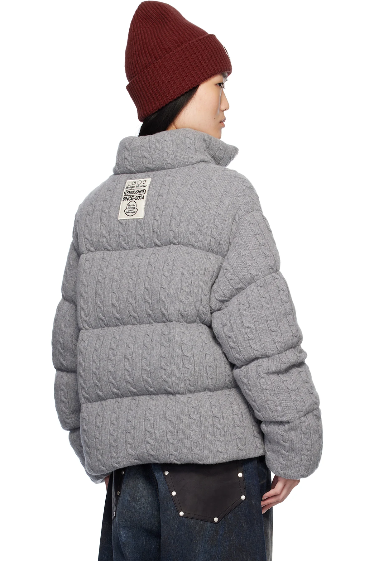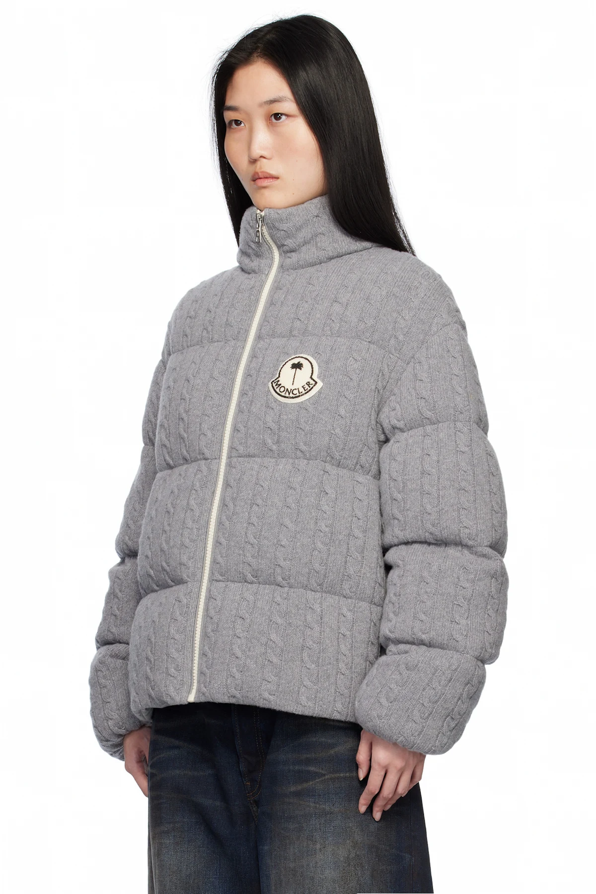 Down-filled and quilted cable knit virgin wool jacket.