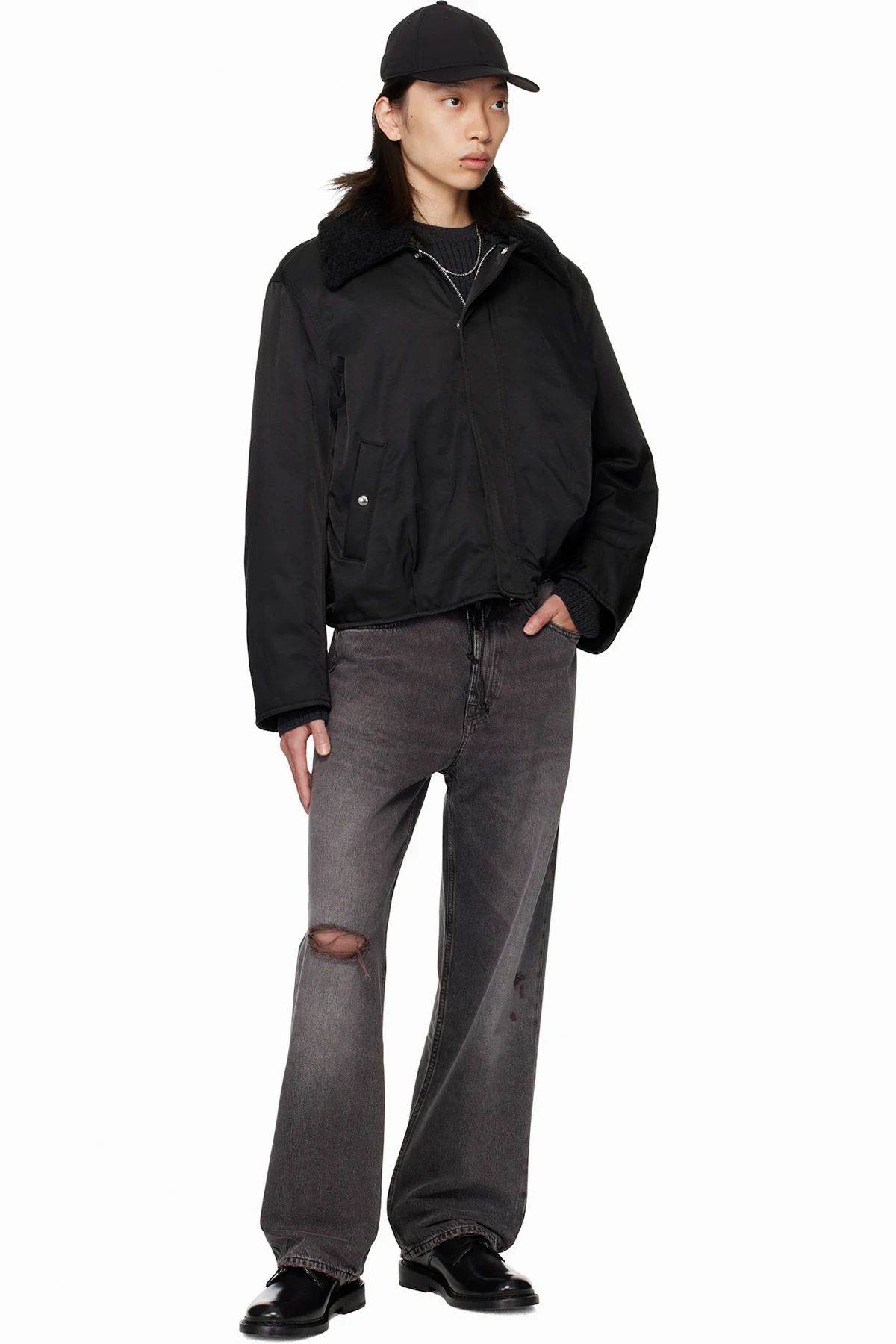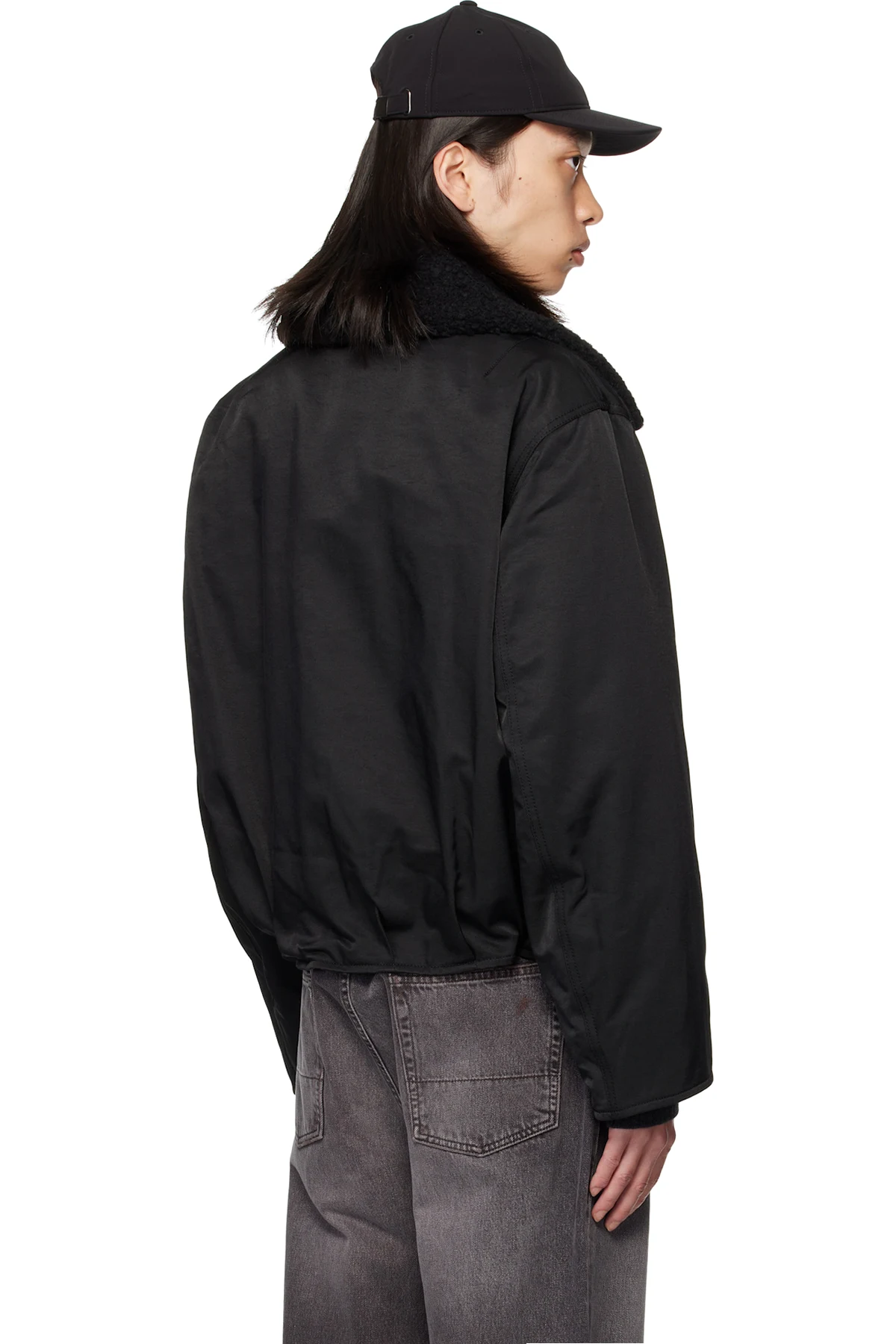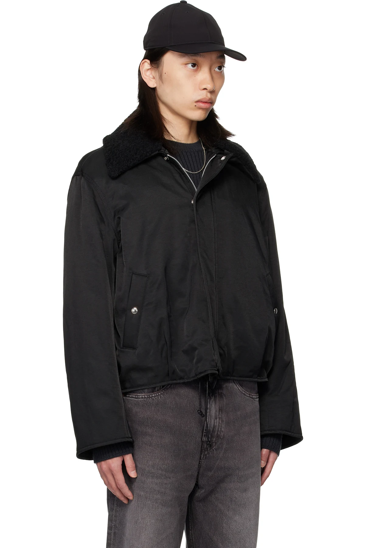 · Detachable faux-shearling trim at spread collar
