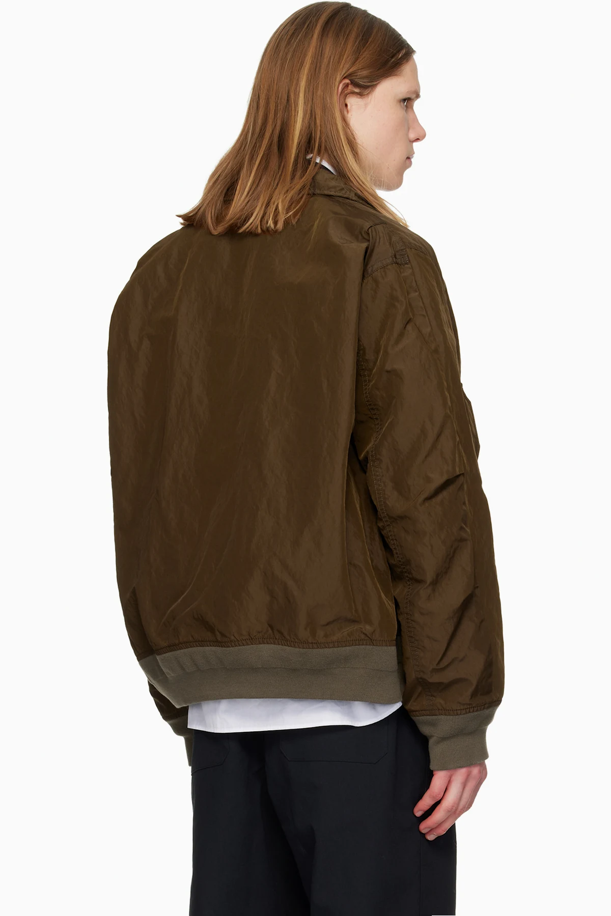 Crinkled nylon twill bomber jacket.