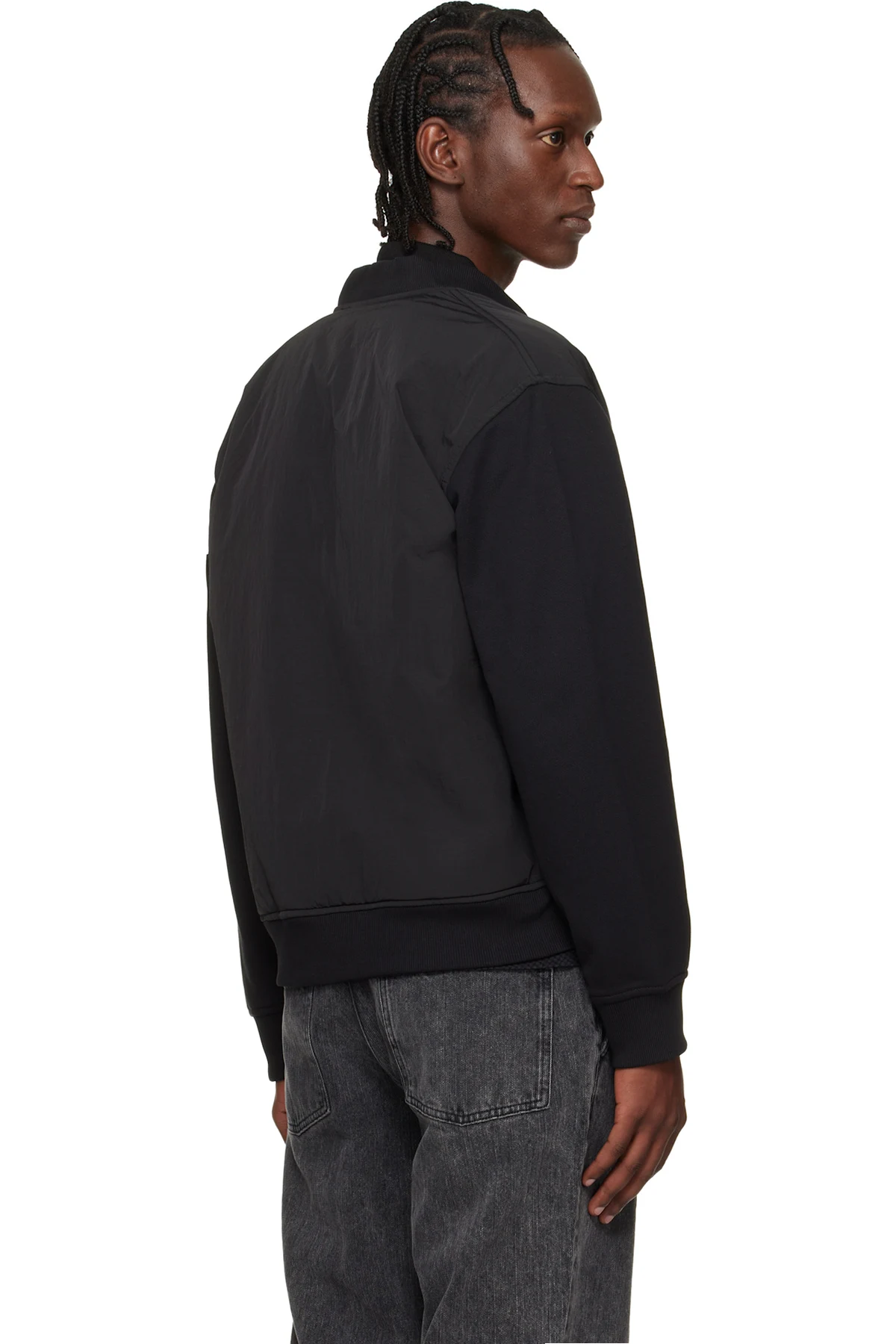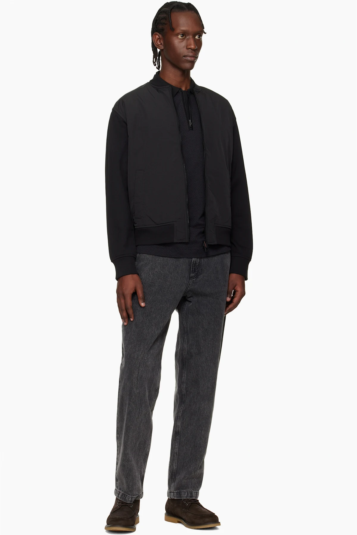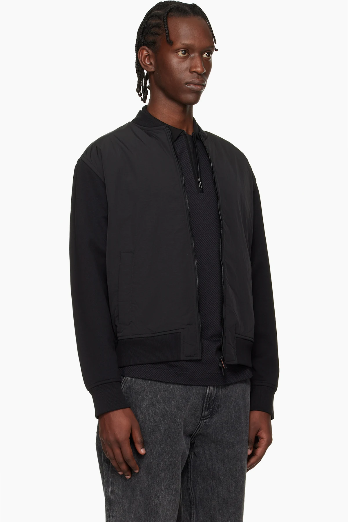 · Rib-knit stand collar, hem, and cuffs