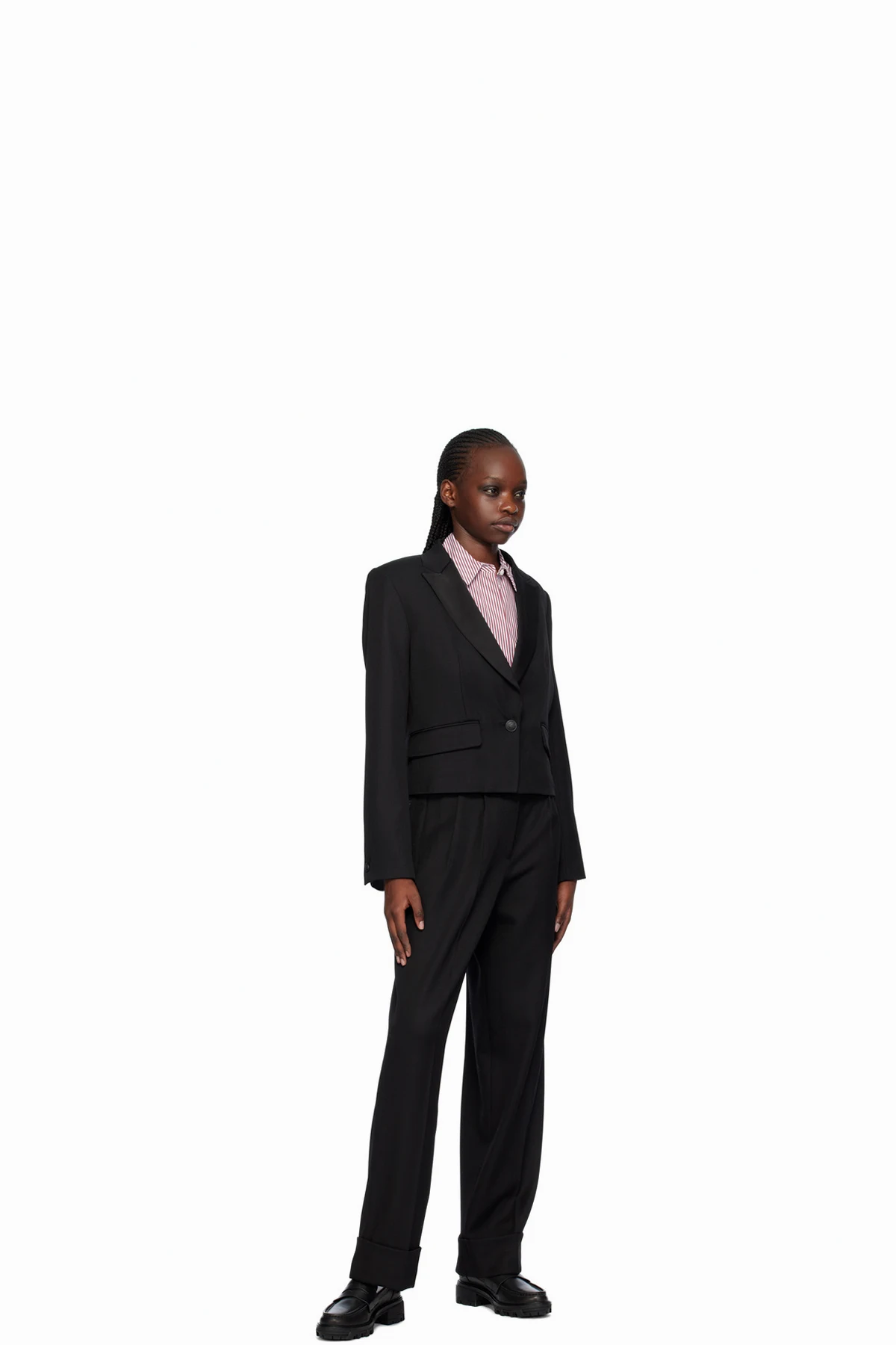 · Satin trim at peaked lapel