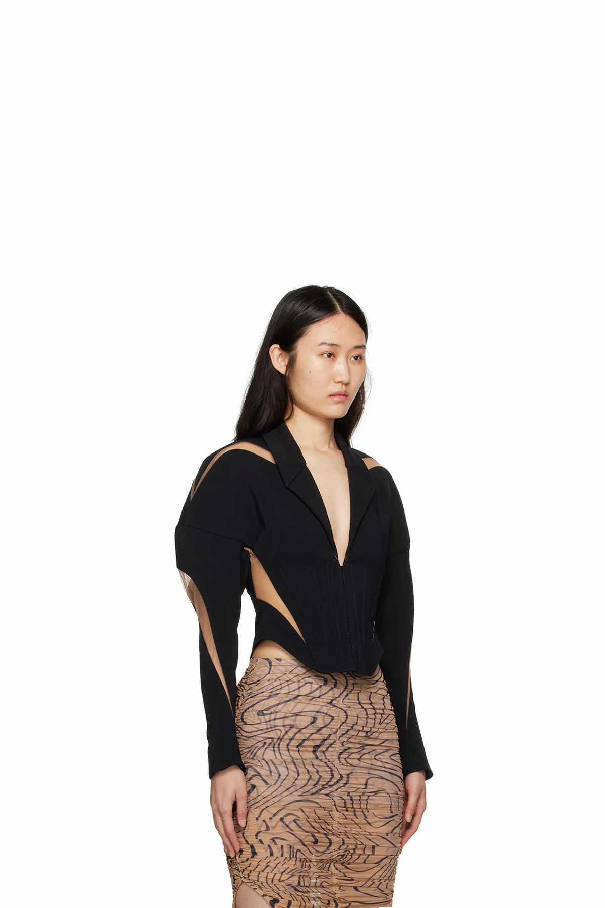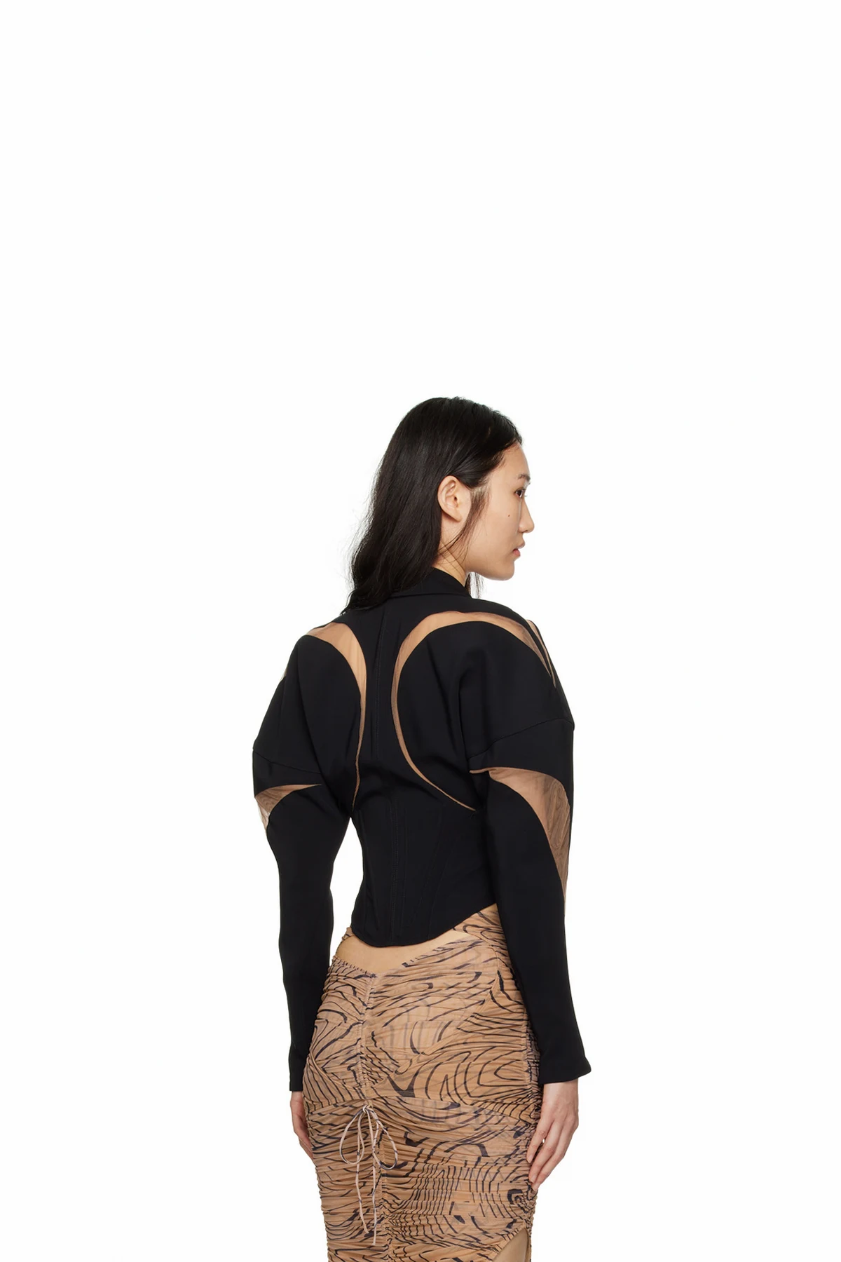 Semi-sheer viscose crepe and mesh blazer. Boning throughout.