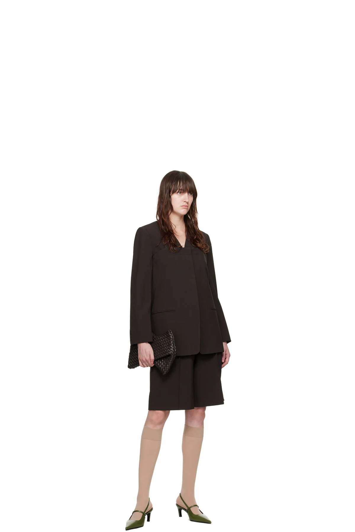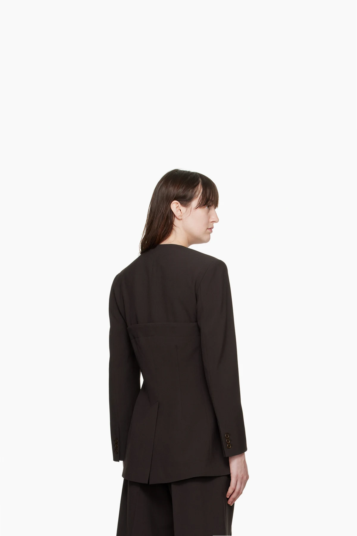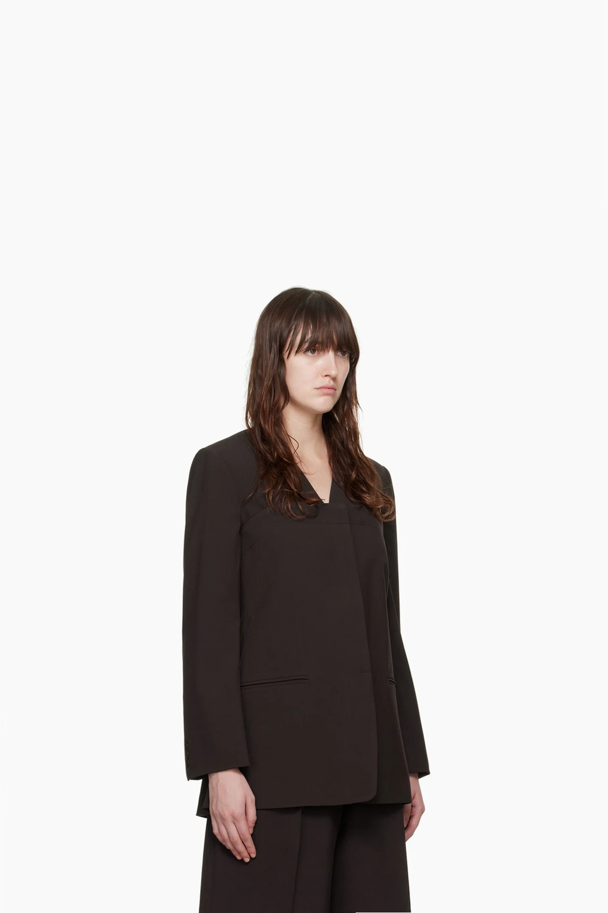 Stretch polyester- and viscose-blend barathea blazer. Detachable button panel for alternate styling.