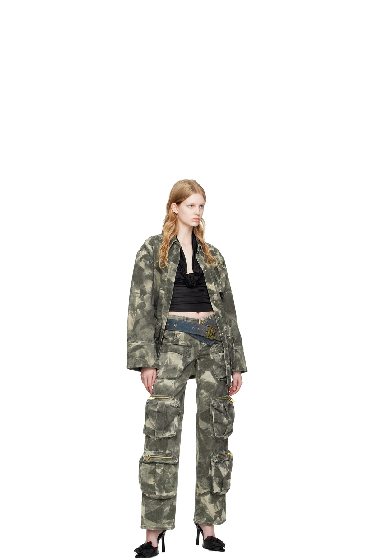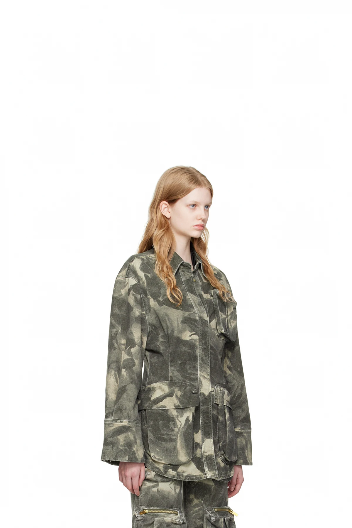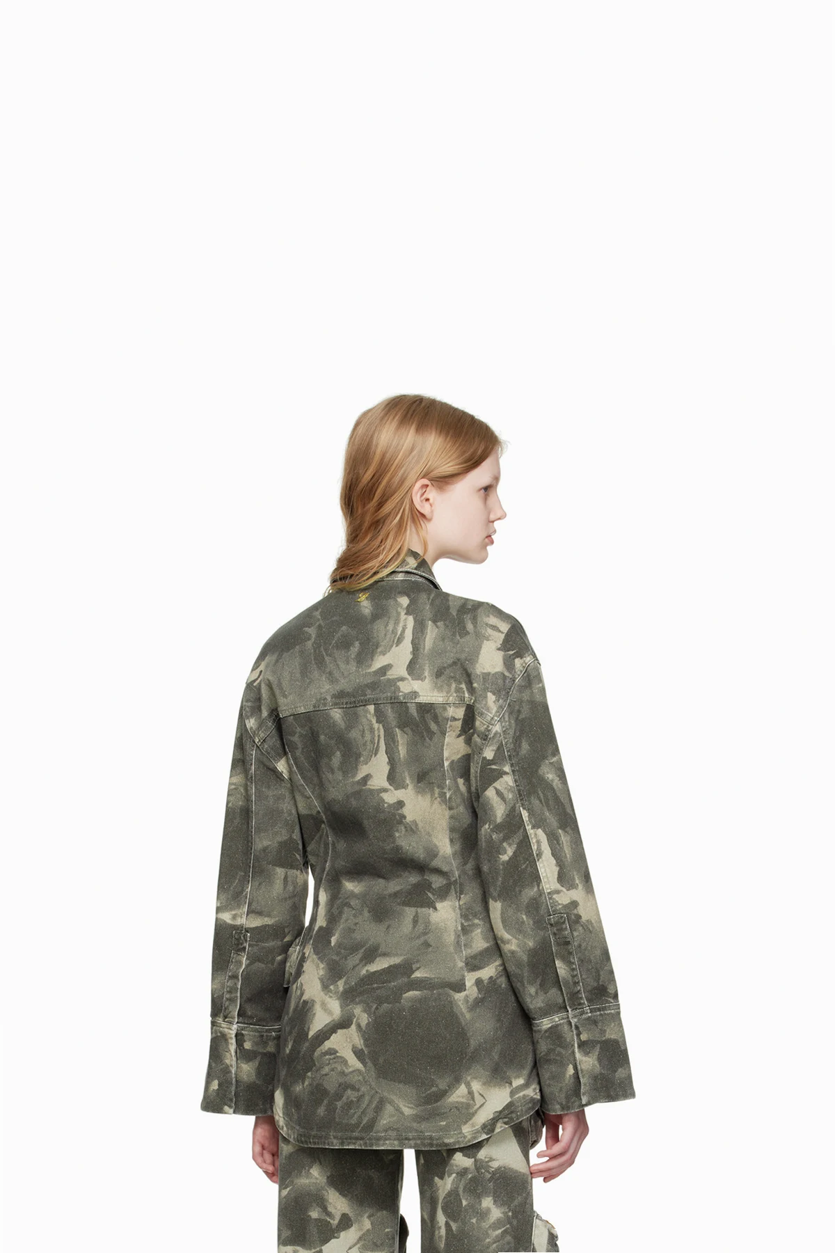 Stretch denim jacket. Camouflage pattern printed throughout.