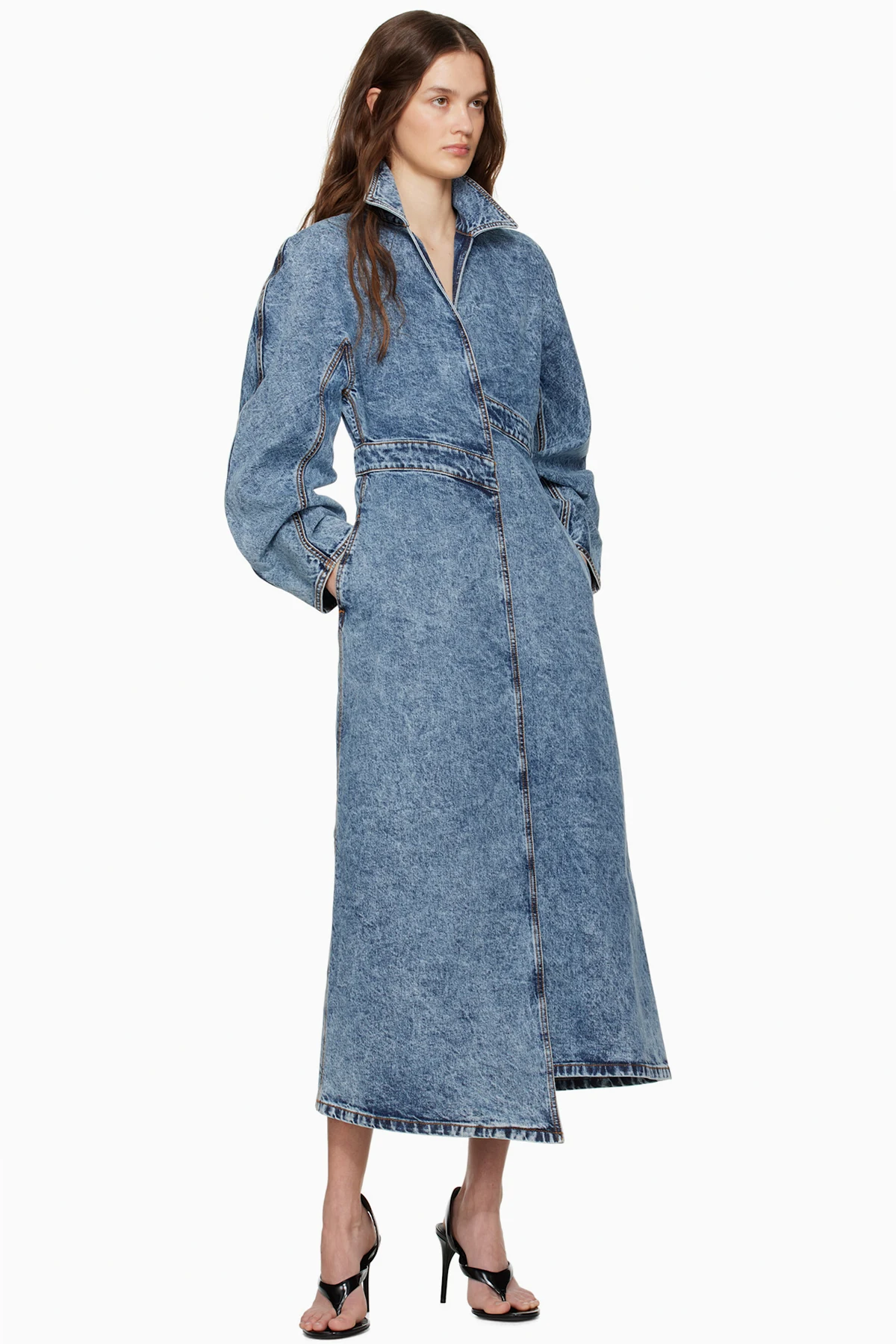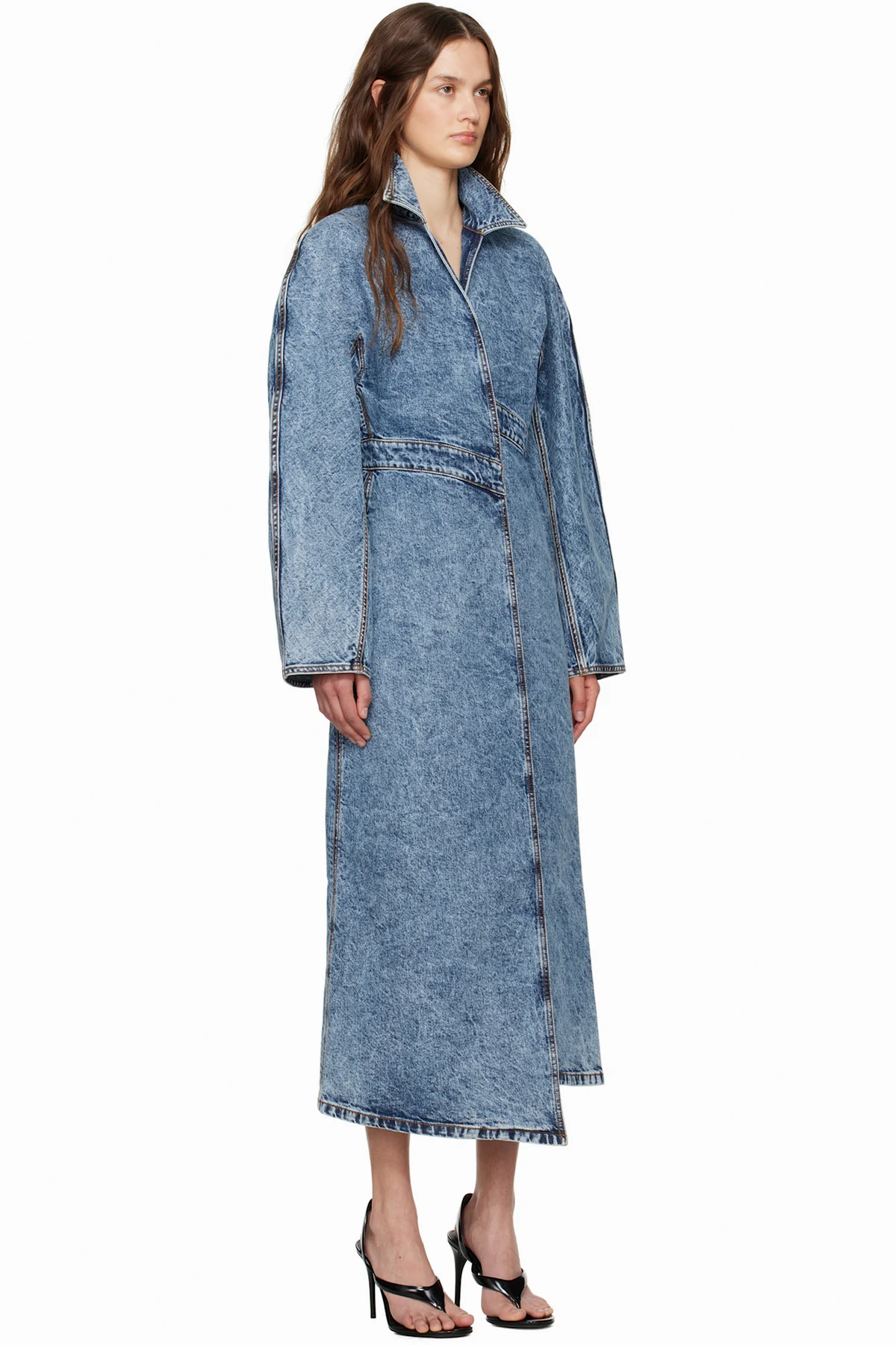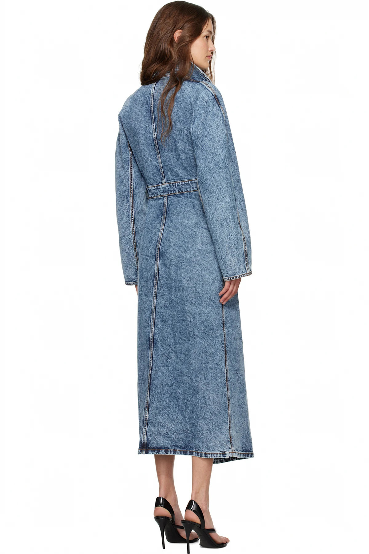 Stretch denim trench coat. Fading throughout.