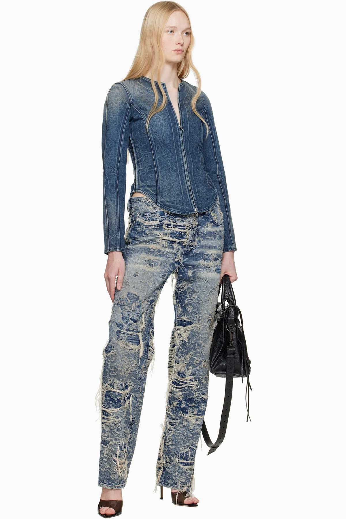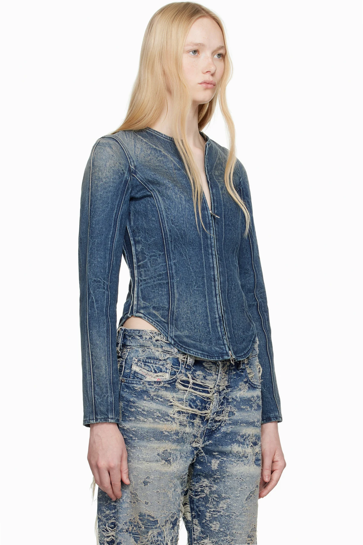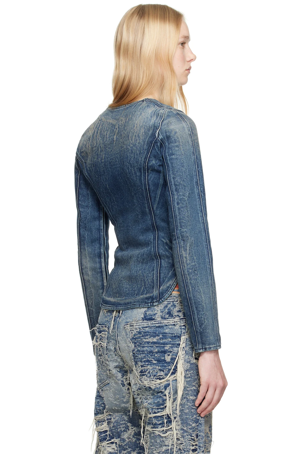 Stretch cotton- and hemp-blend denim jacket. Hand-brushed fading and whiskering throughout.
