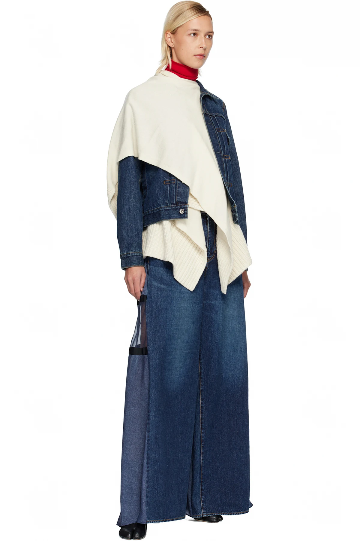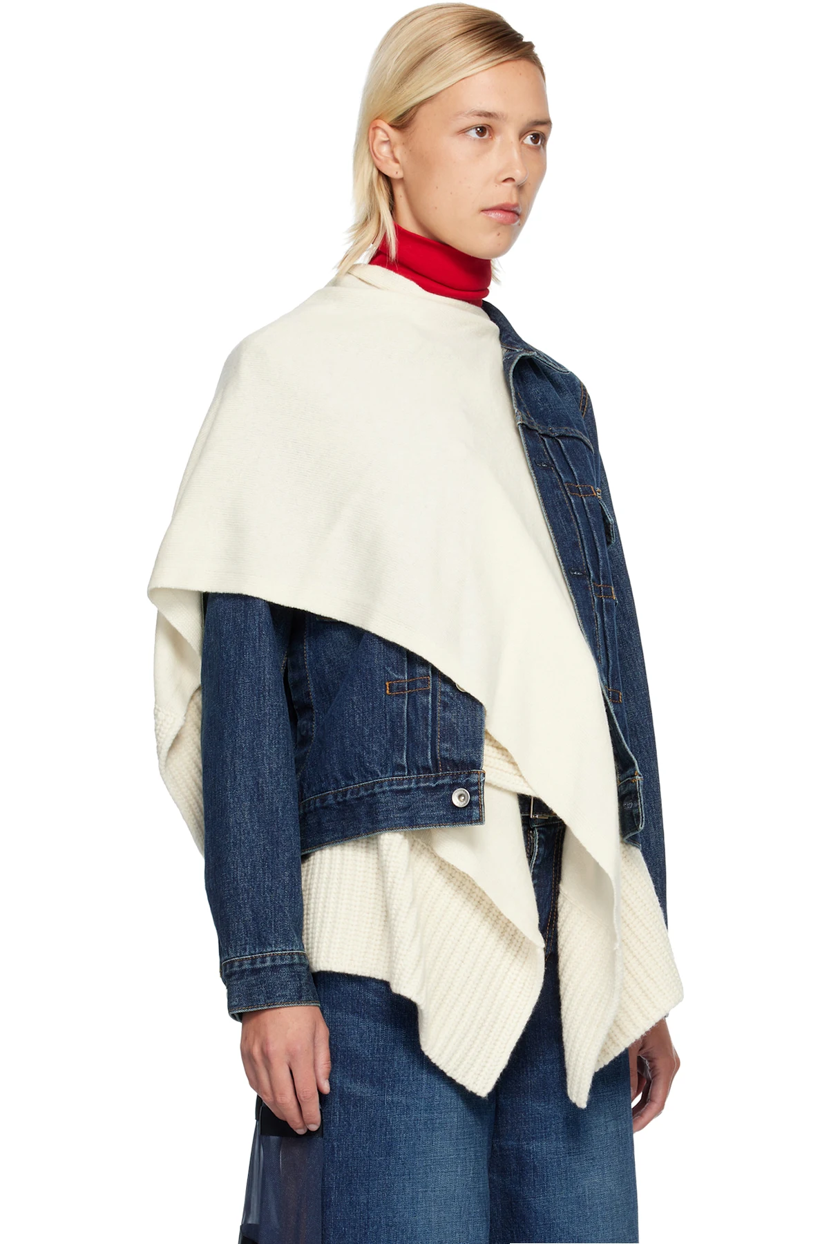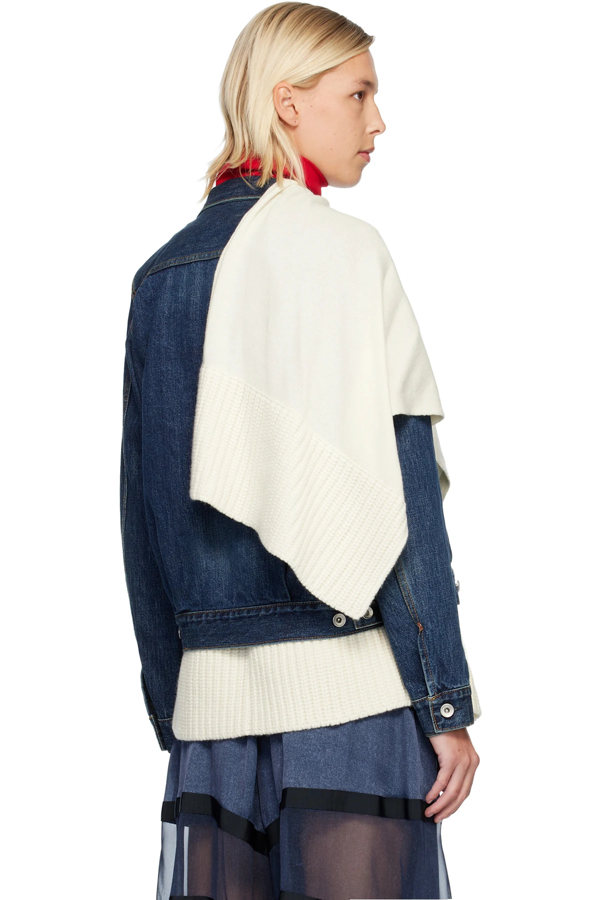 Non-stretch denim jacket and insulated satin vest set. Vest features draped knit wool panels and two-way zip closure. Connecting press-studs at interior.