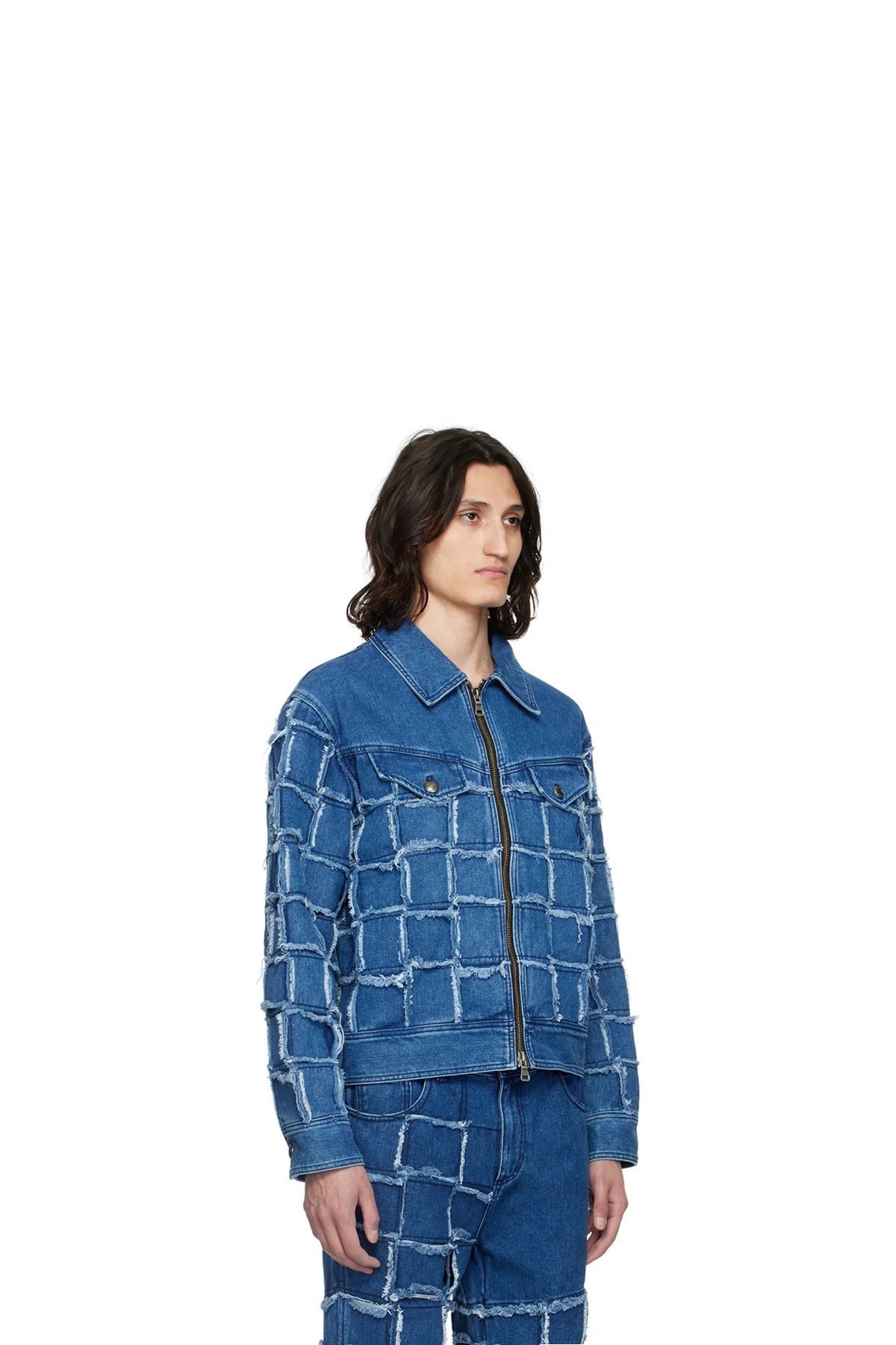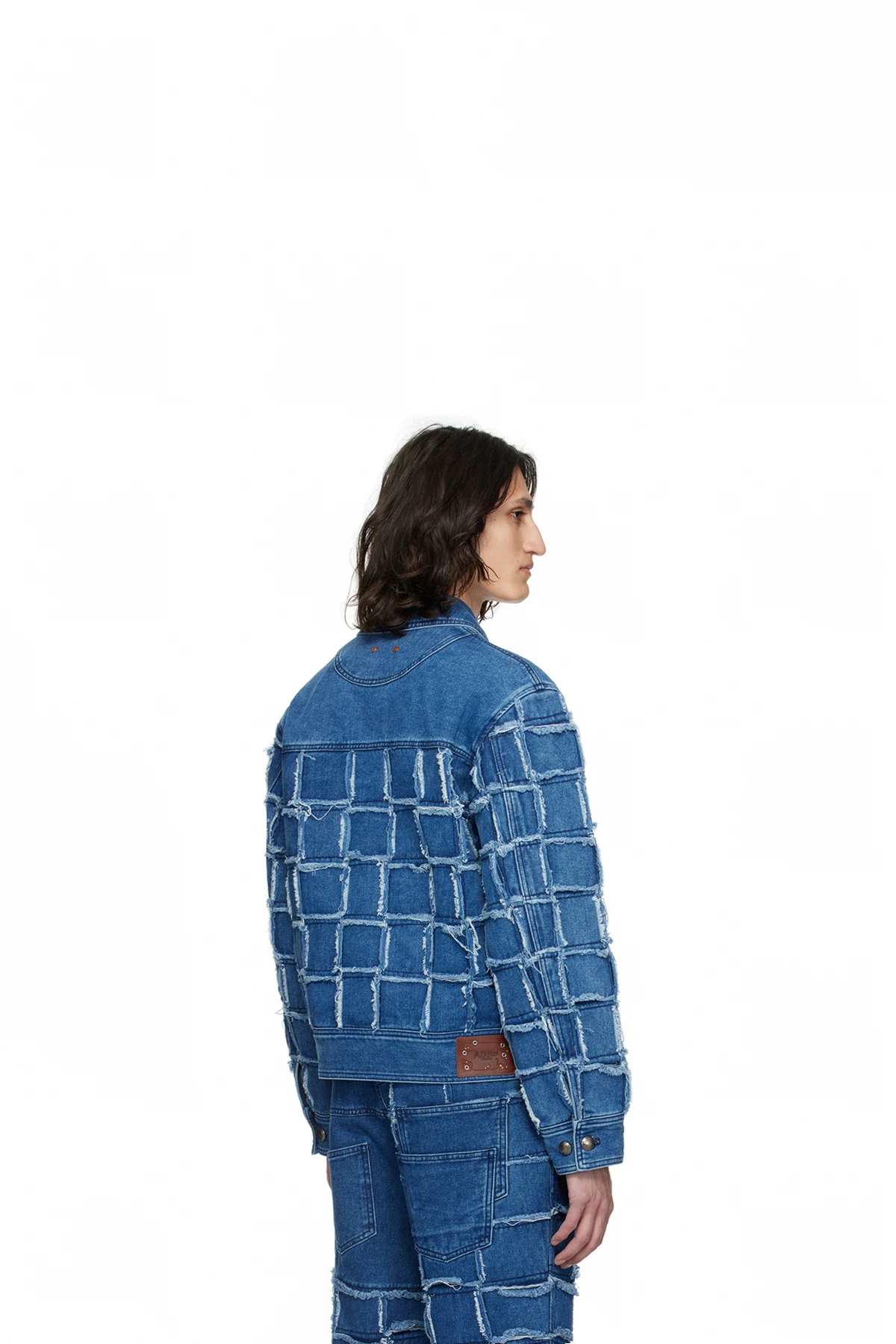 12 oz non-stretch denim jacket. Frayed edges throughout.