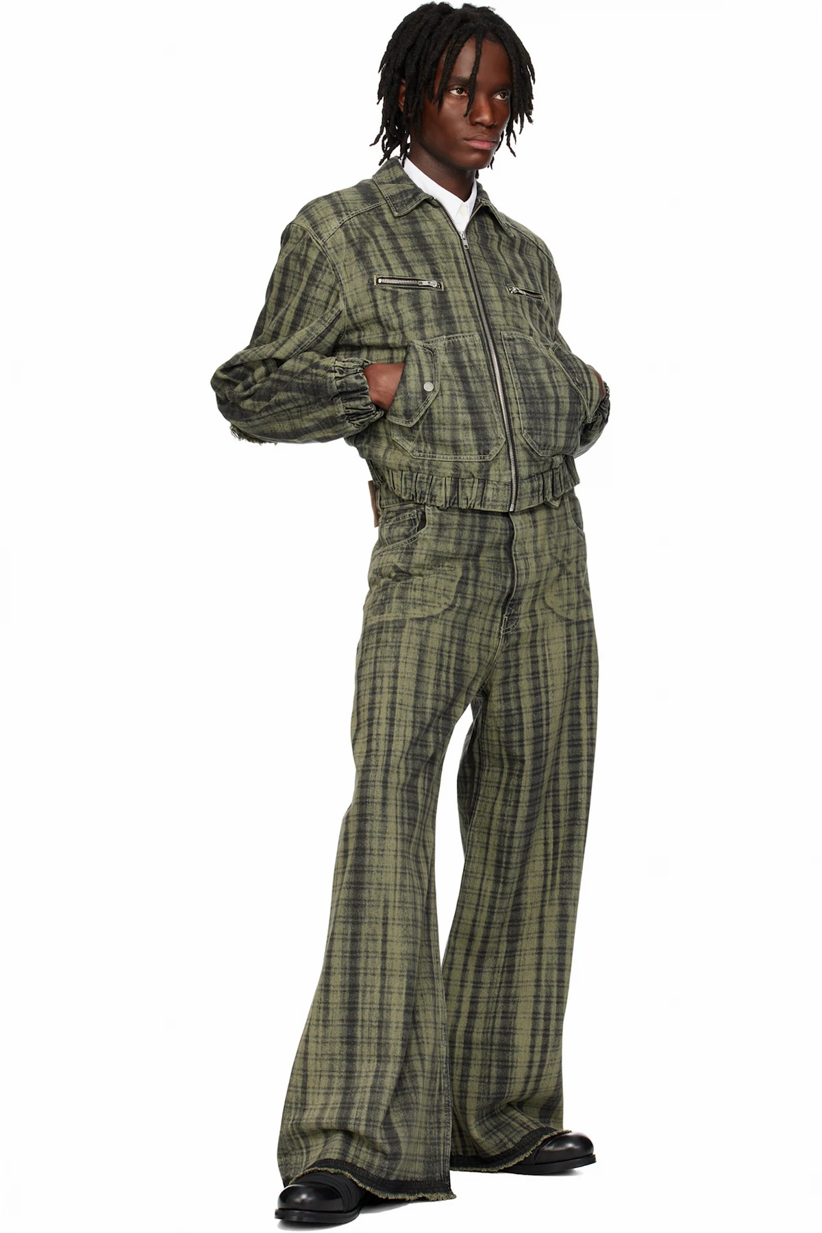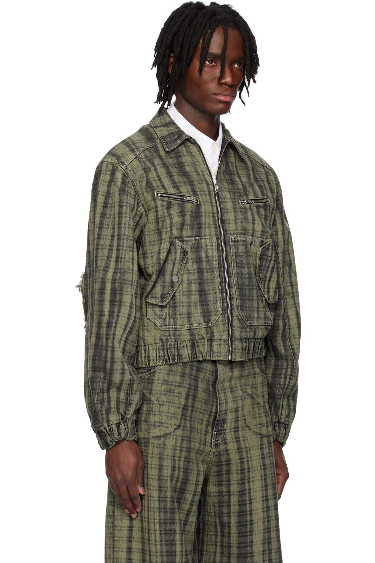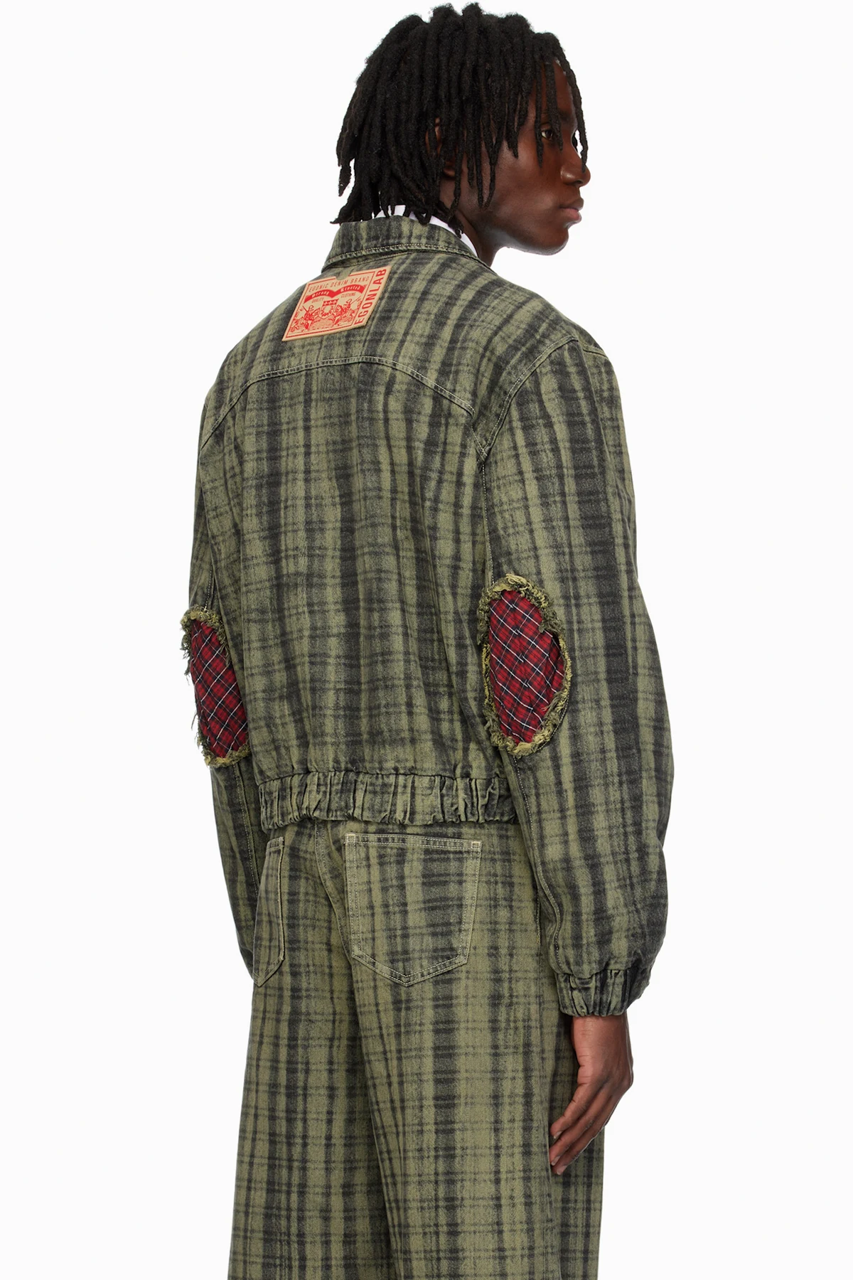 Non-stretch denim bomber jacket. Fading and printed check pattern throughout.