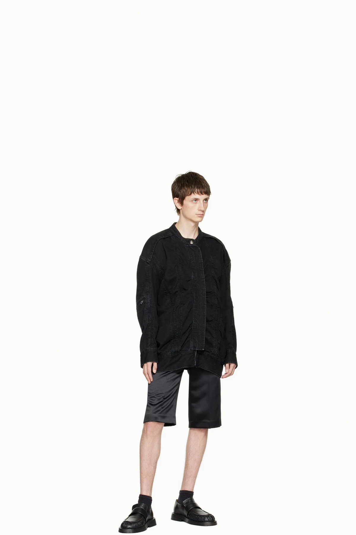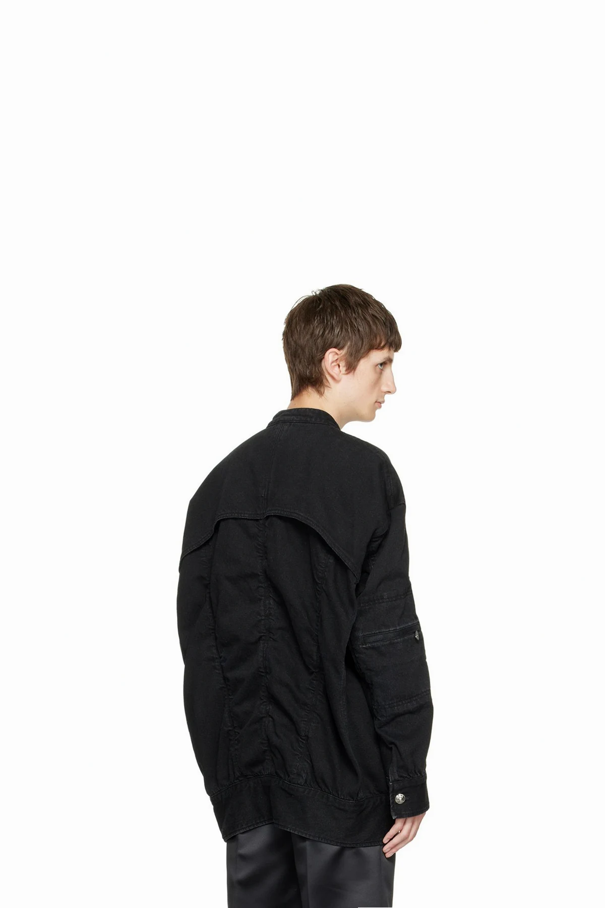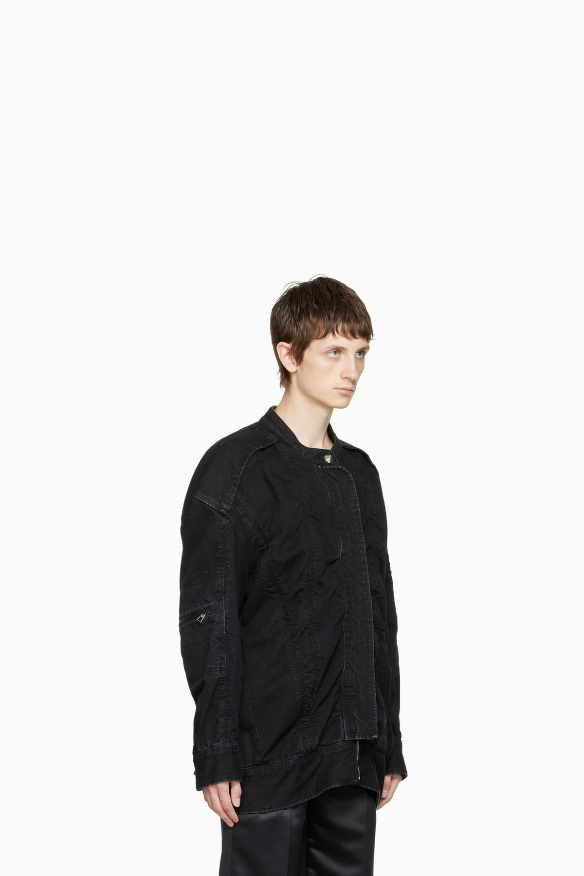 Long sleeve non-stretch denim jacket in black featuring ruching throughout.