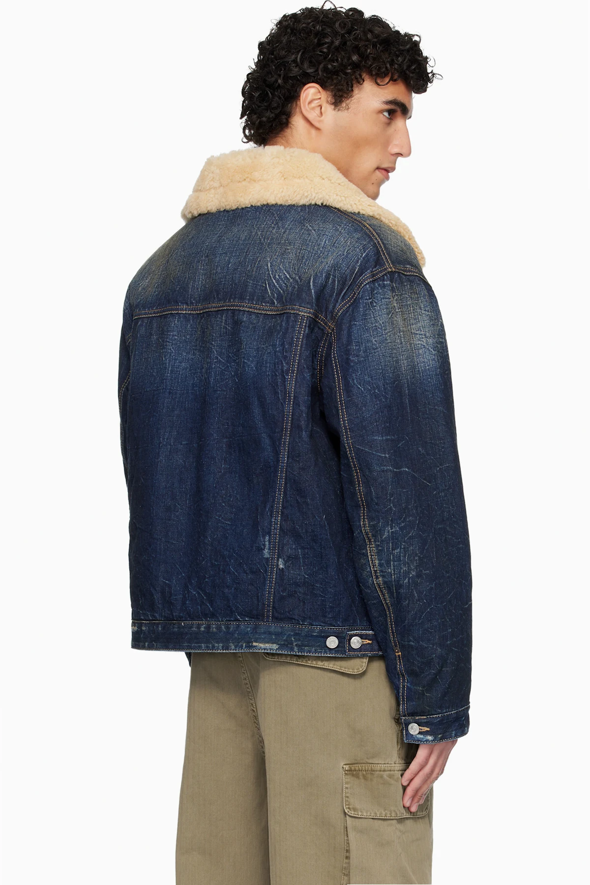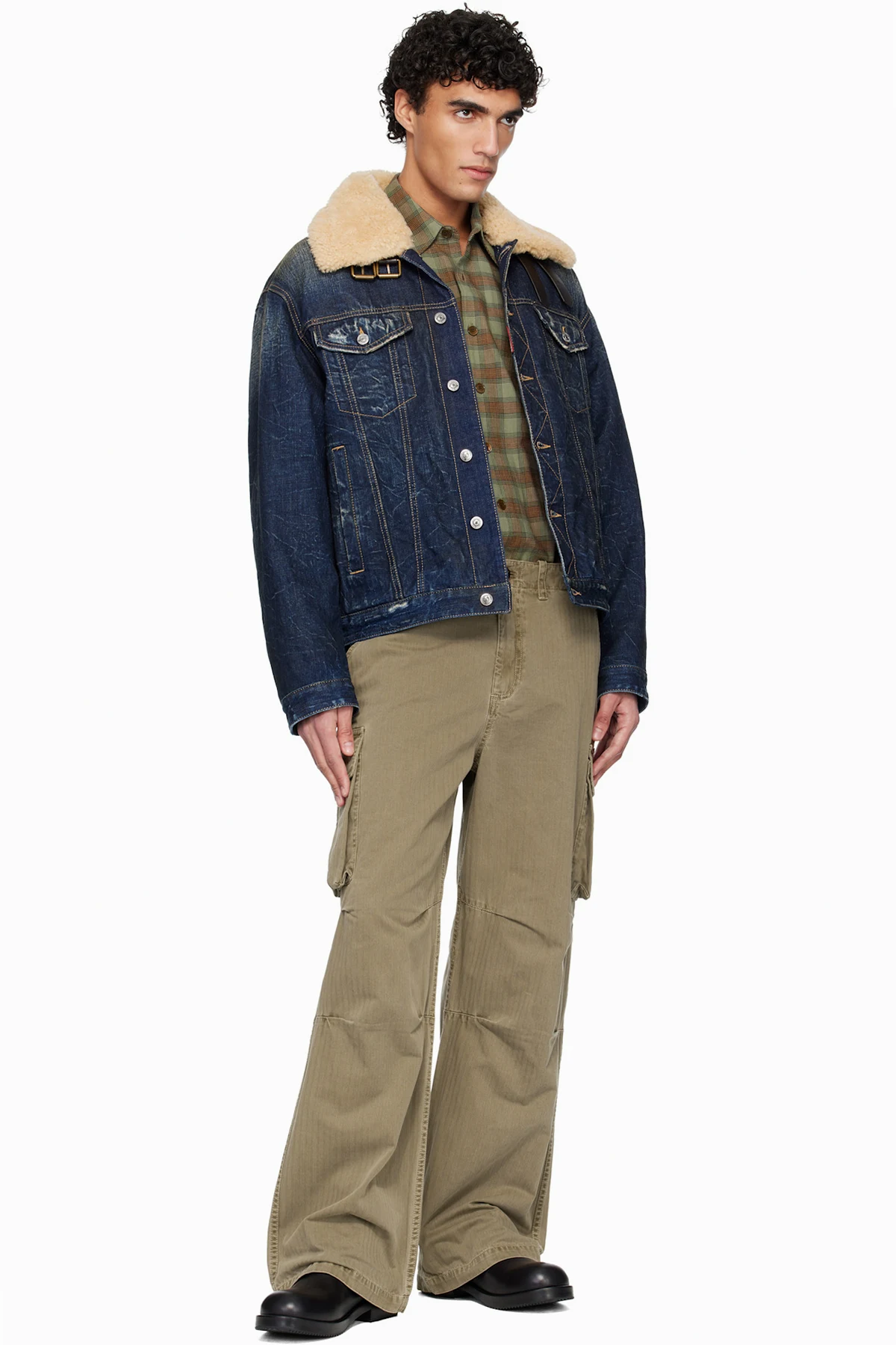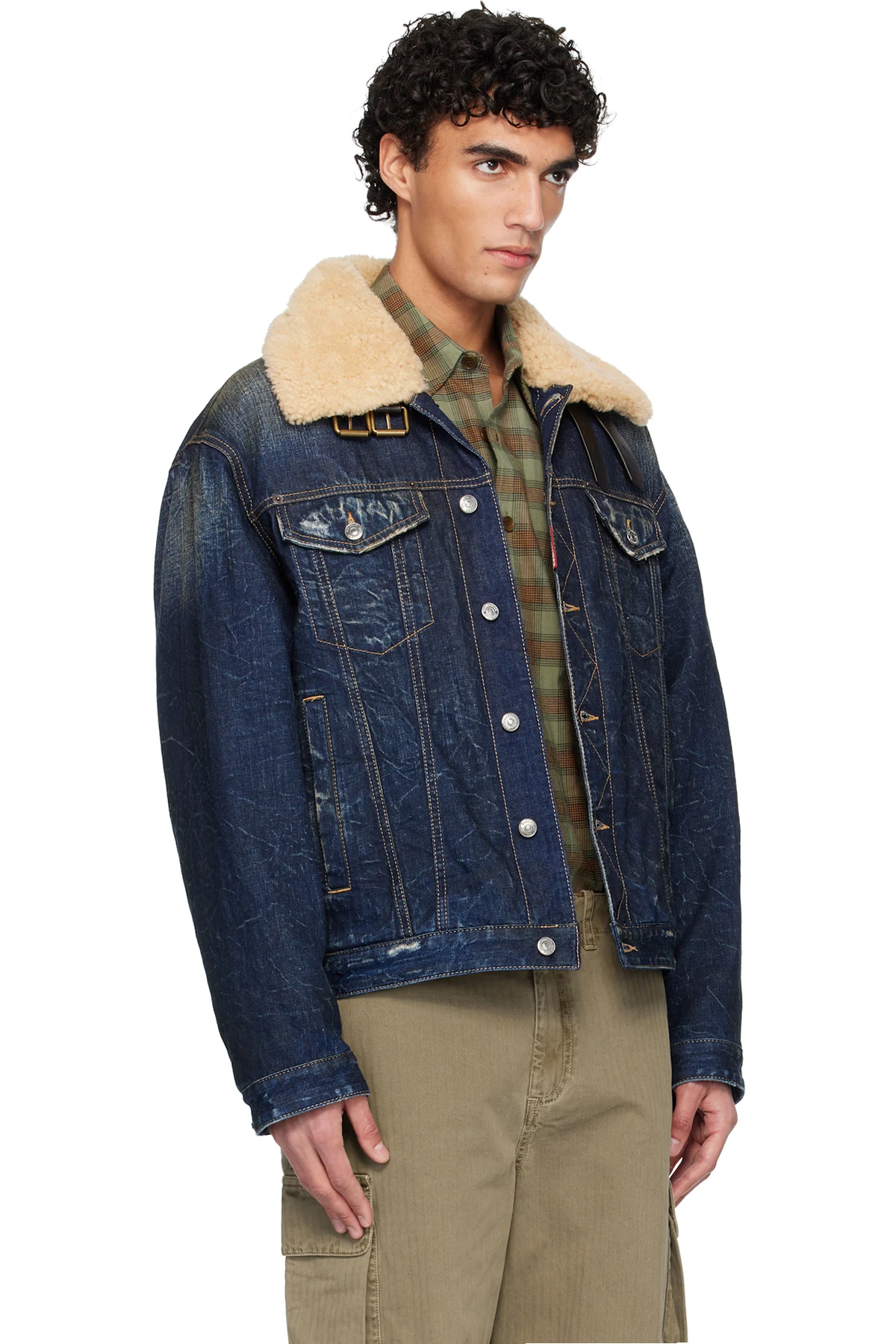 · Shearling trim and pin-buckle fastenings at spread collar