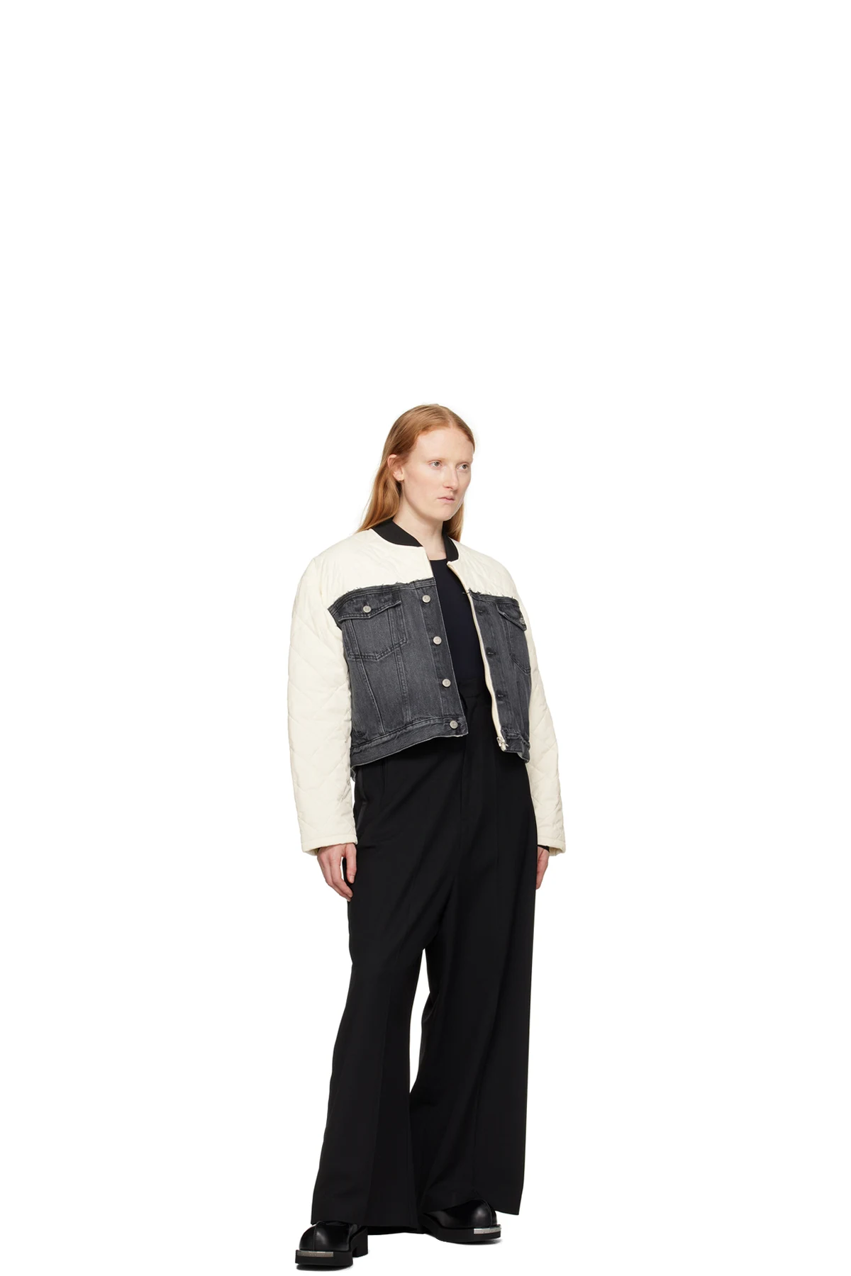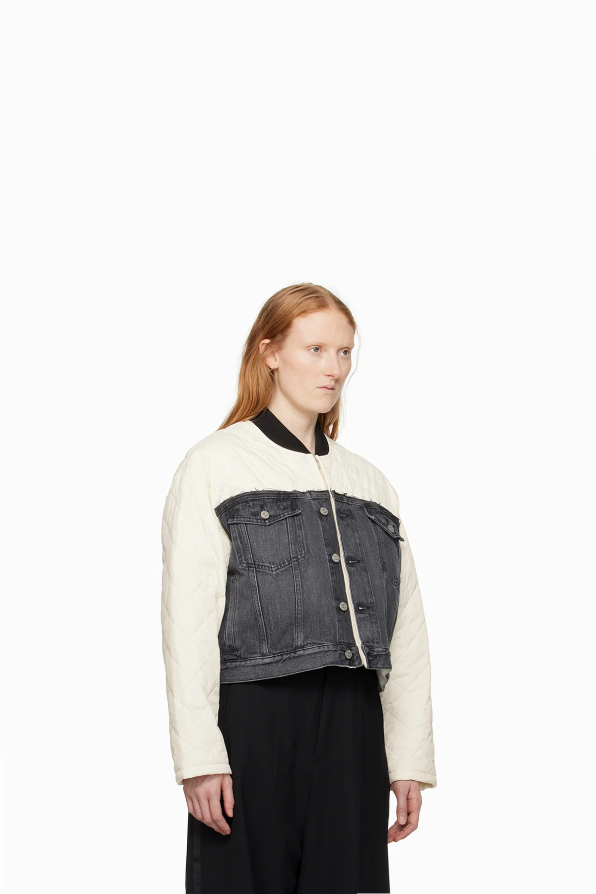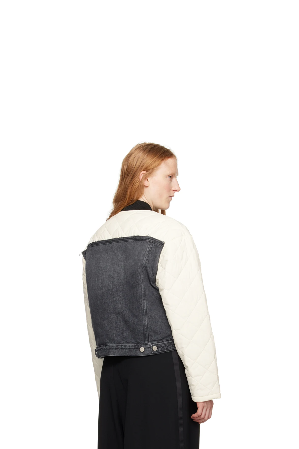 Insulated quilted nylon taffeta and non-stretch denim jacket. Fading and raised seams throughout.