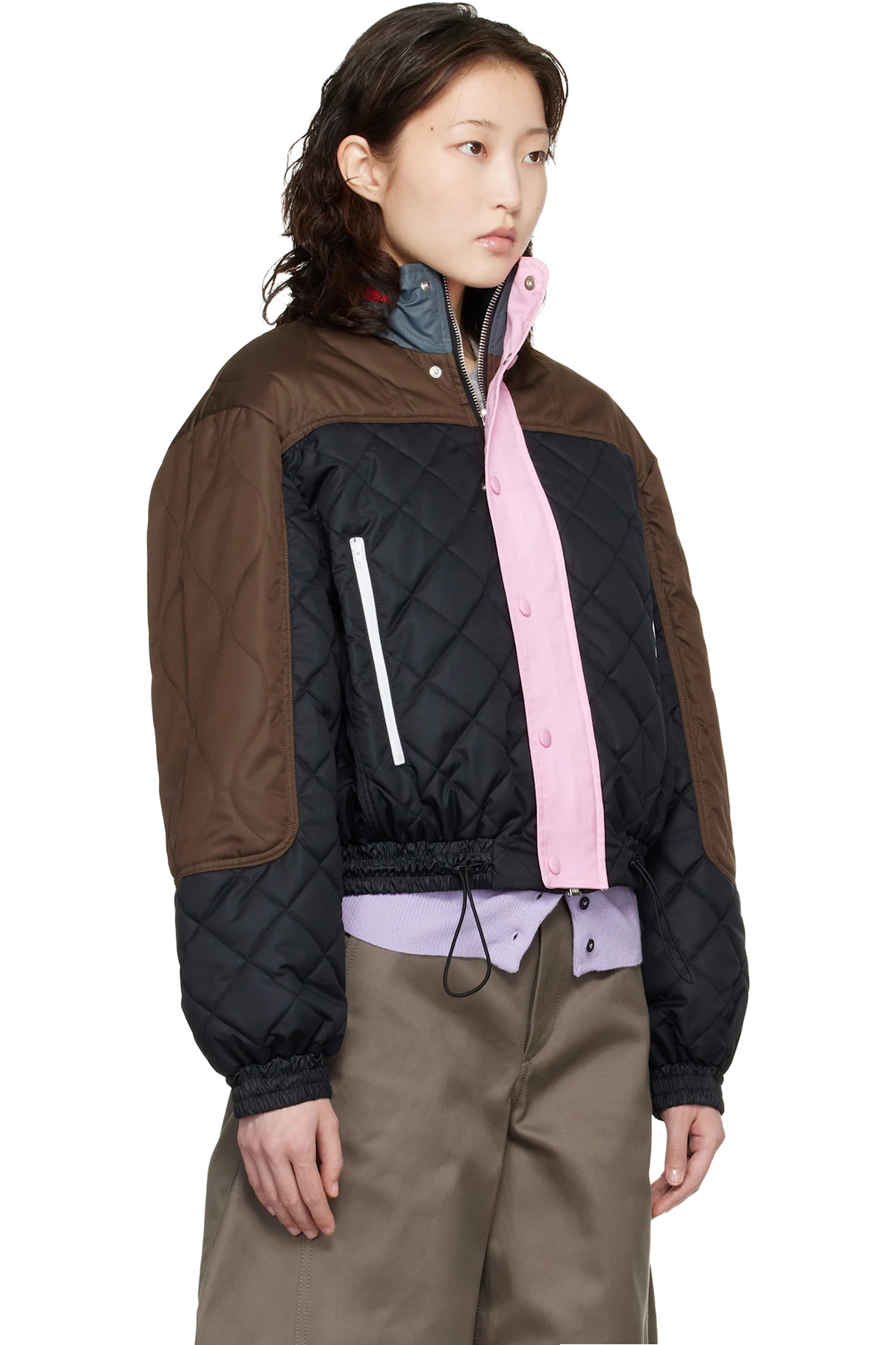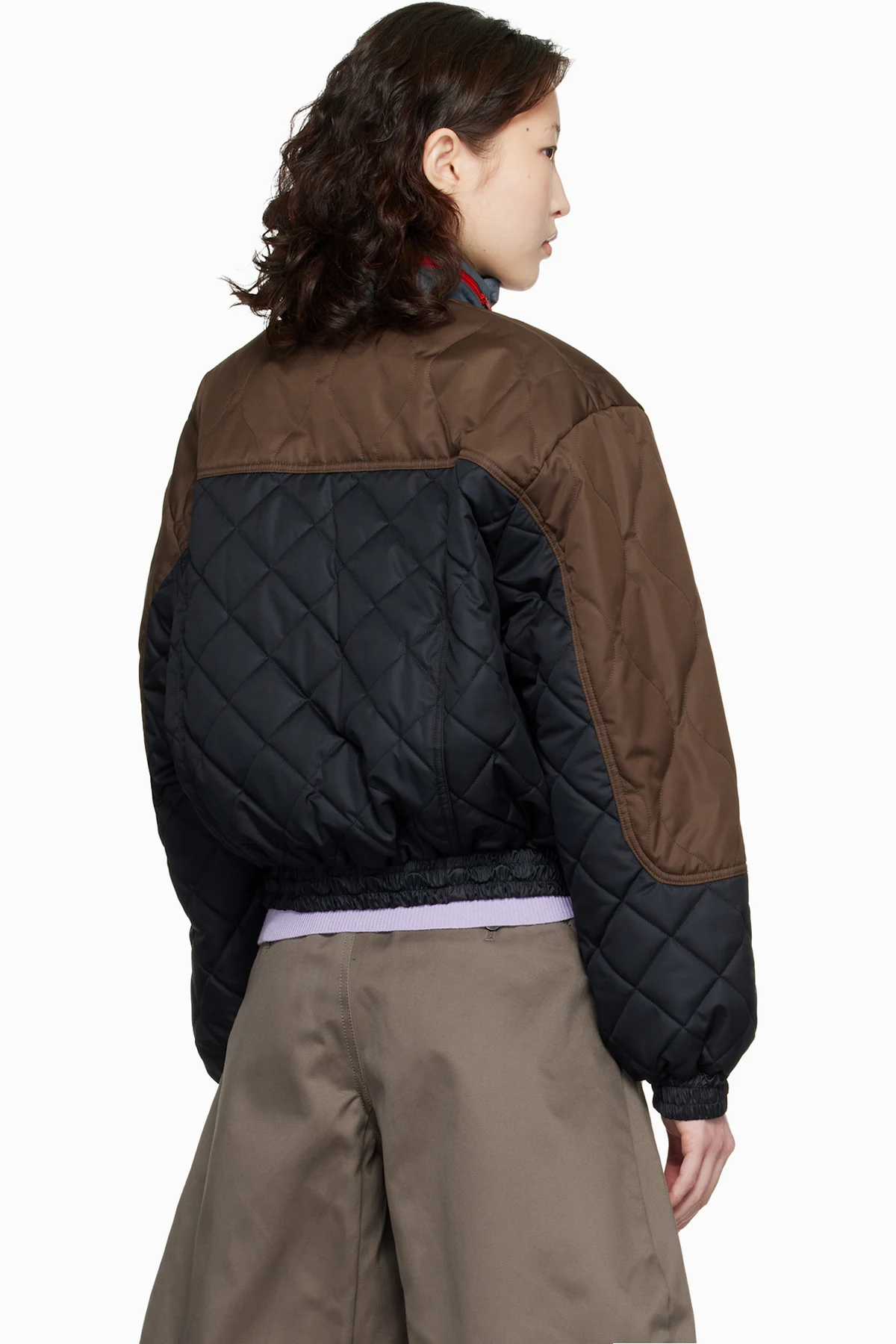 Insulated and quilted nylon satin bomber jacket.