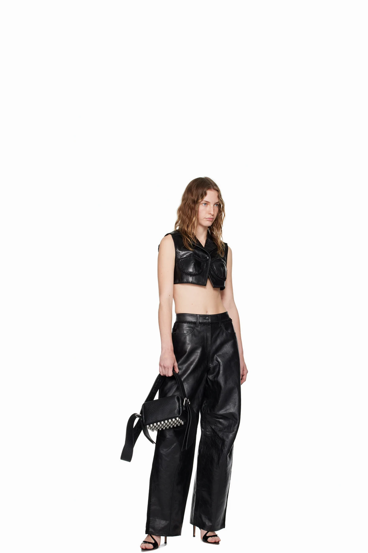 Grained leather vest. Hand-crocheted detailing and darts throughout.